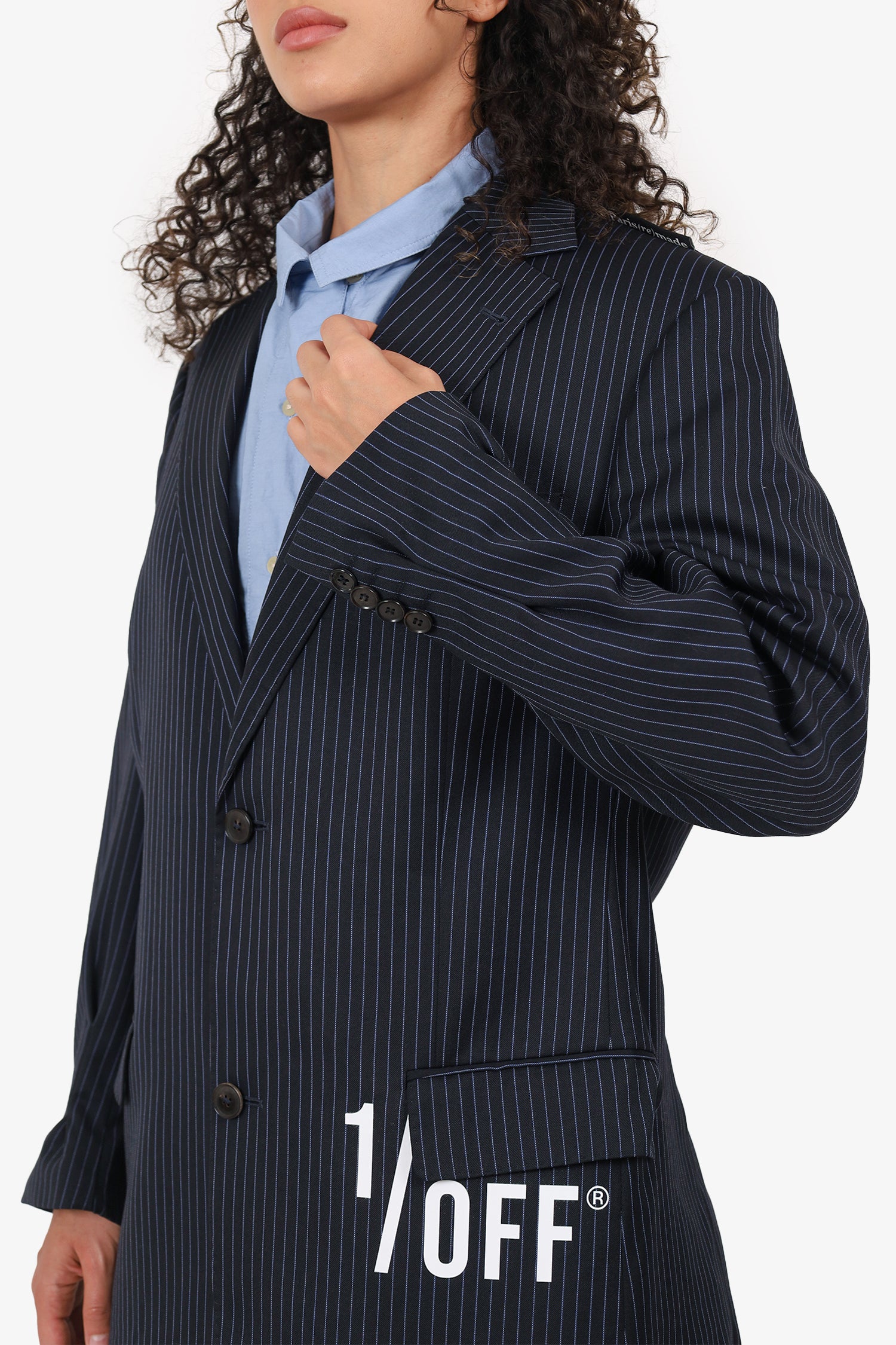 Refresh availability1/Off Paris(re)made Black Striped Double Blazer With Back Button. Pull-on. Notch lapel. Front button-up closure. Sleeve cuffs with button-up closure. 3 exterior pockets; 2 flap and 1 chest slip. Single rear vent. Lined interior. Built-in shoulder pads. Tonal stitching.