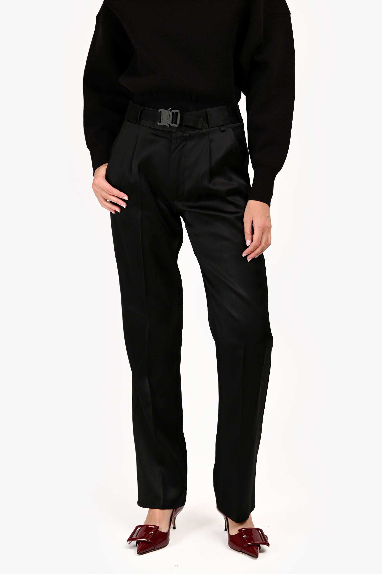 Refresh availability1017 Alyx 9SM Black Satin Pants. Pull-on. Front zip, hook and button closure. Waist belt with buckle closure. 4 exterior pockets; 2 side slip, 2 rear slip with button closure. Silver-tone hardware. Tonal stitching.