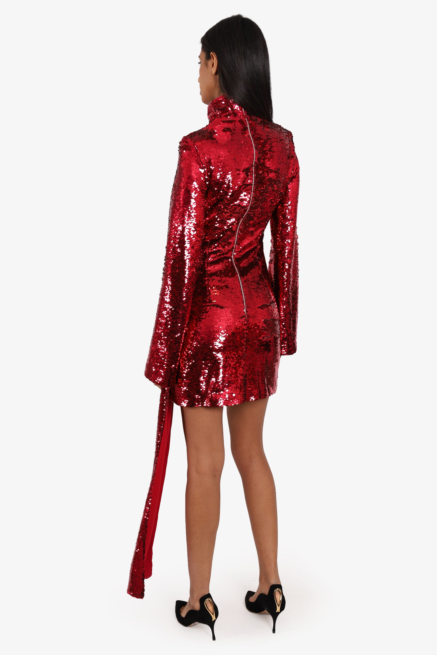 16 Arlington Red Long-sleeve Sequin Dress with Front Cut Out and Long Belt. Rear zip closure. High neckline. Lined. Tonal stitching.