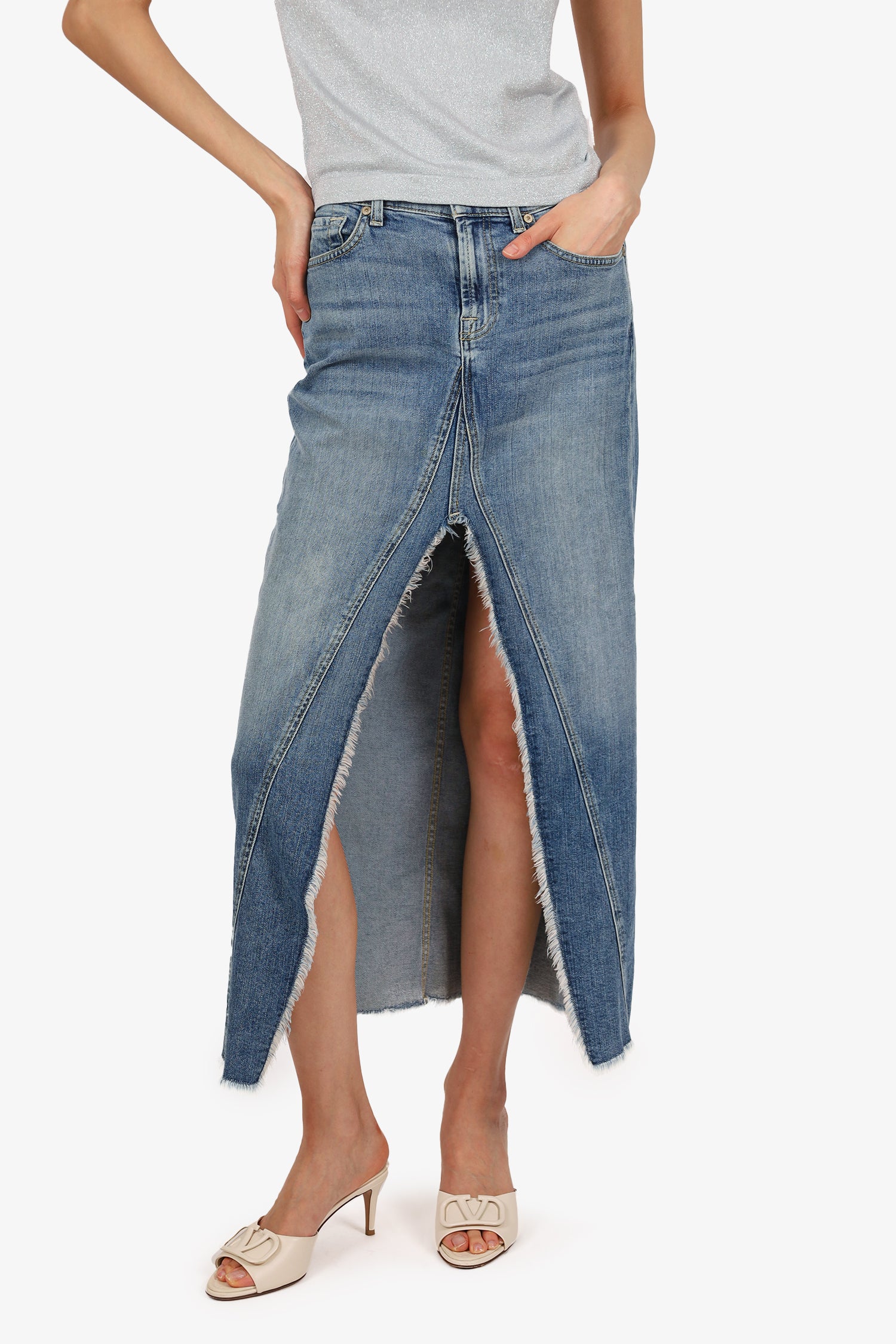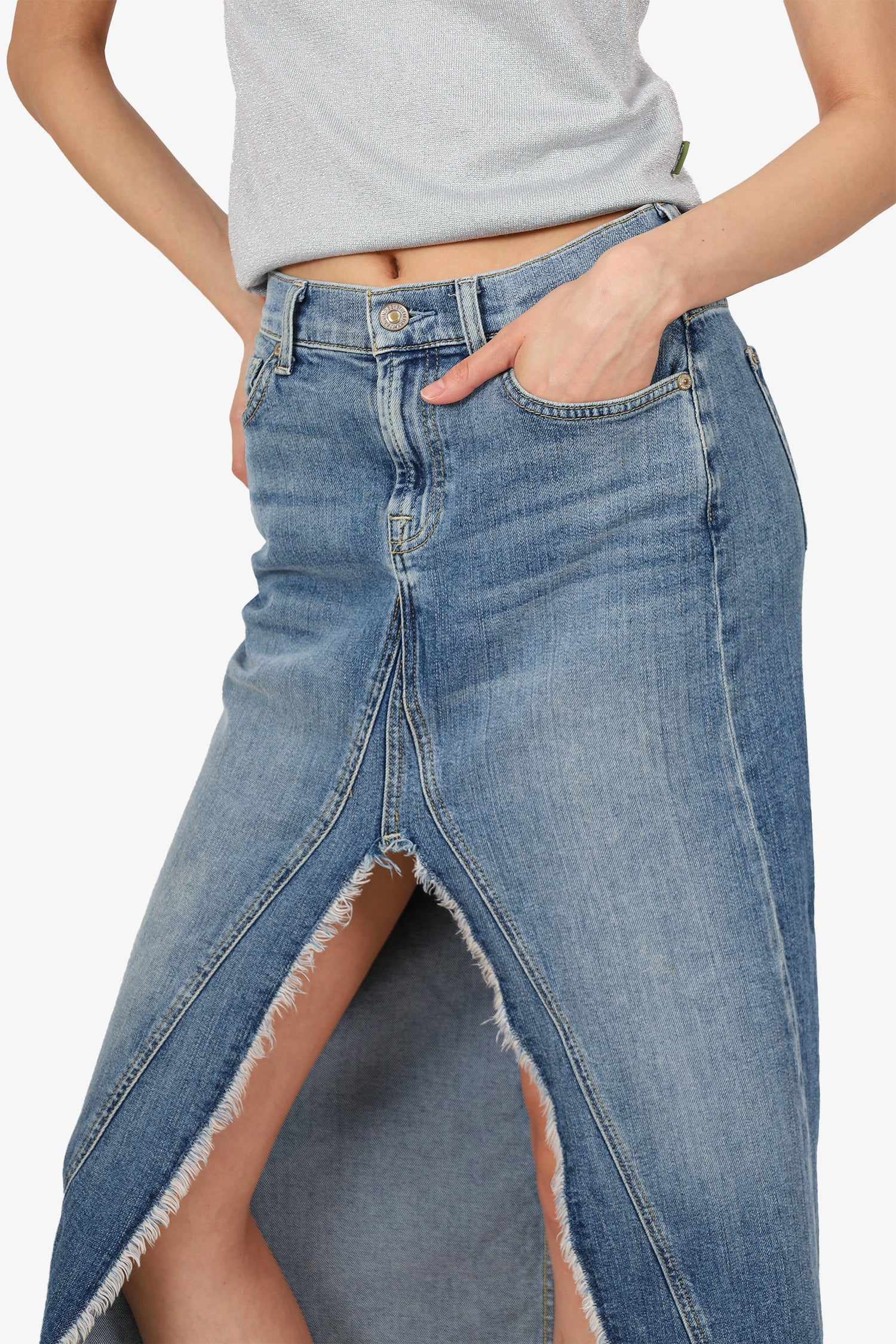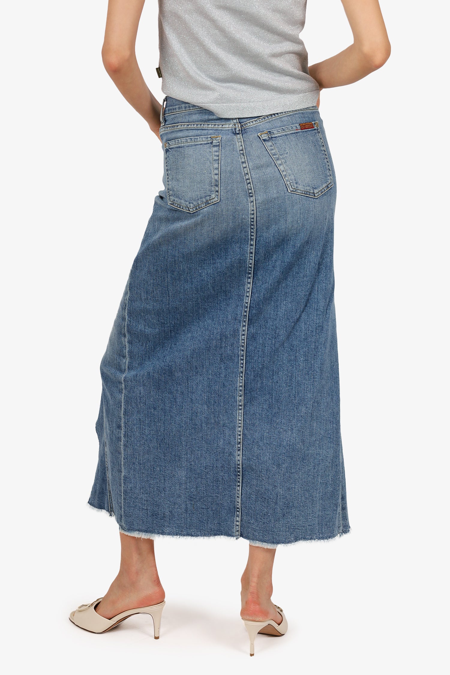 Refresh availability7 For All Mankind Blue Denim Midi Skirt. Slip-on. Front zip with button-up closure. Waistband belt loops. 5 exterior pockets; 2 front side slip and 1 mini compartment, 2 rear slip. Front centre split hem. Silver-tone hardware. Tonal stitching.