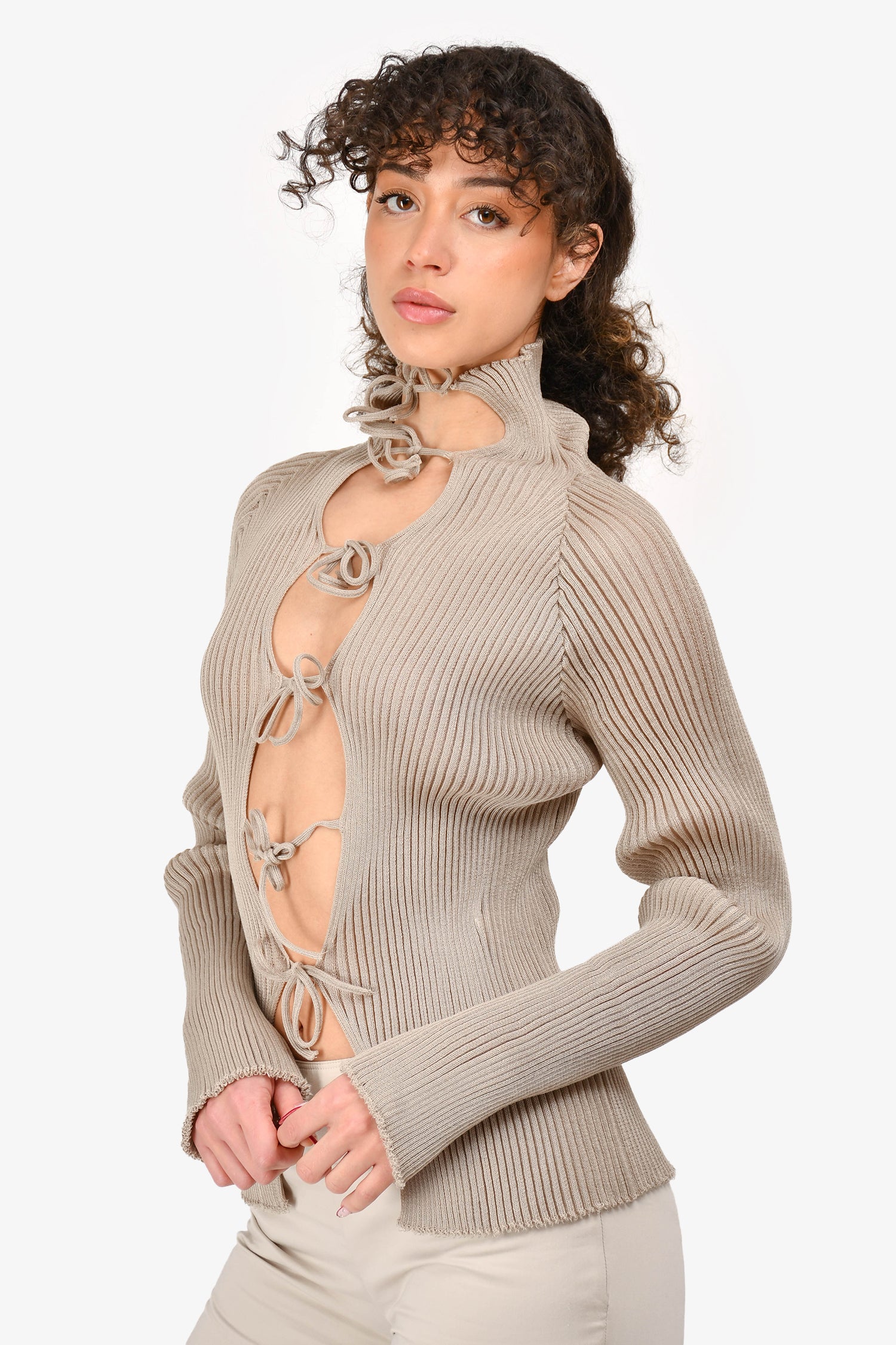 Refresh availabilityA. Roege Hove Taupe Ribbed Knit Open Back High Neck Cardigan. Open front with lace detail closures. Tonal stitching.
