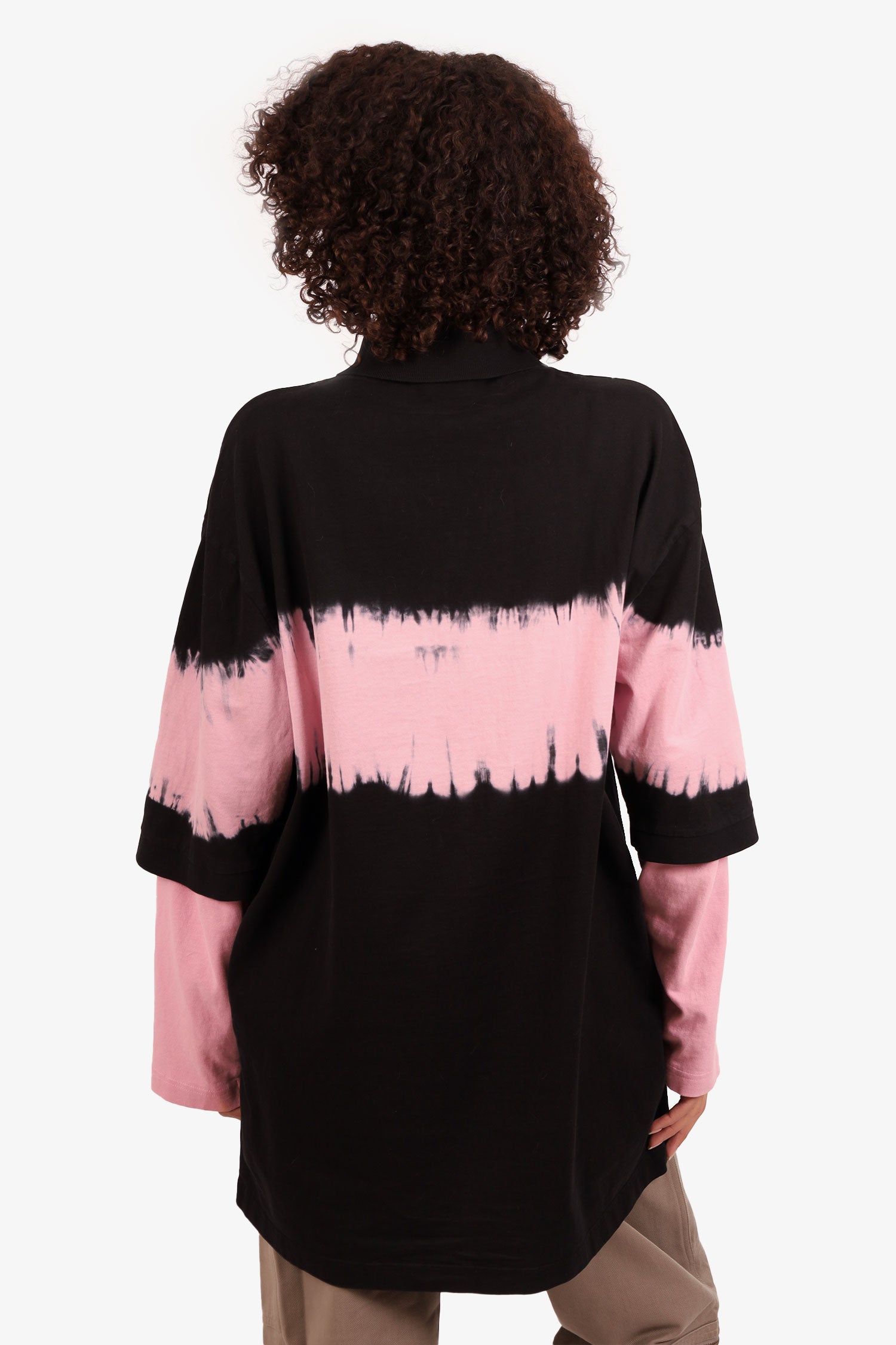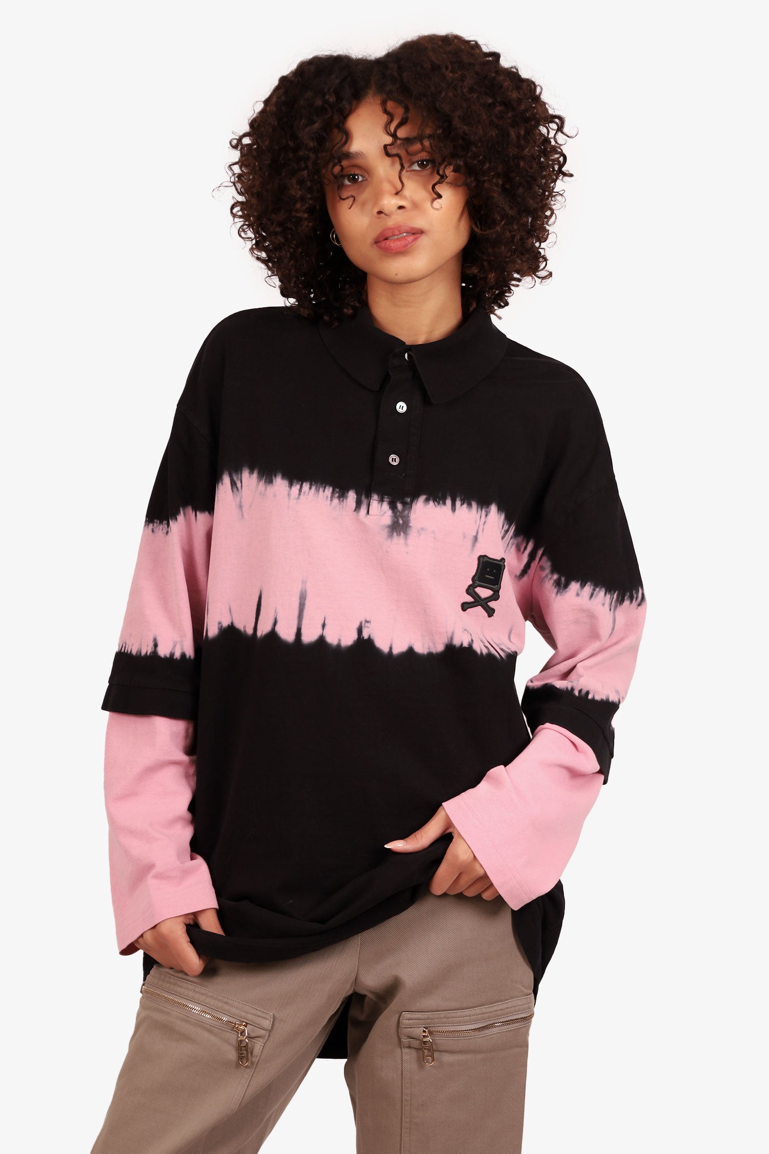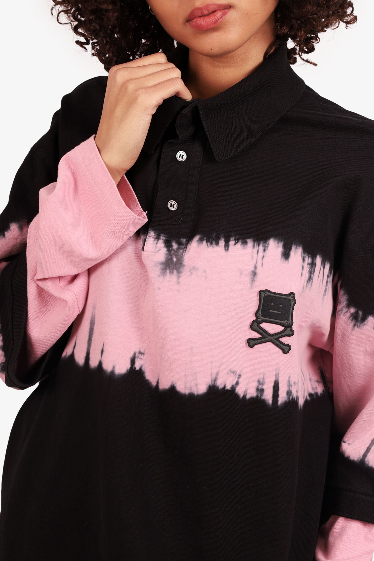Refresh availabilityAcne Black/Pink Tie Dye Long Sleeve Oversized Top. Pull-on. Collared-neckline. Front button-up closure. Built-in layered long sleeves. Logo on left exterior chest. Tonal stitching.