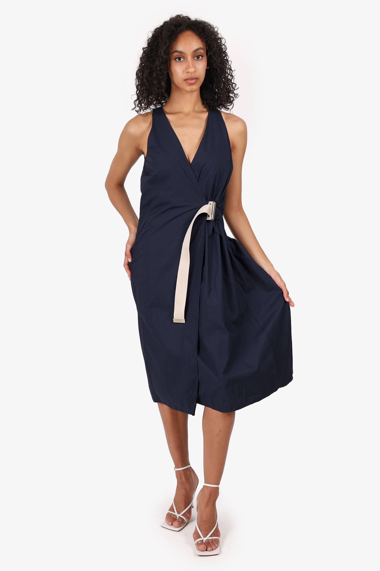 Refresh availabilityAcne Black Sleeveless Buckle Belt Midi Dress. Slip-on. V-neckline. Interior button-up closure. Built-in adjustable belt at waistline. Silver-tone hardware. Tonal stitching.