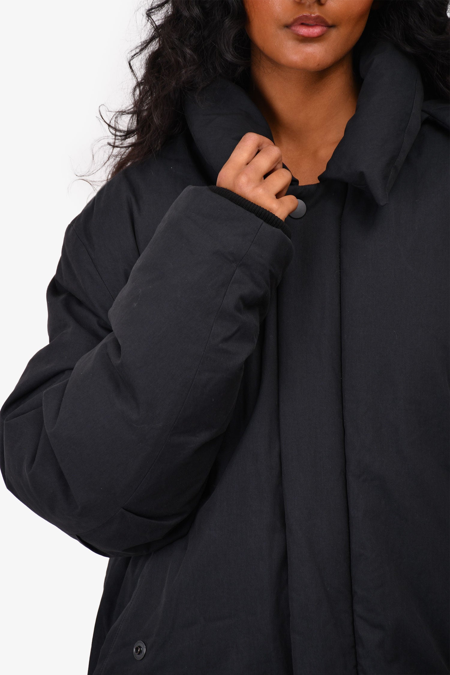 Refresh availabilityAcne Studios Black Down Long Puffer Jacket. Front zip-up closure with snap-on buttons. Black-tone hardware. Two front pockets with snap-on button closure. Tonal stitching.