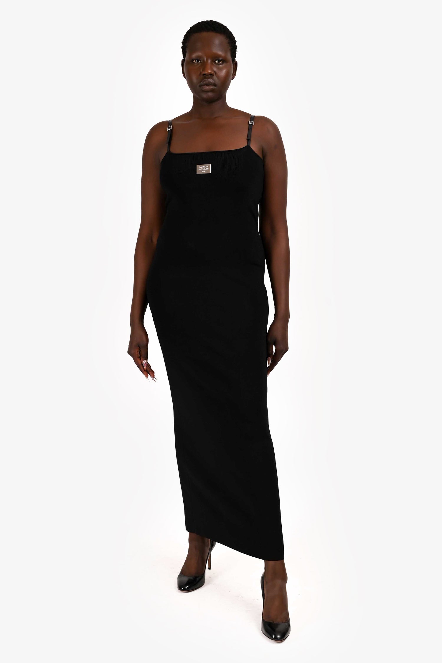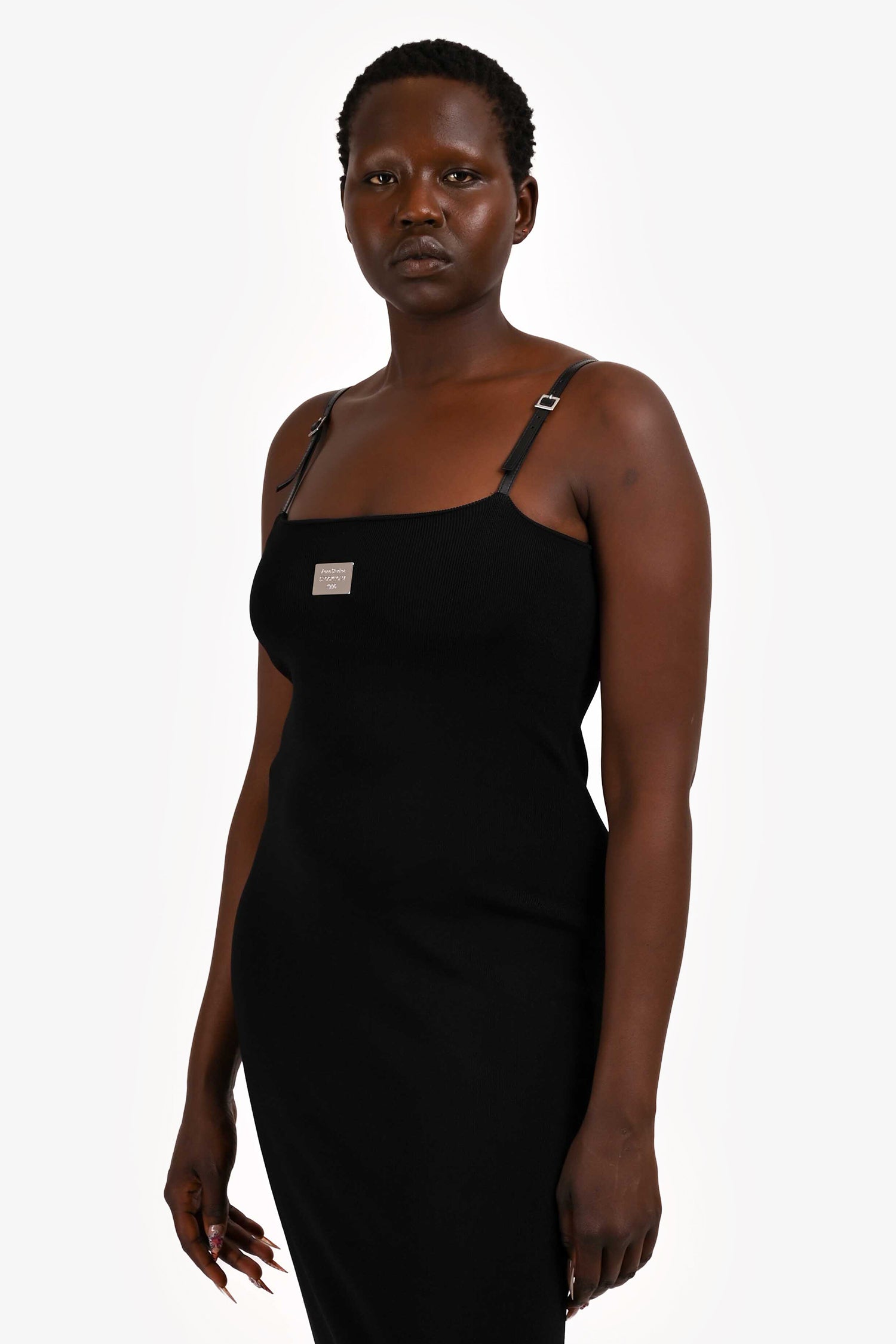 Refresh availabilityAcne Studios Black Ribbed Silver Logo Leather Strap Maxi Dress. Square neckline. Sleeveless design. Ribbed stretch fabric. Maxi length. Tonal stitching.