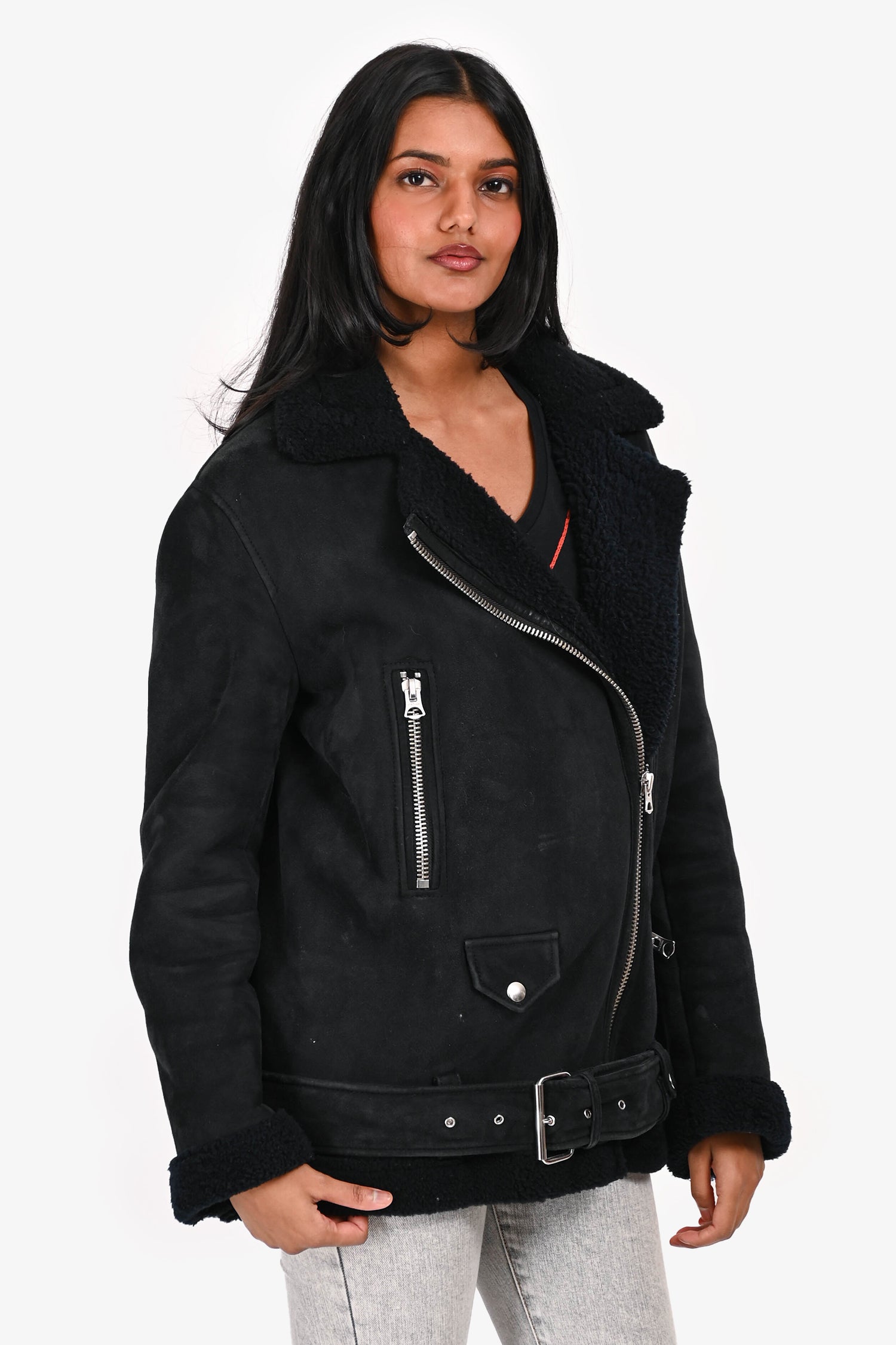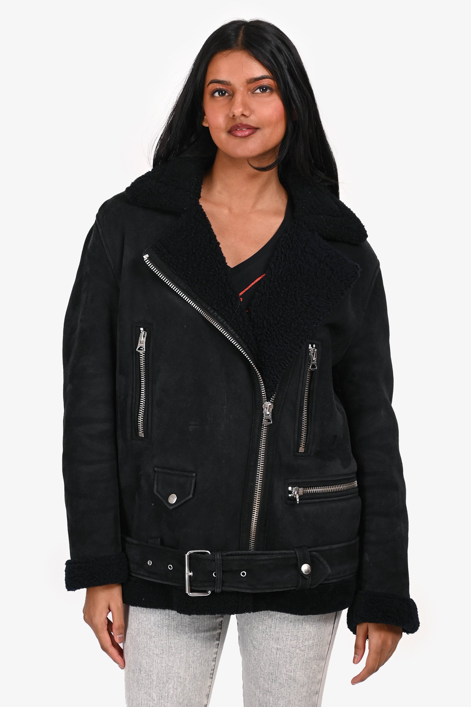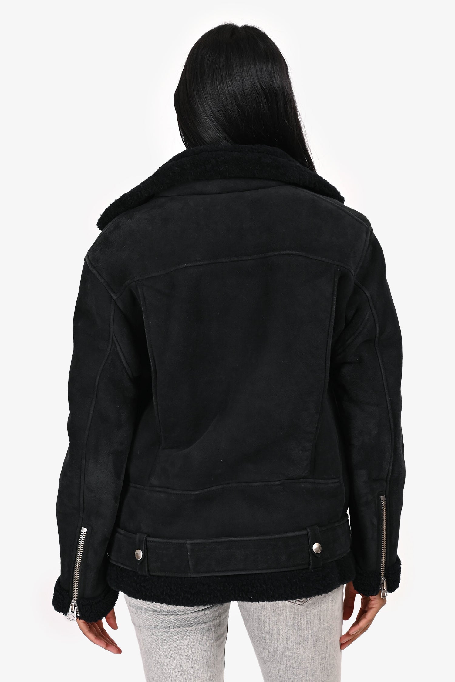 Refresh availabilityAcne Studios Black Suede/Shearling Lined Jacket. Pull-on. Front zip closure. Front zip pockets. 2 front zip pockets. Strap with buckle closure on the hem. Silver-tone hardware. Tonal stitching.
