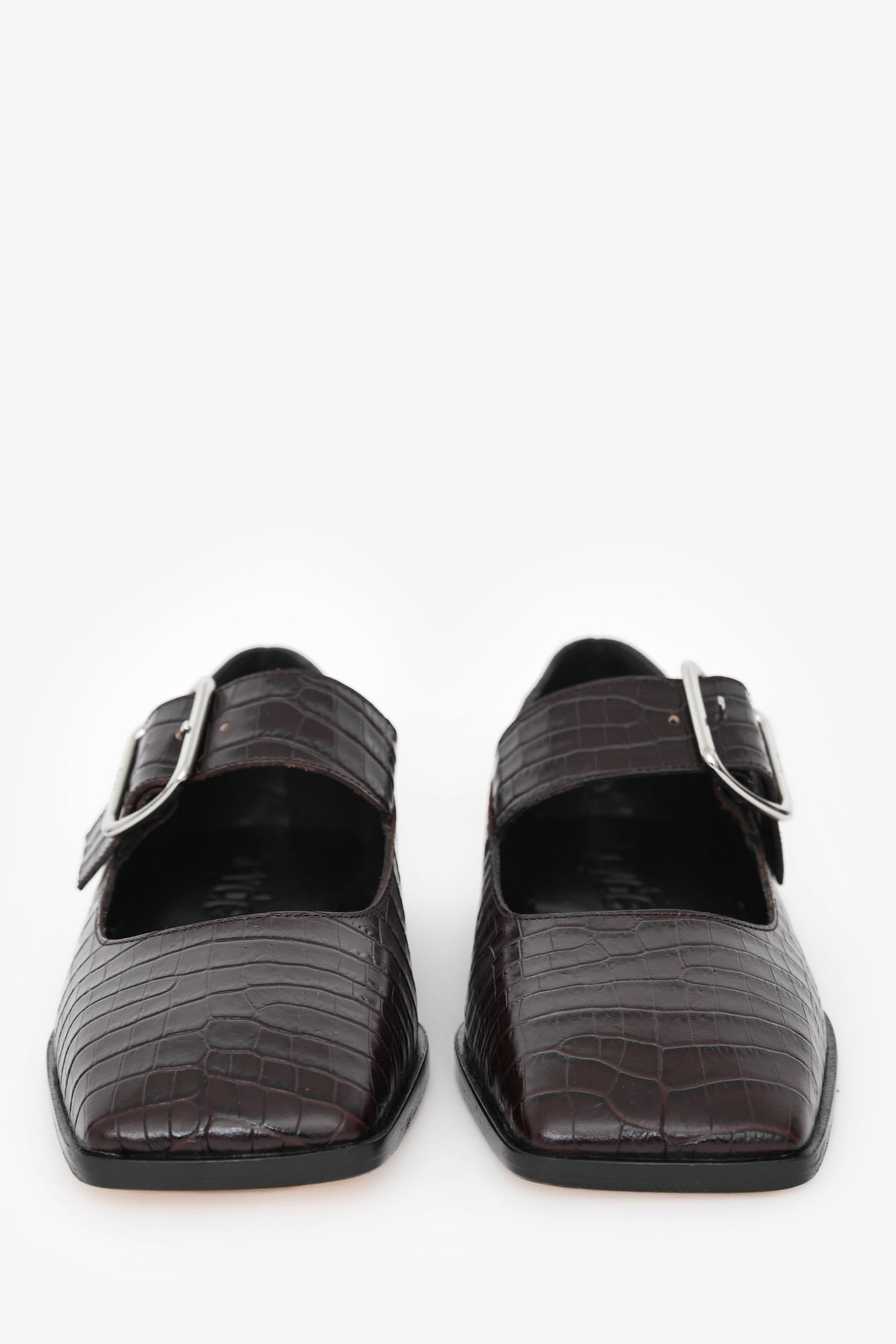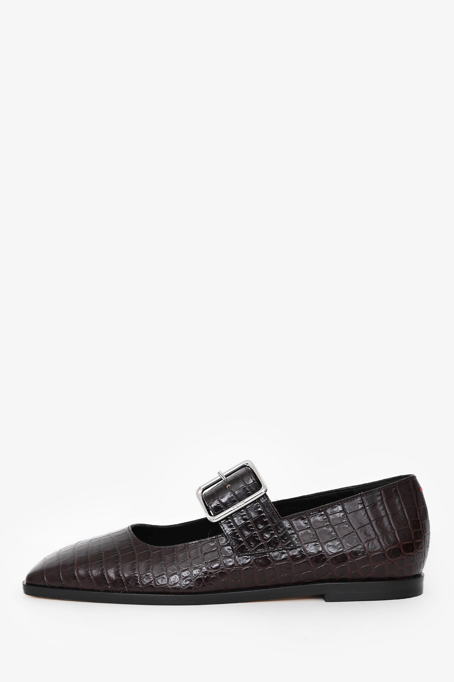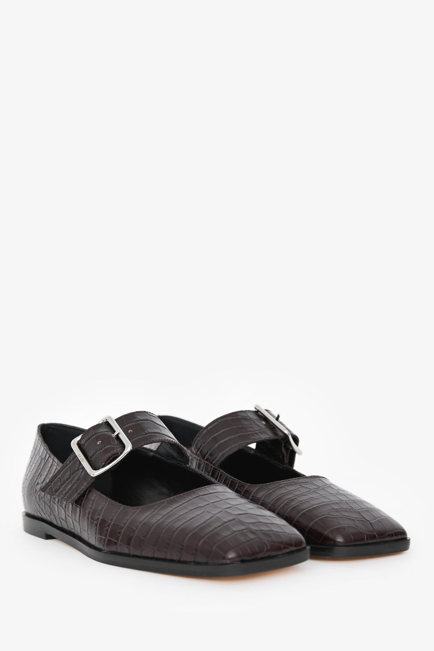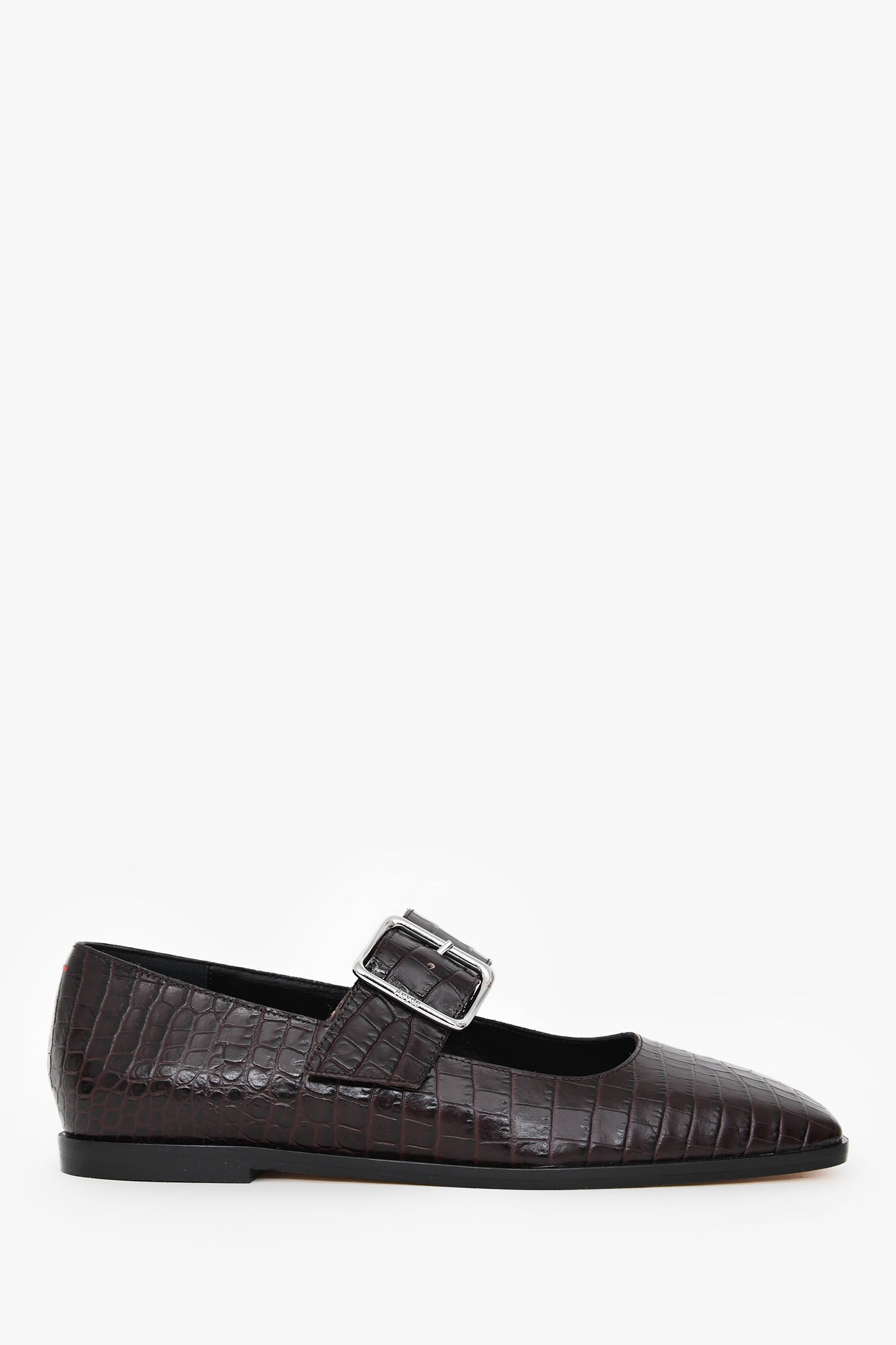 Refresh availabilityAeyde Brown Croc Embossed Square Toe Mary Jane Flats. Slip-on. Square toe. Strap with buckle closure. Silver-tone hardware. Tonal stitching.