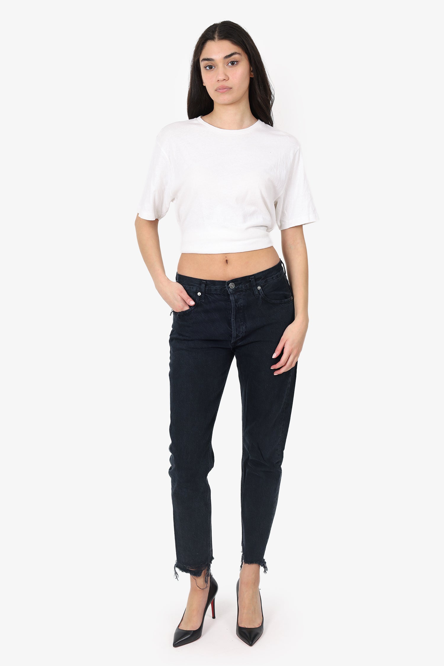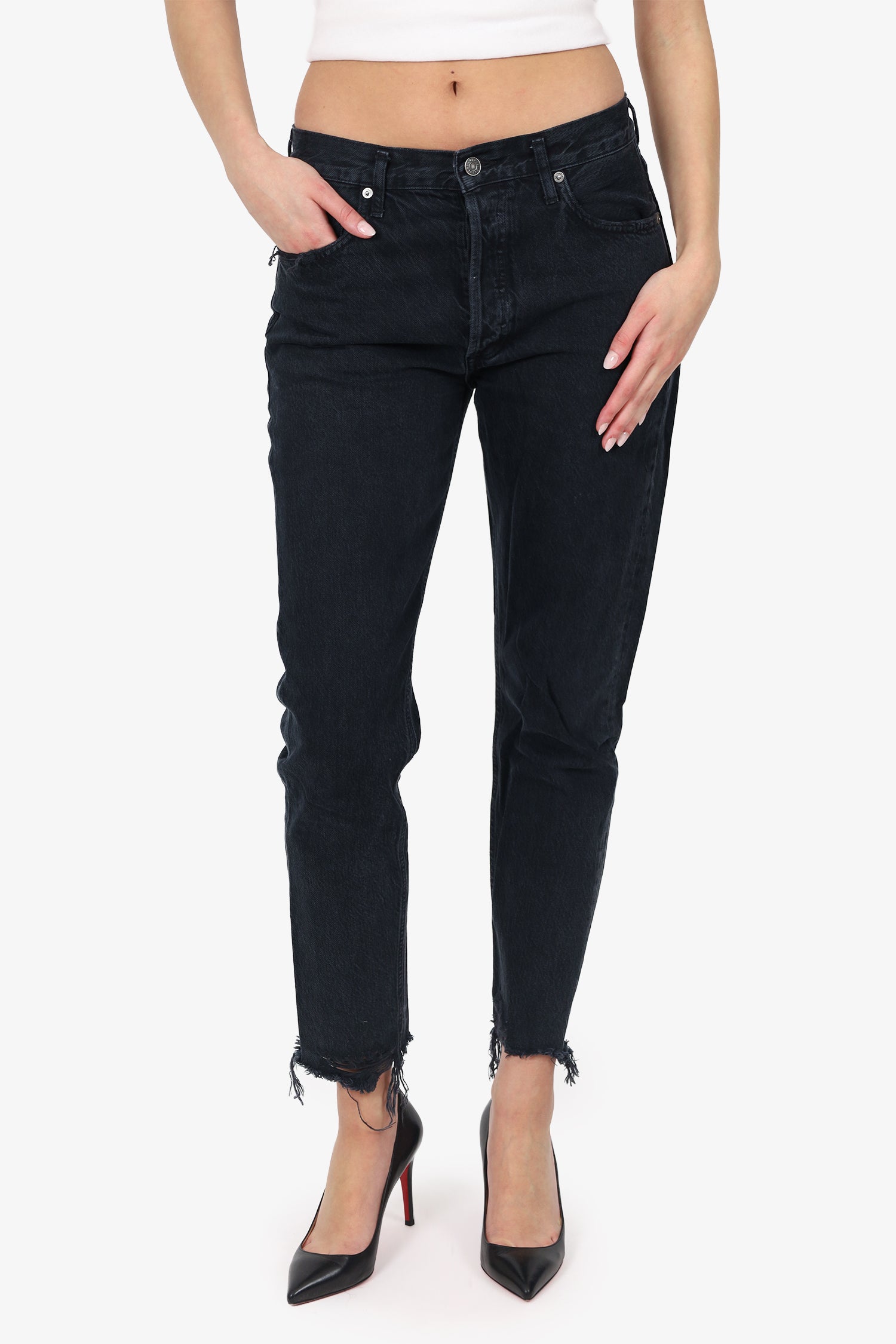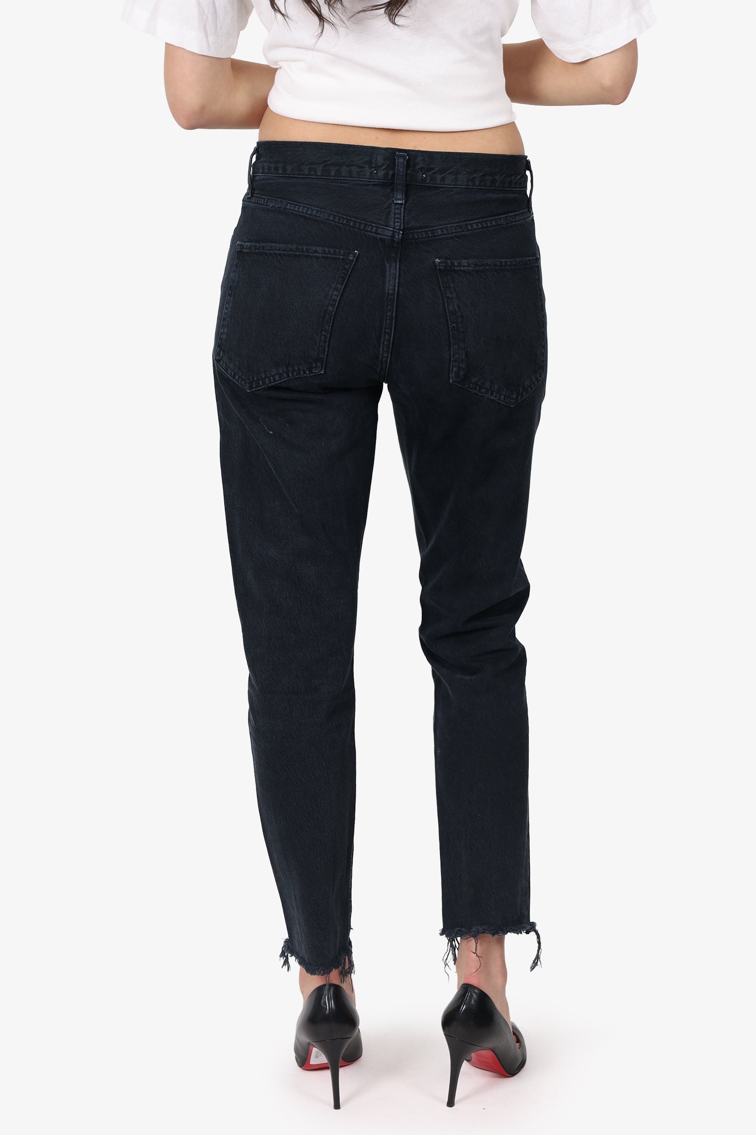 Refresh availabilityAgolde Black 'Jamie' Jeans. Pull on. Front button-up closure. Waistband belt-loops. 5 exterior pockets; 2 front slip, 1 mini compartment, and 2 rear slip. Silver-tone hardware. Tonal stitching.