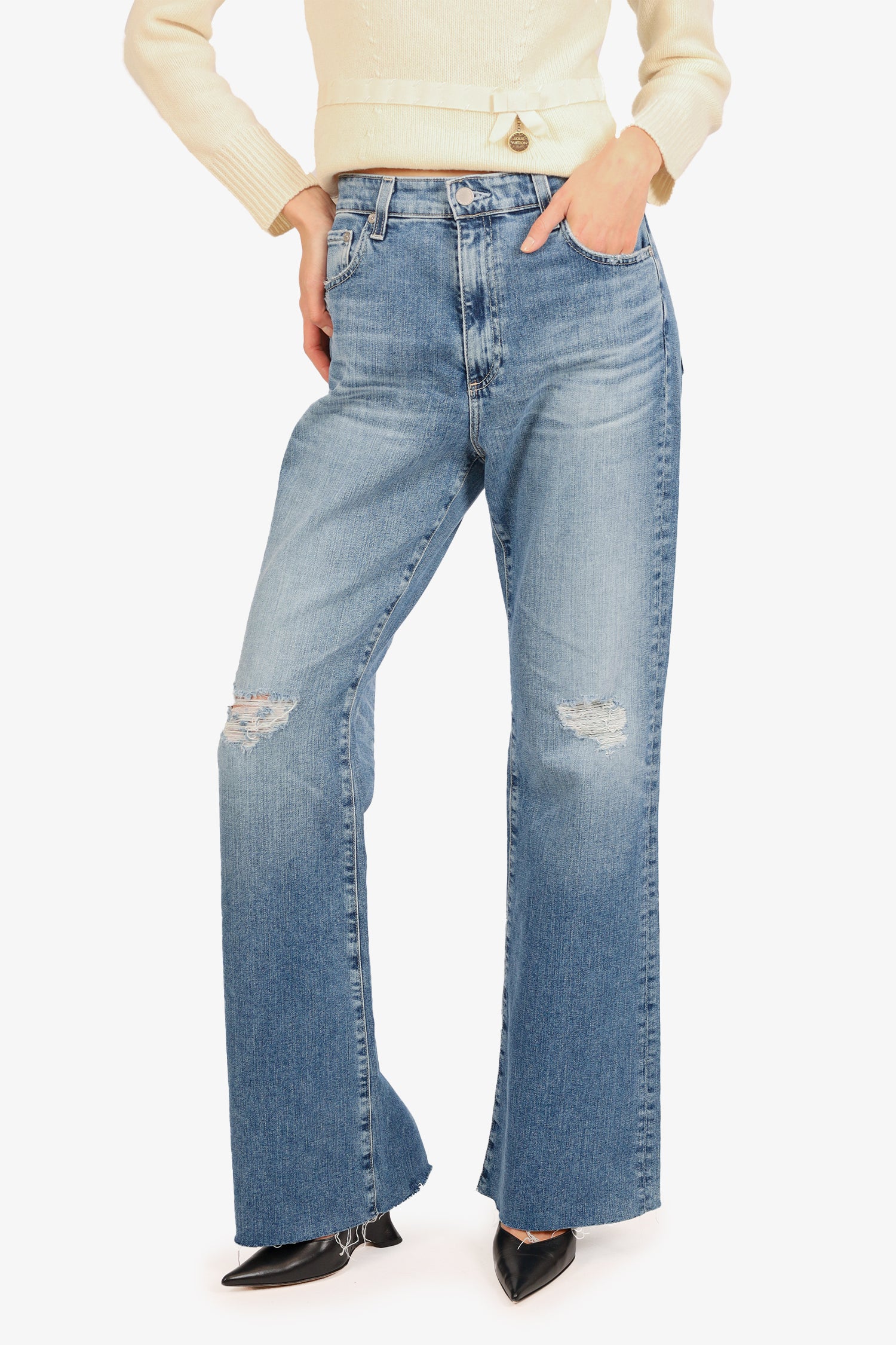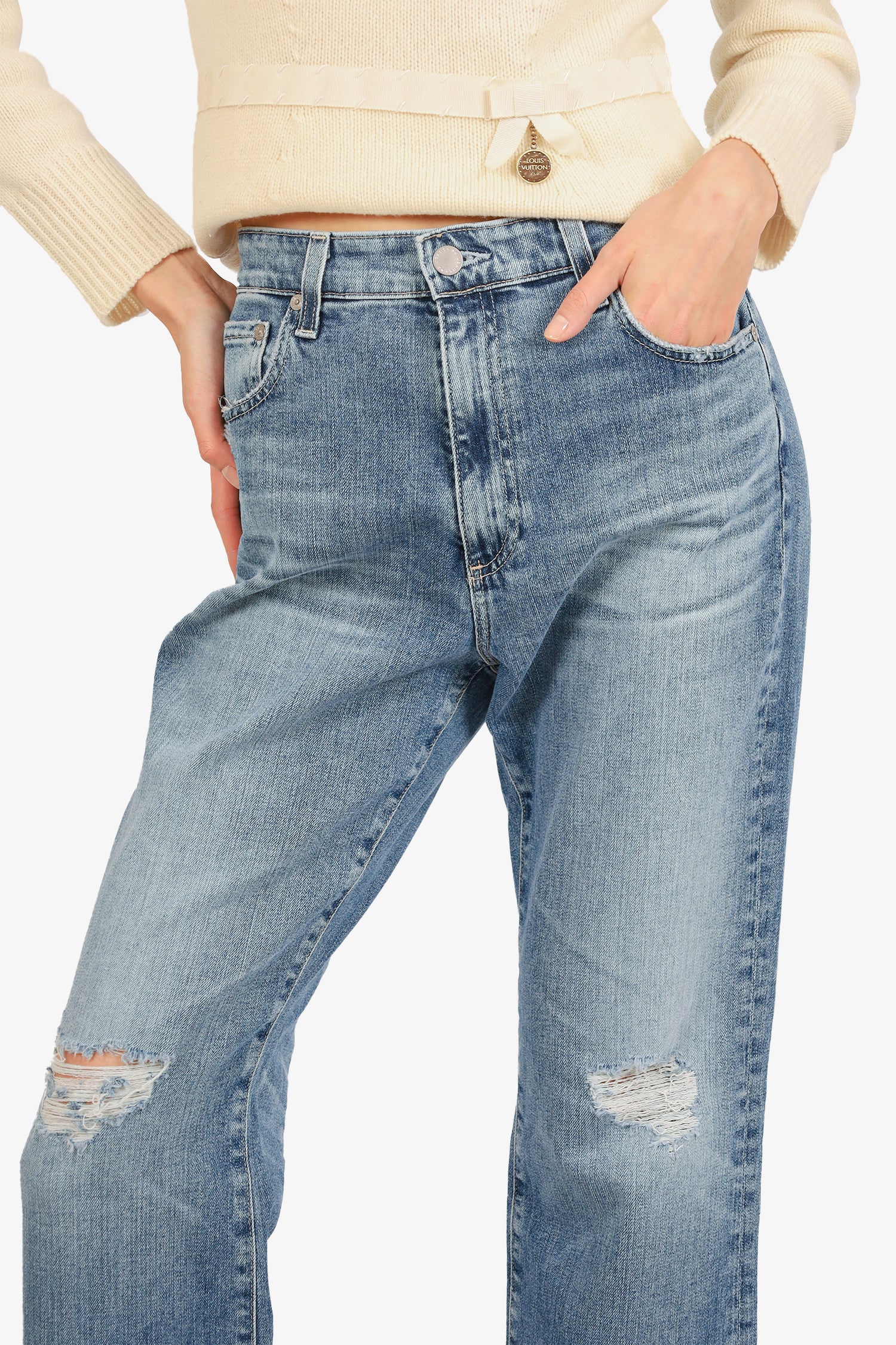 Refresh availabilityAgolde Blue Denim Alexxis Boot Jeans. Front zip and button-up closure. 3 front slip pockets. 2 rear slip pockets. Silver-tone hardware. Tonal and contrast stitching.