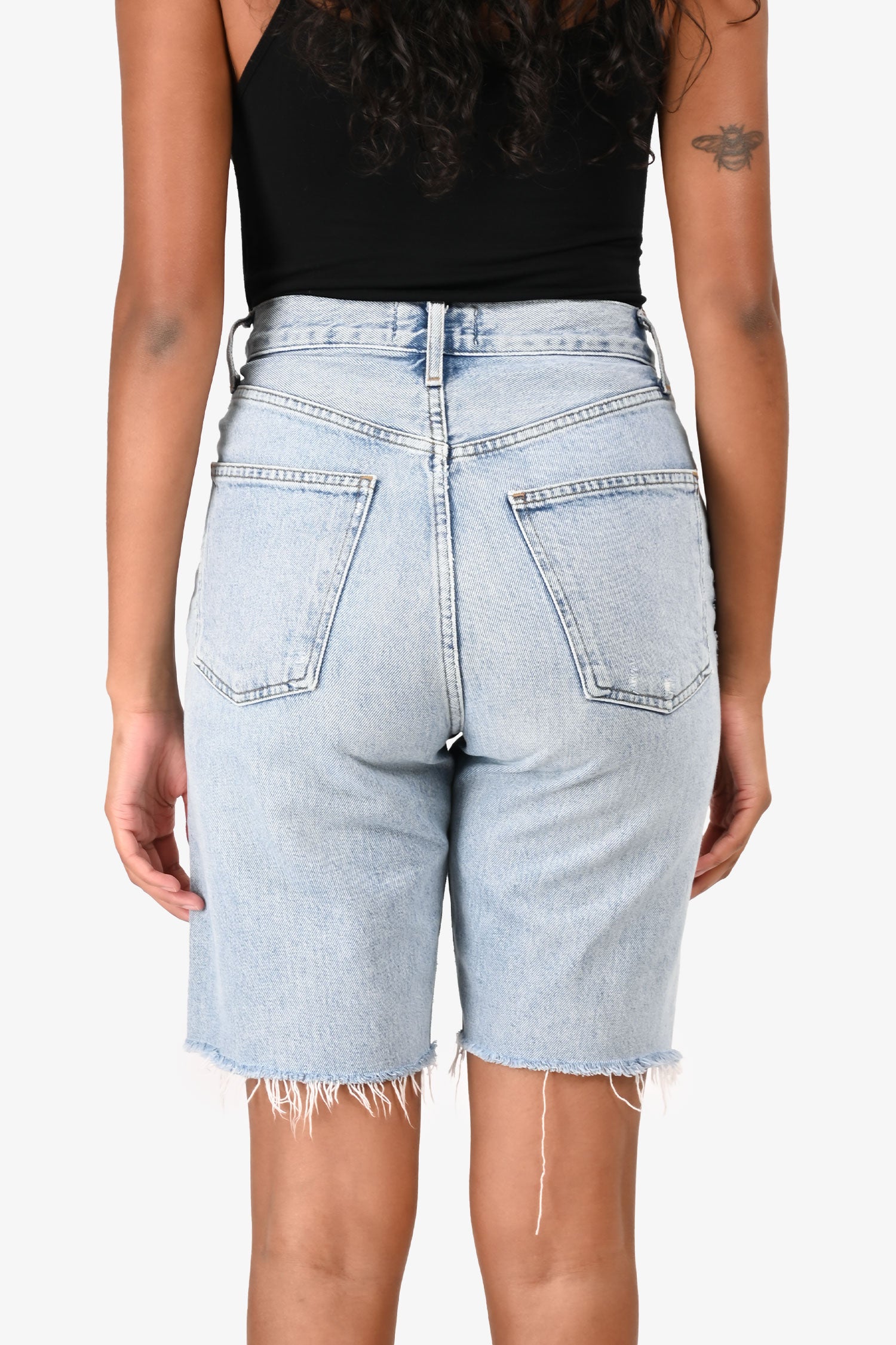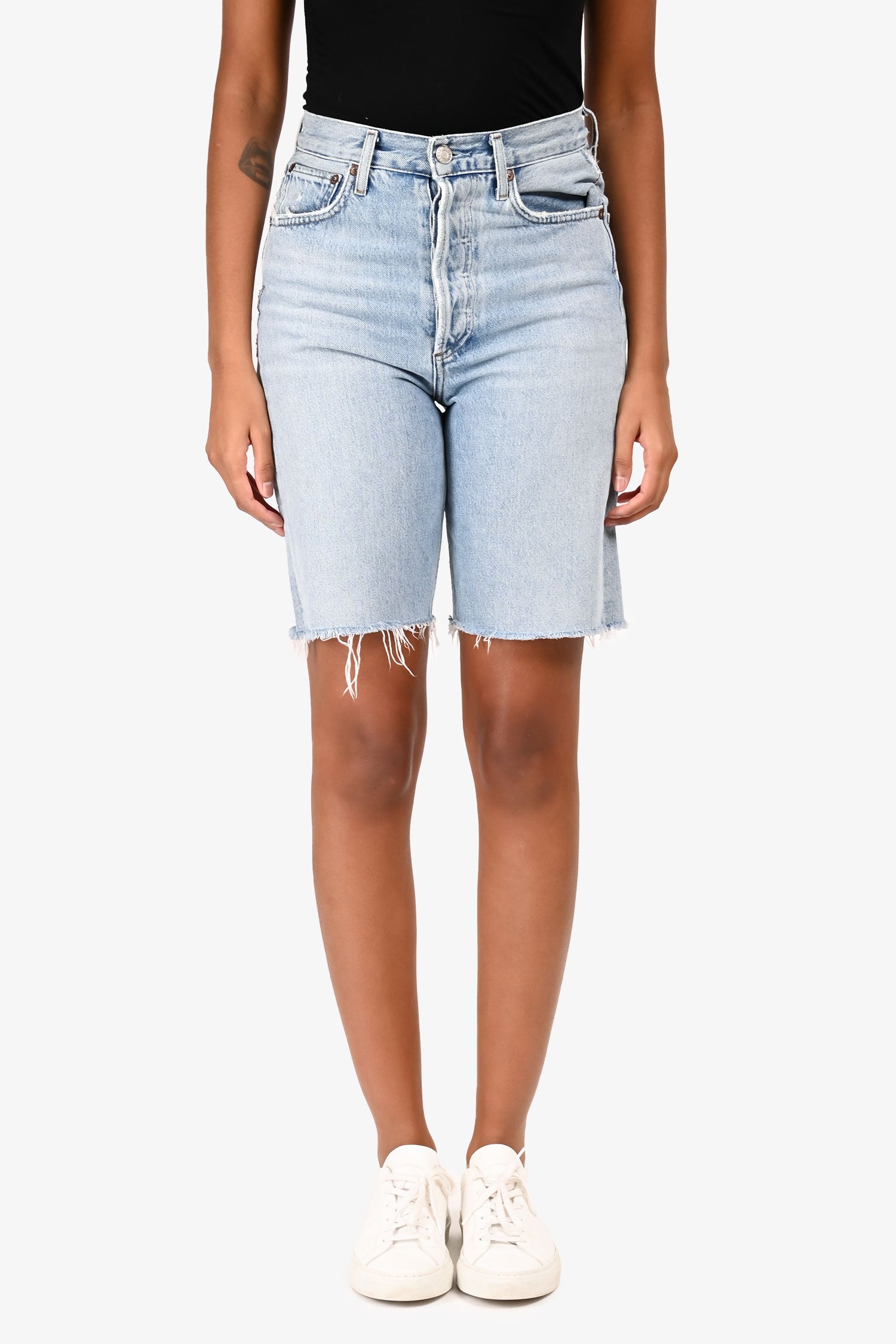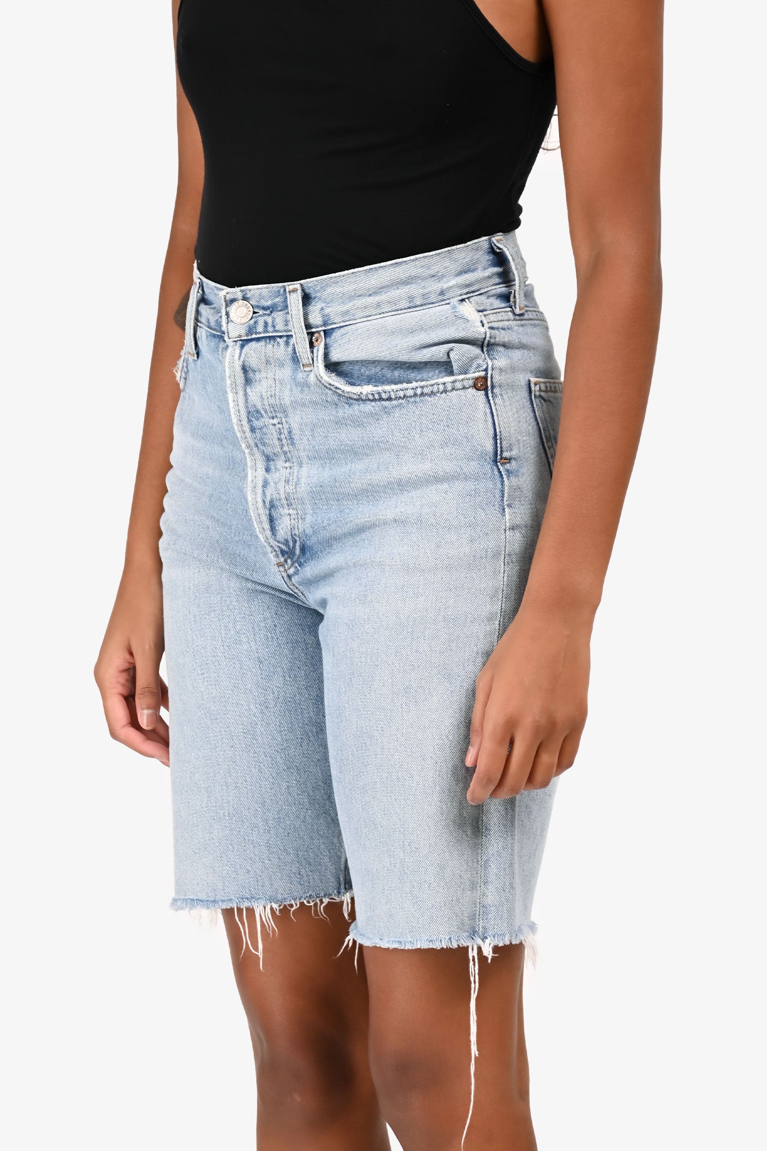Refresh availabilityAgolde Blue Denim Distressed Shorts. Hidden button fly closure. Two front pockets, one with a slip pocket. Two back pockets. Raw short hem. Silver-tone hardware. Tonal stitching.