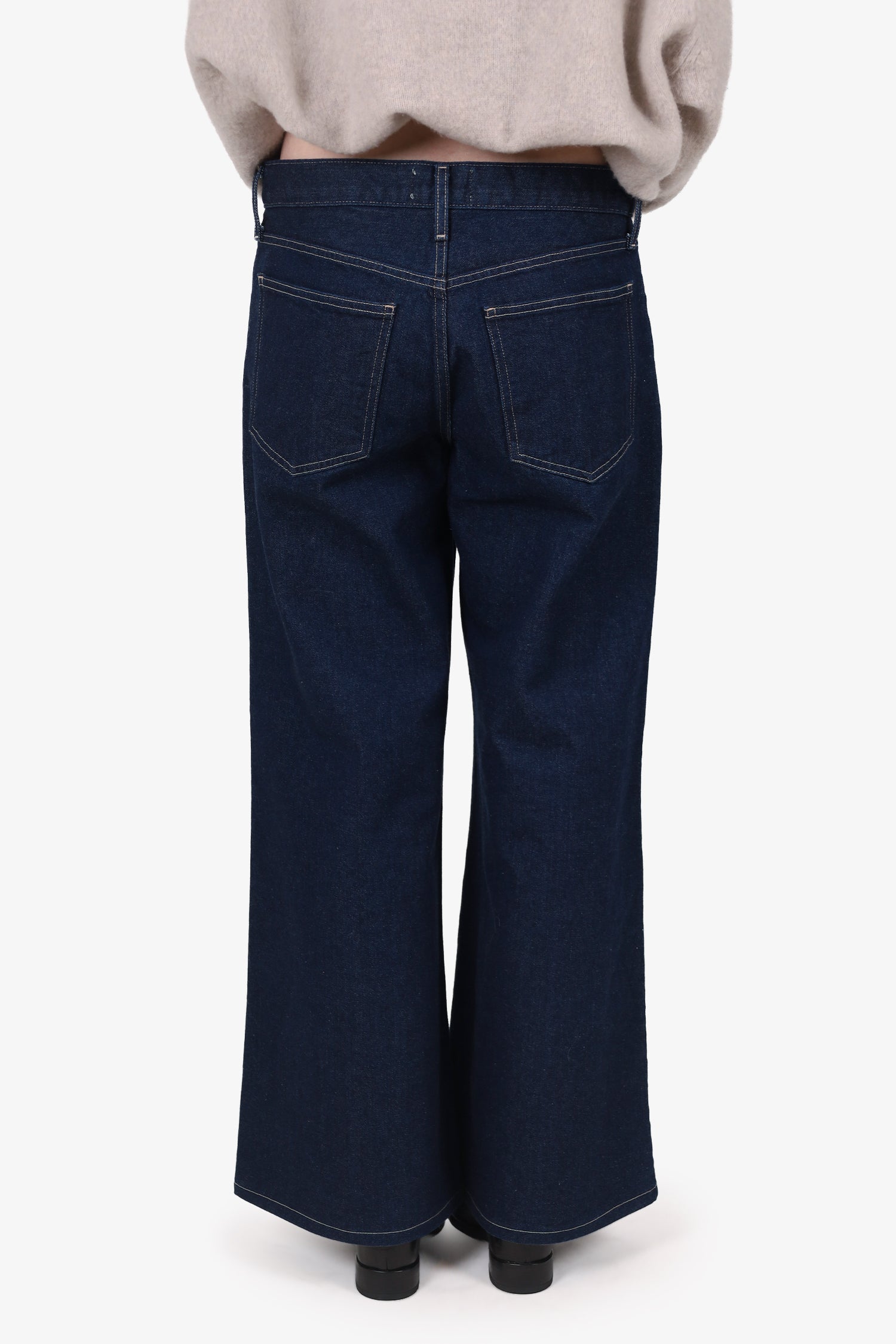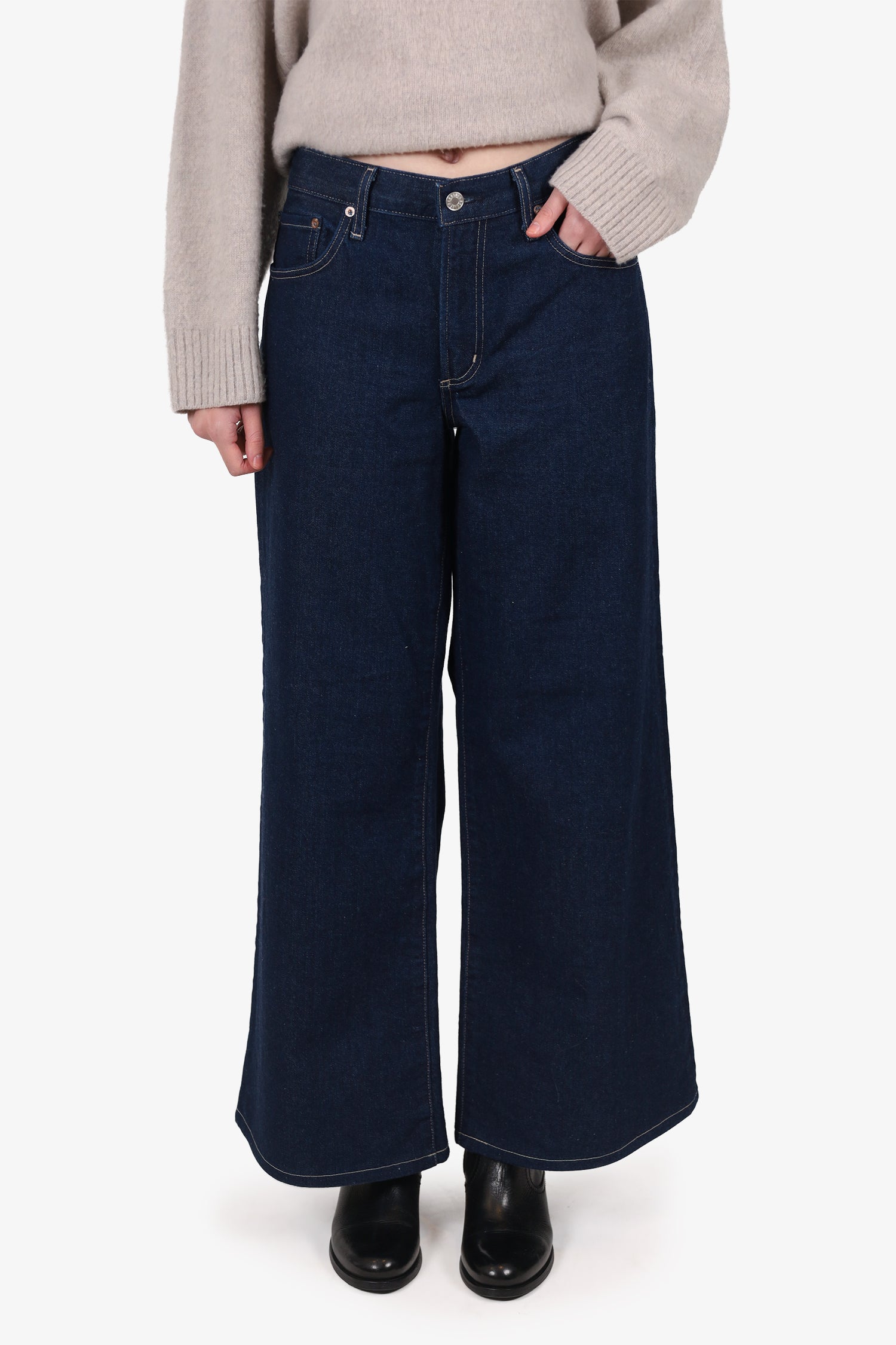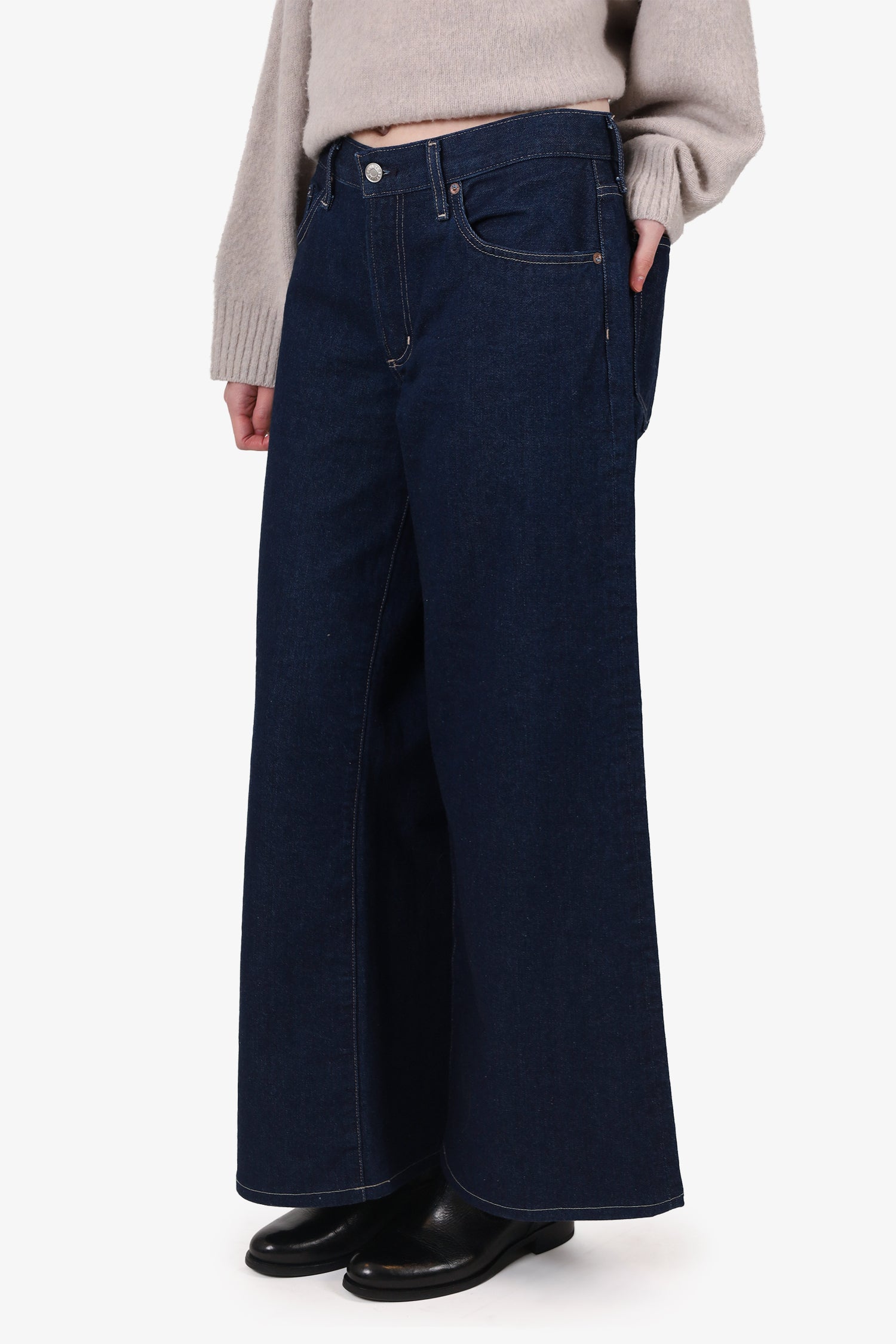 Refresh availabilityAgolde Dark Blue Wide Leg Jeans. Slip on. Front zip and button-up closure. Waistband belt loops. 4 exterior slip pockets; 2 side and 2 rear. Contrast and tonal stitching.