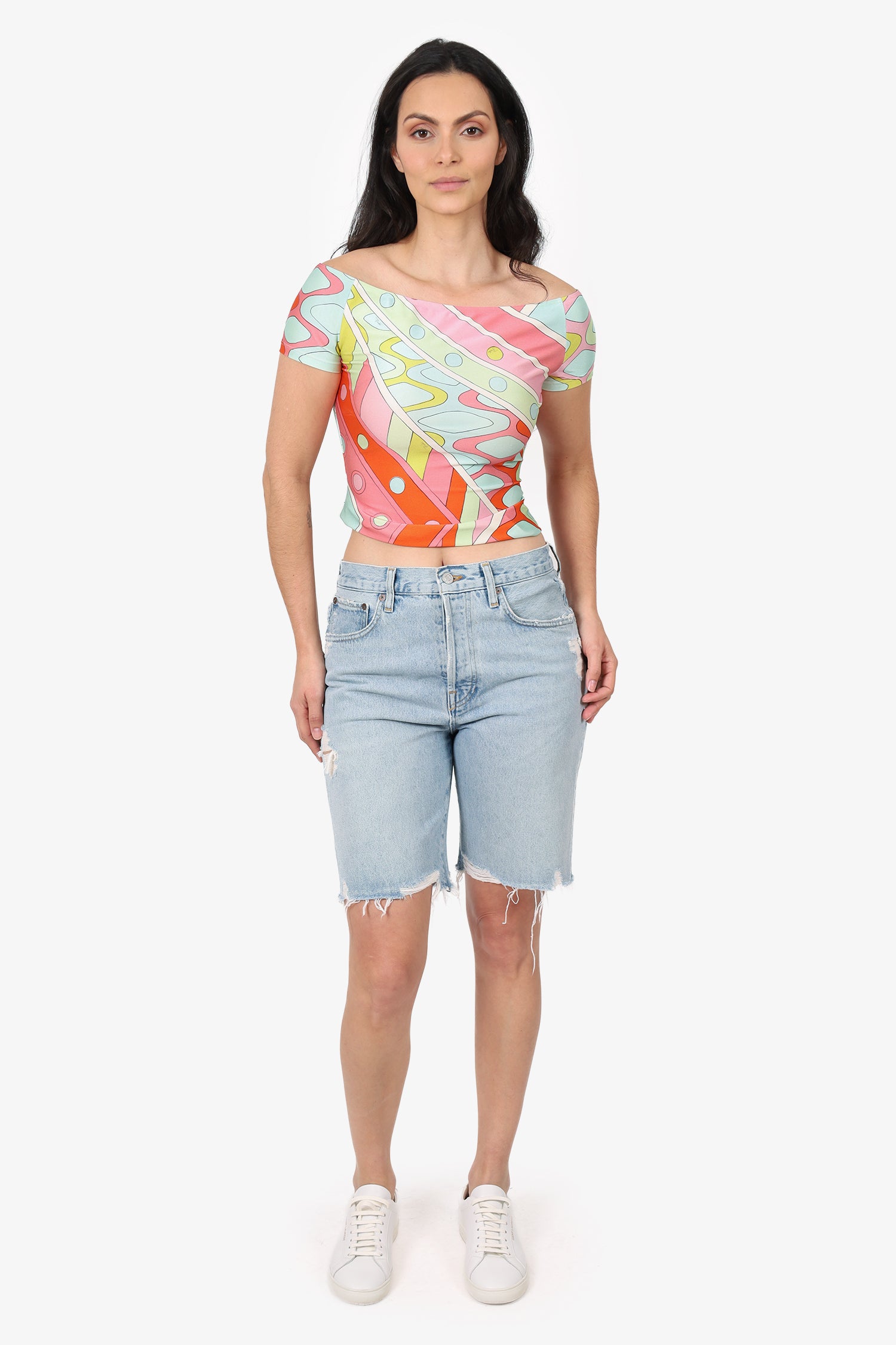 Refresh availabilityAgolde Light Blue Distressed Denim 'IRA' Shorts. Slip-on. Front button-up closure. Waistband belt-loops. 5 exterior pockets; 2 front slip, 1 mini compartment, and 2 rear slip. Brass and silver-tone hardware. Contrast stitching.