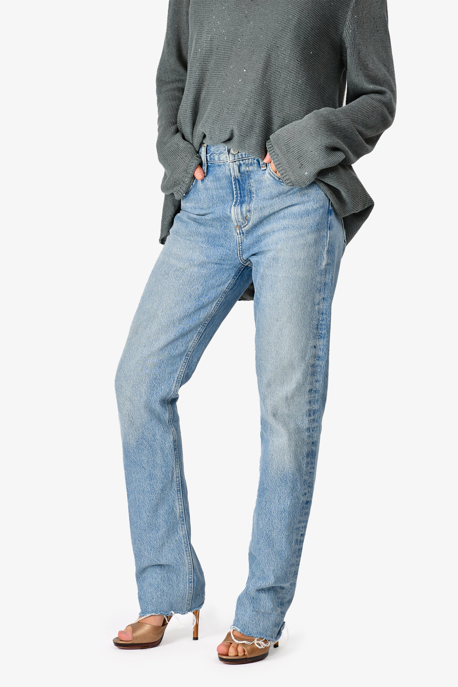 Refresh availabilityAgolde Light Blue Frayed Hem Jeans. Front zip and button closure. 3 front slip pockets and 2 rear zip pockets. Silver and copper toned hardware. Contrast stitching.