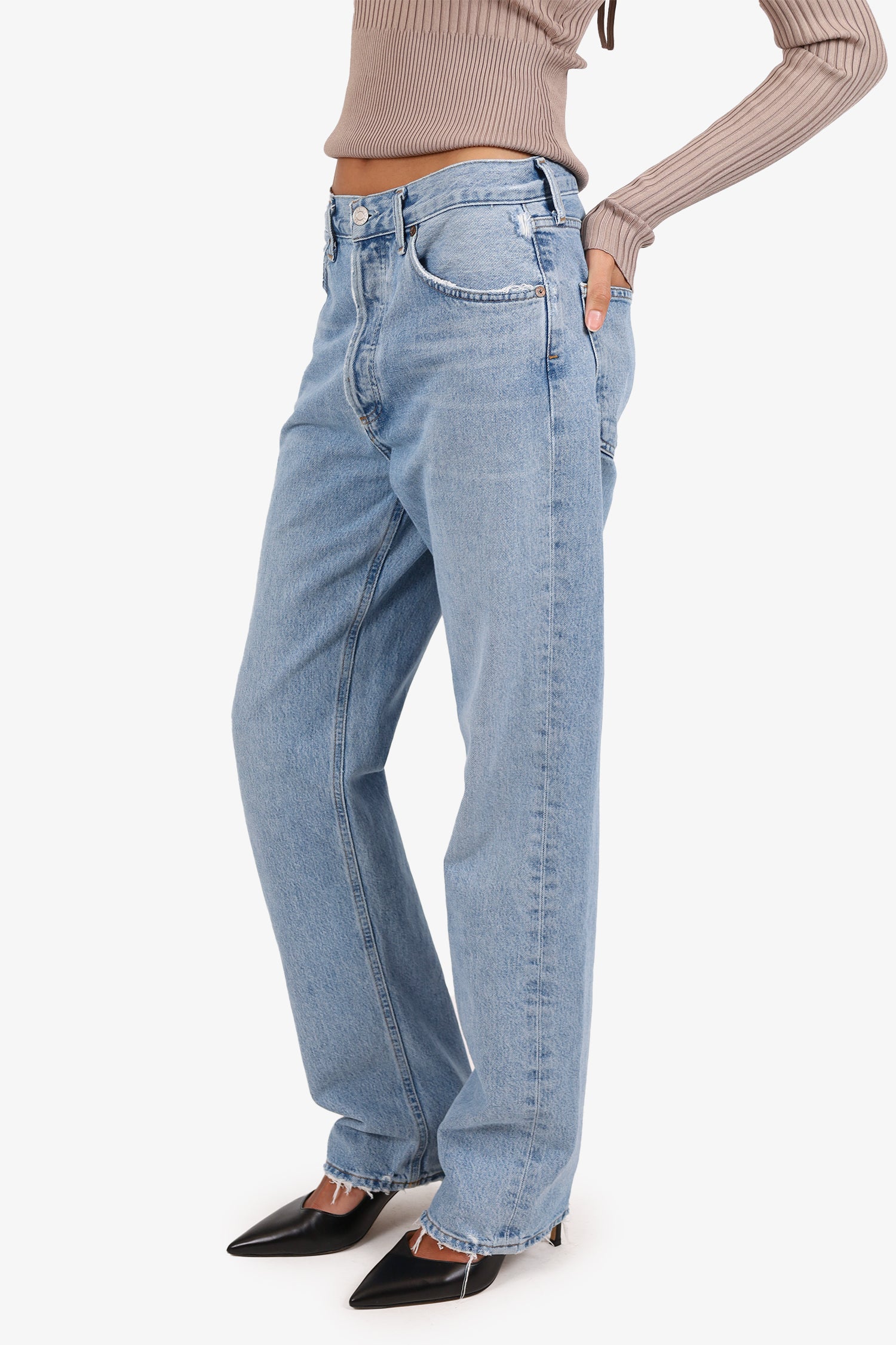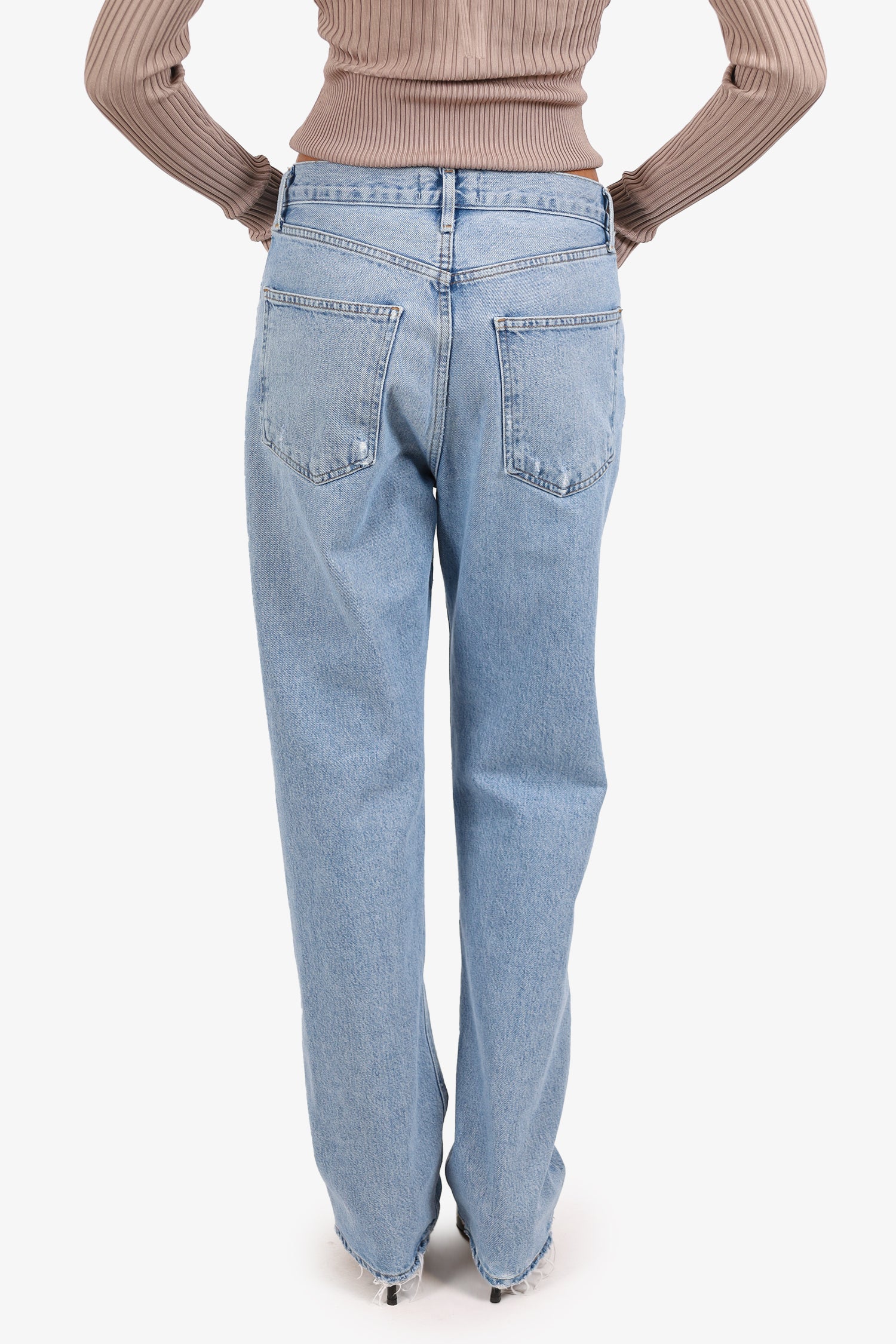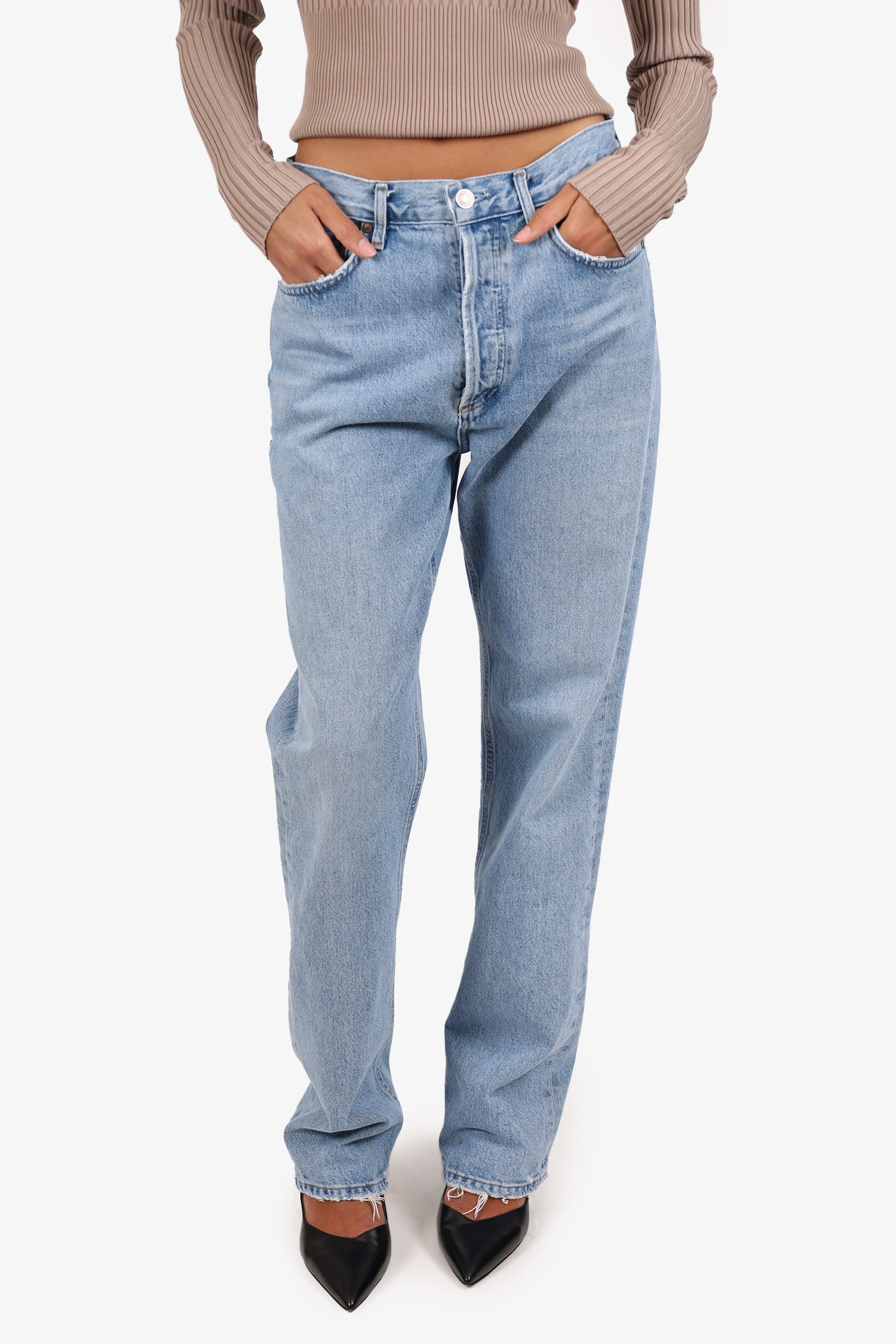 Refresh availabilityAgolde Light Wash Straight Leg Jeans. Slip-on. Front button-up closure. Waistband belt loops. 5 exterior pockets; 2 front side slip and 1 mini compartment, 2 rear slip. Distressing throughout. Contrasting stitching.