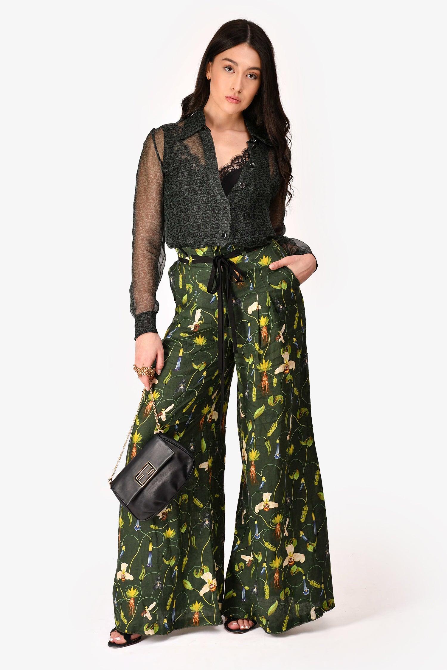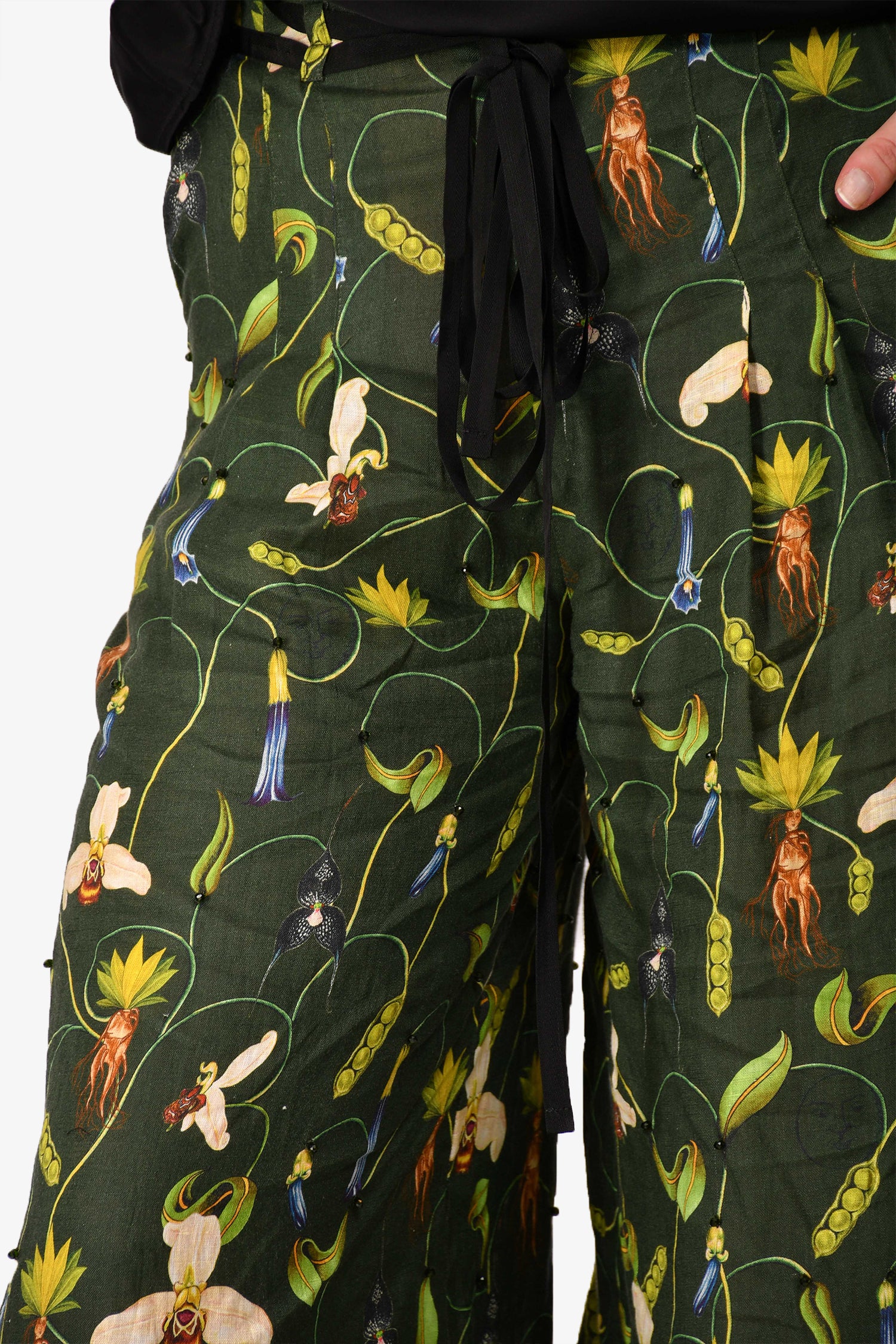 Refresh availabilityAgua by Aquabendita X Gucci Vault Green Linen Floral Printed Pants. Front zip closure with concealed button. Waist-tie detail. 2 side slip pockets. Beaded embellishments. Unlined. Tonal stitching.