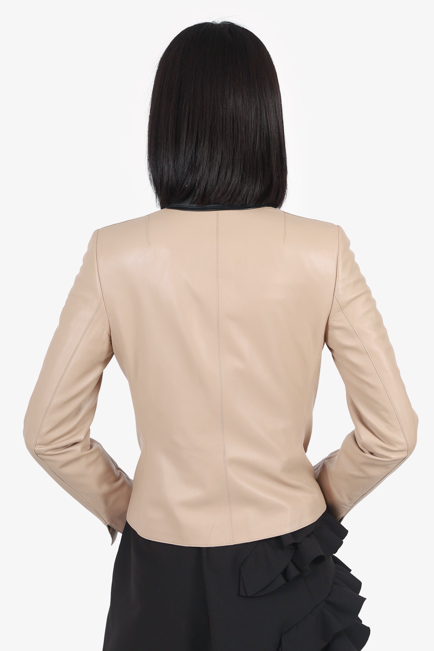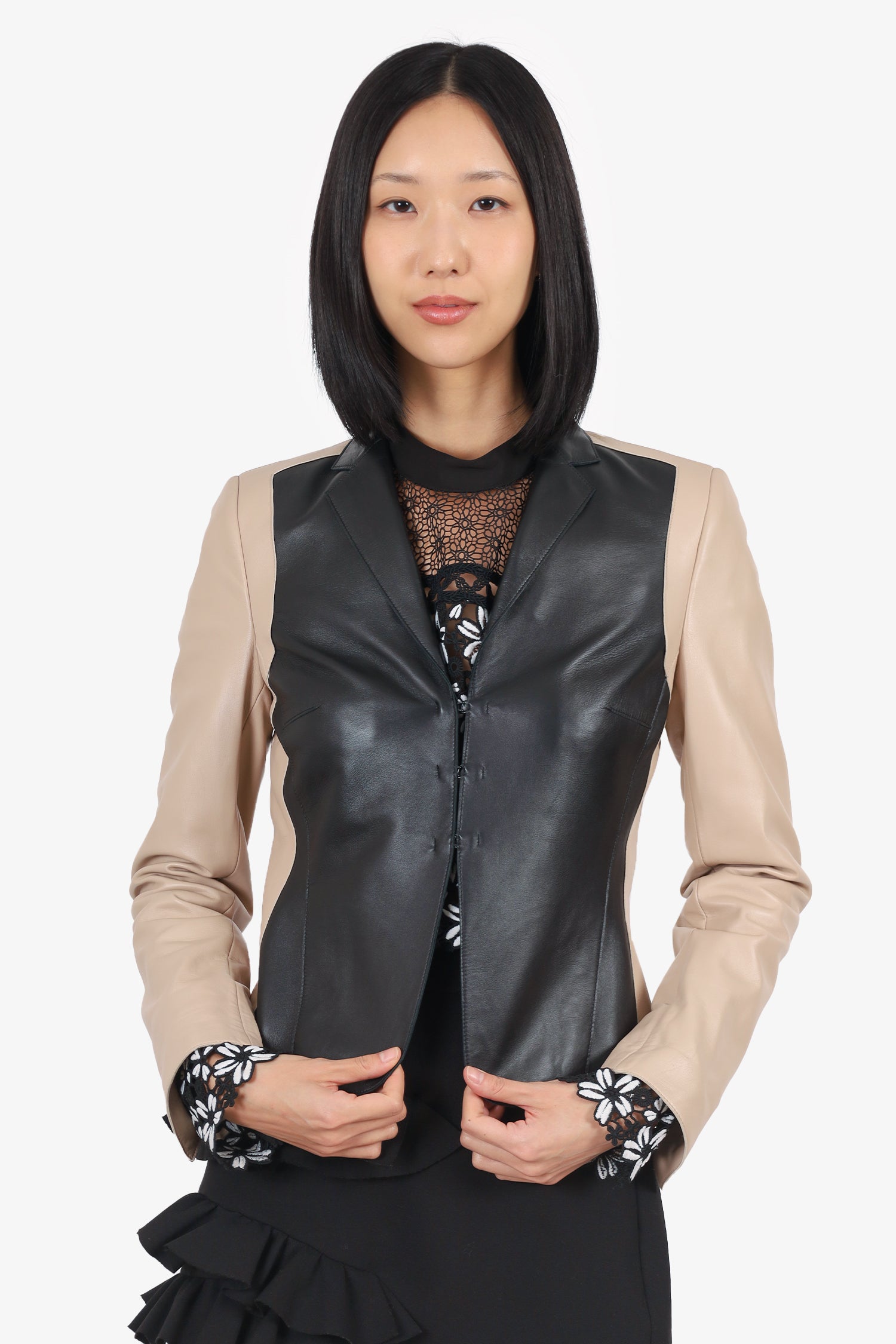 Refresh availabilityAkris Black/Beige Leather Single Breasted Jacket. Pull-on. Collared-neckline. Front hook closure. Padding to shoulders. 2 exterior side slip pockets. Lined interior. Tonal stitching.