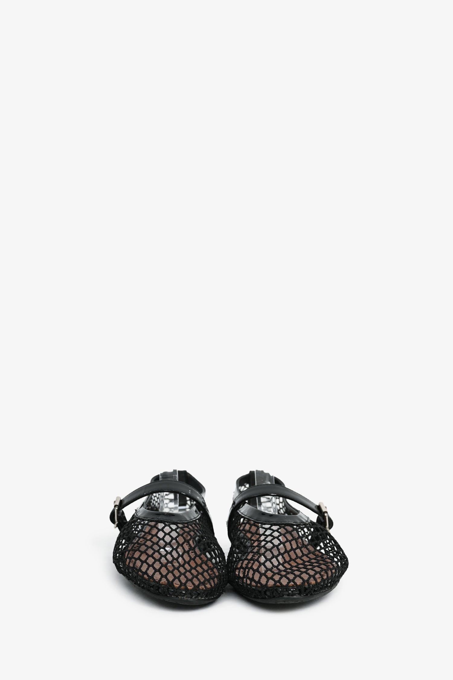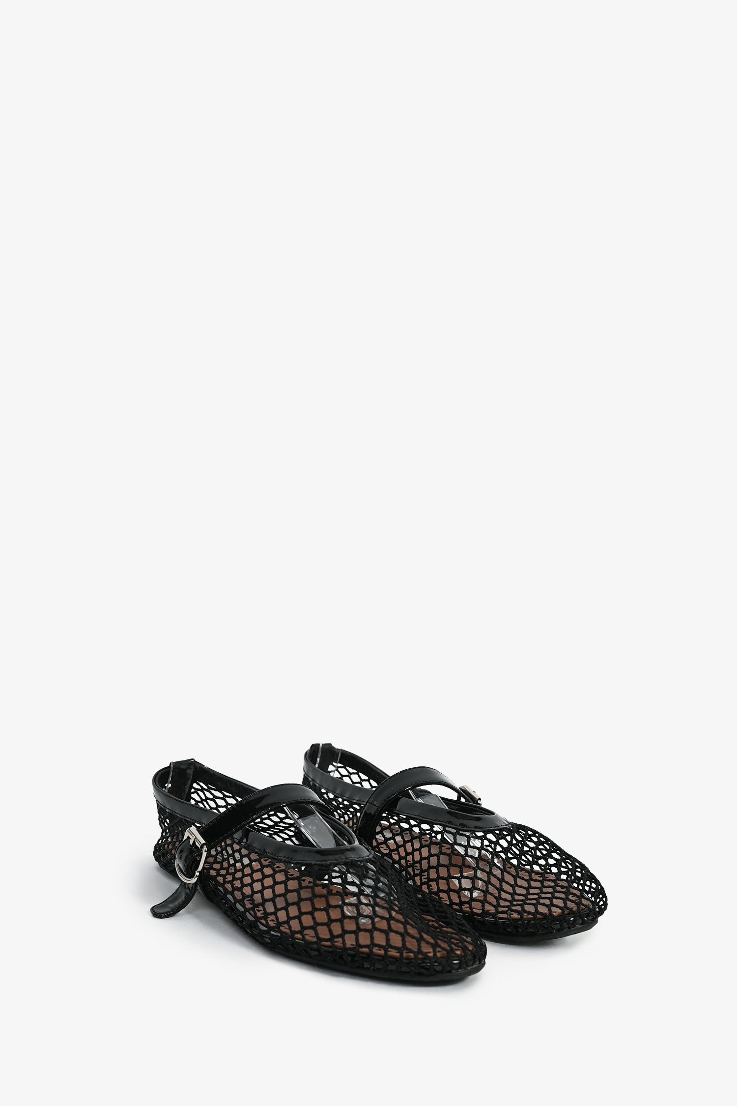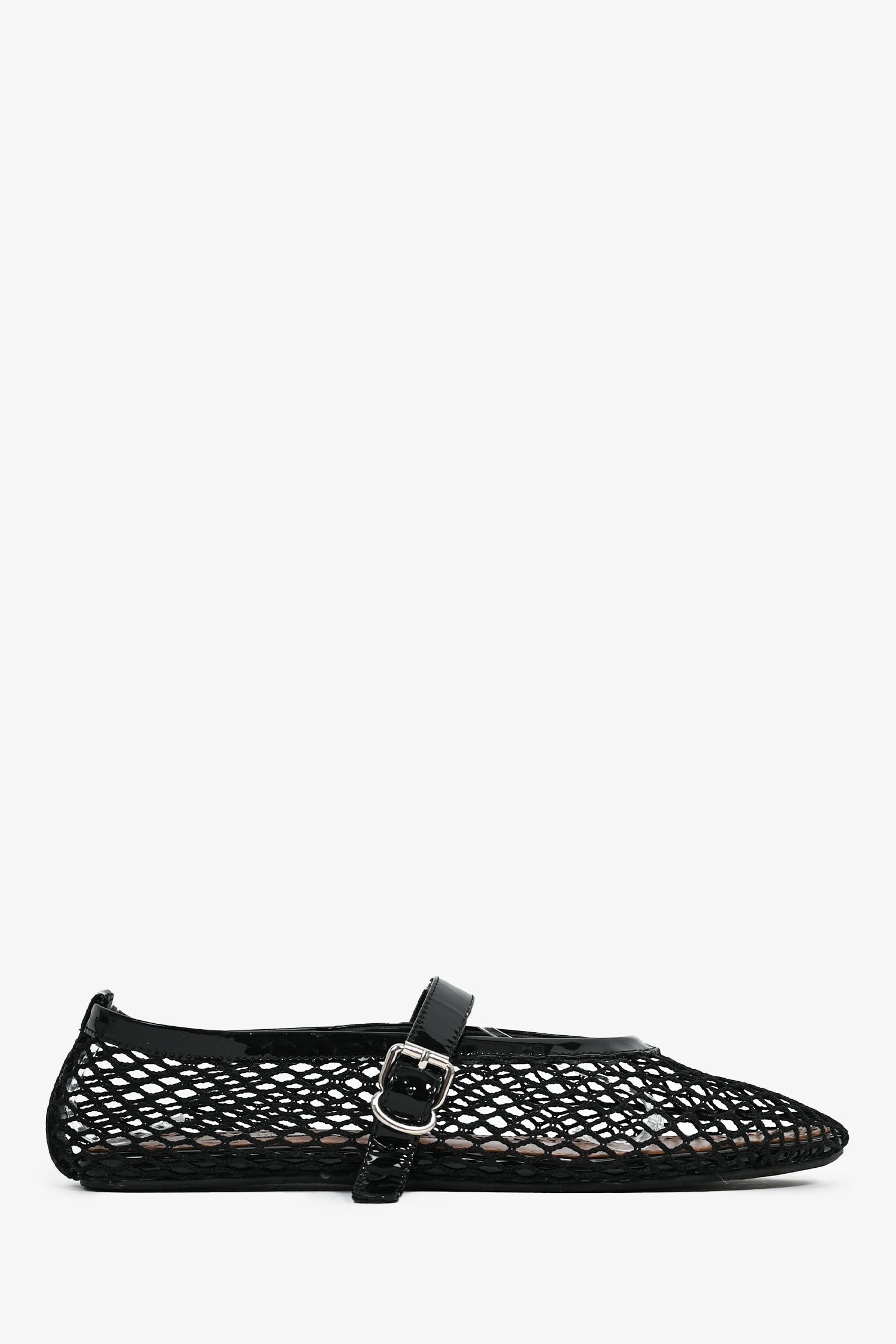 Refresh availabilityAlaia Black Fishnet Patent Leather Ballet Flats. Side buckle closure. Silver-tone hardware. Tonal stitching.