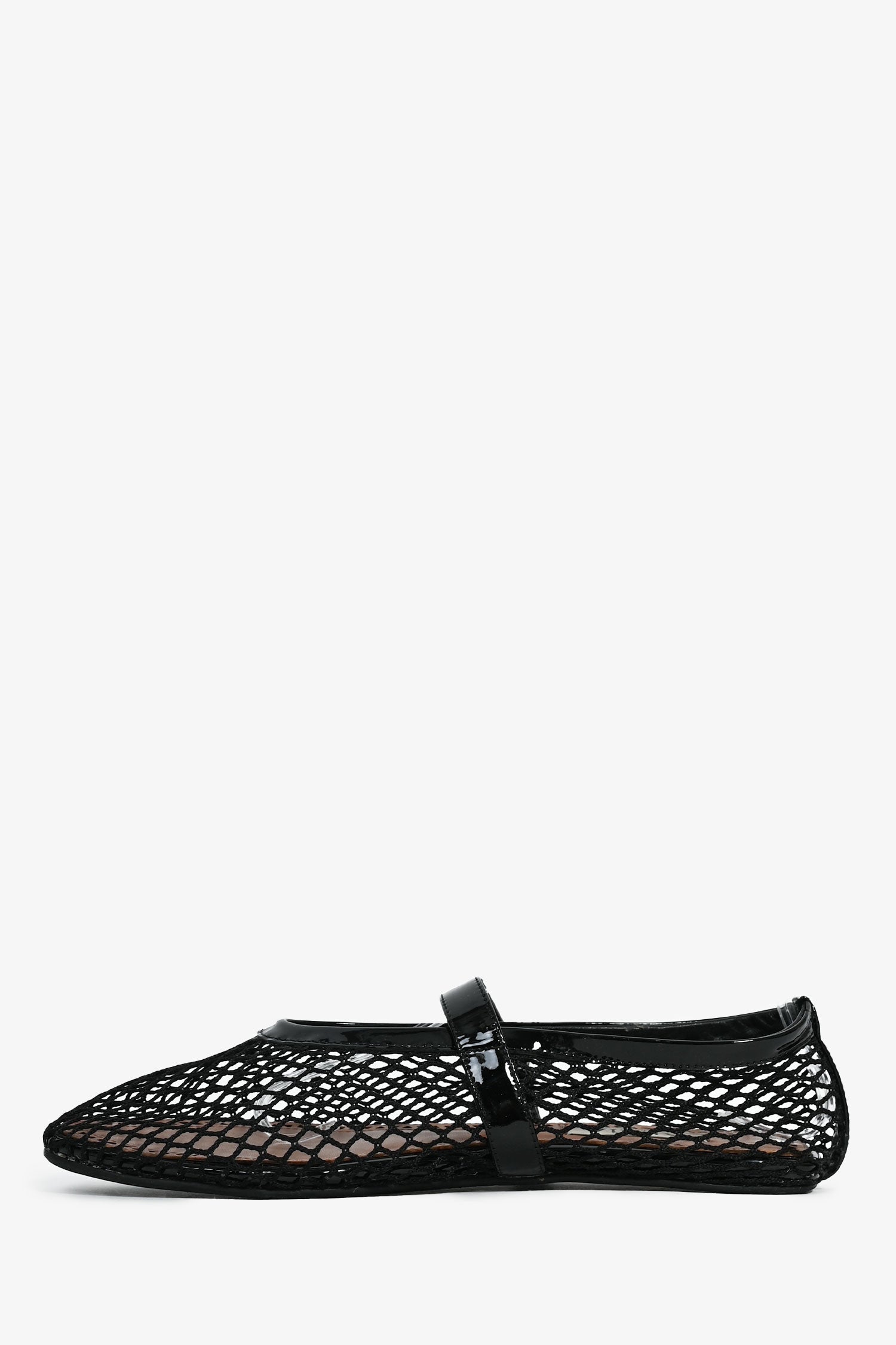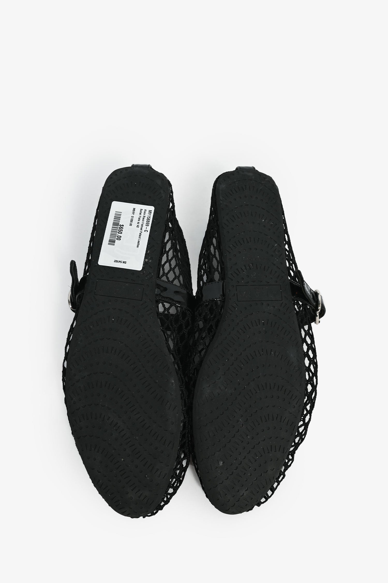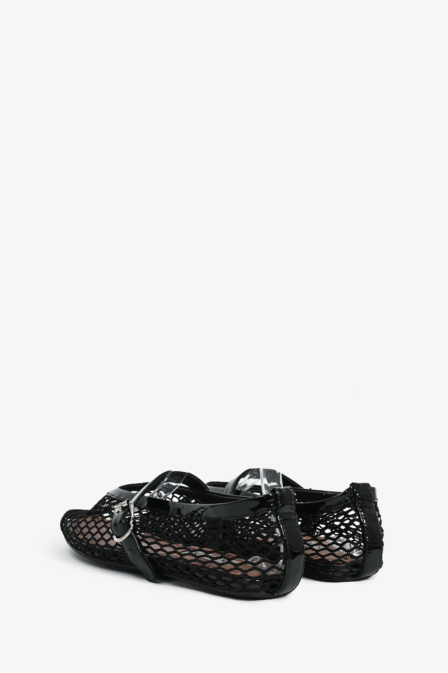 Refresh availabilityAlaia Black Fishnet Patent Leather Ballet Flats. Side buckle closure. Silver-tone hardware. Tonal stitching.