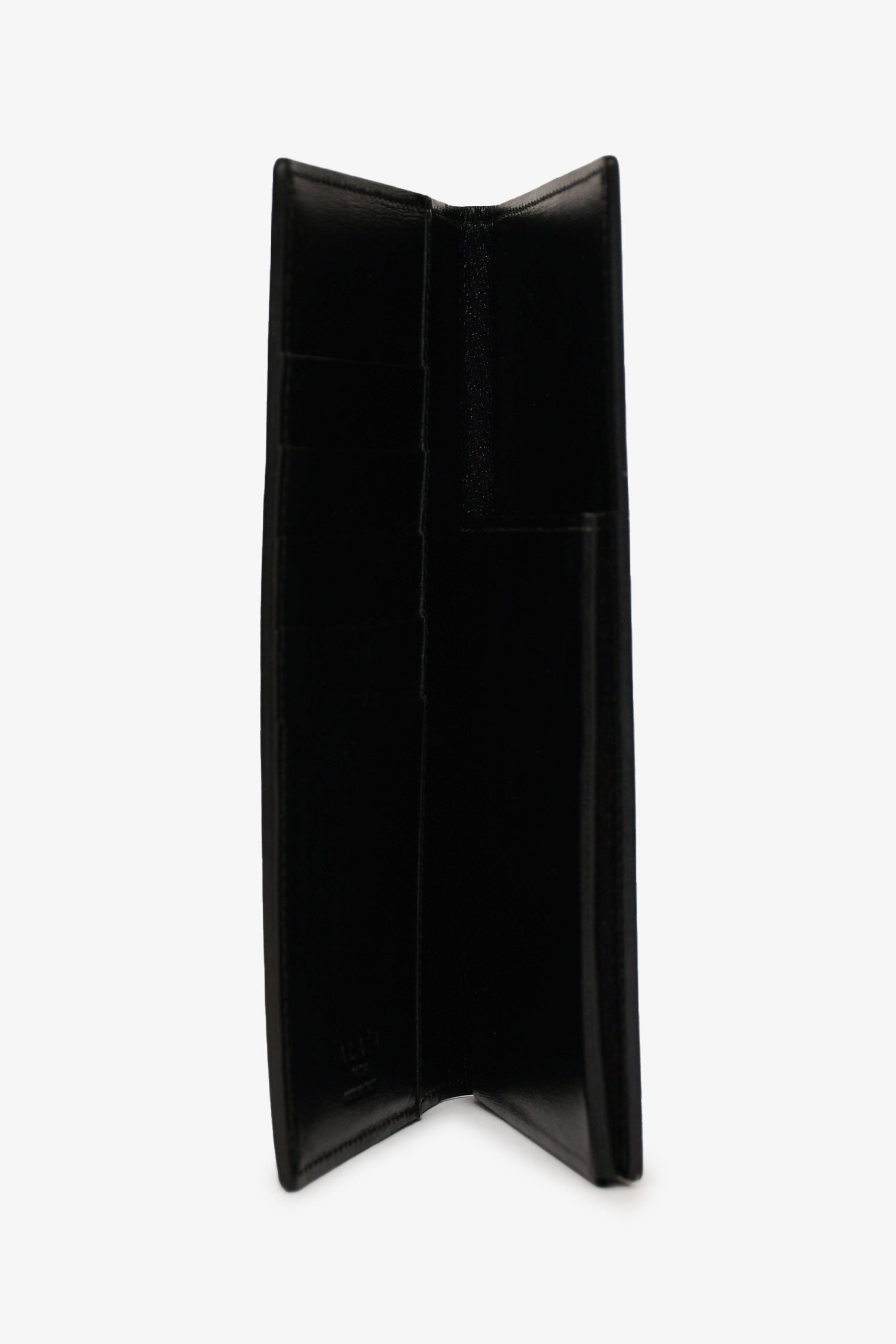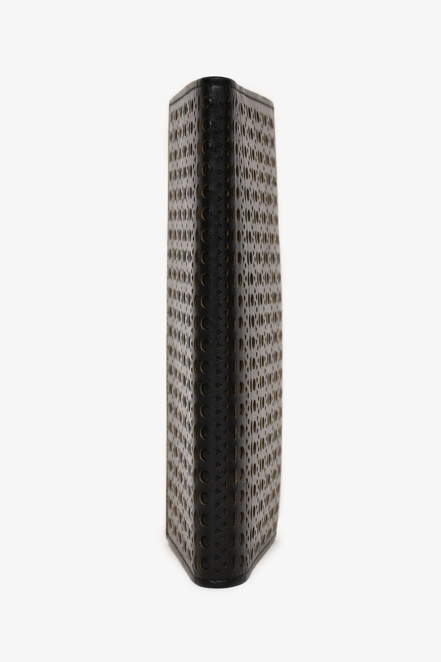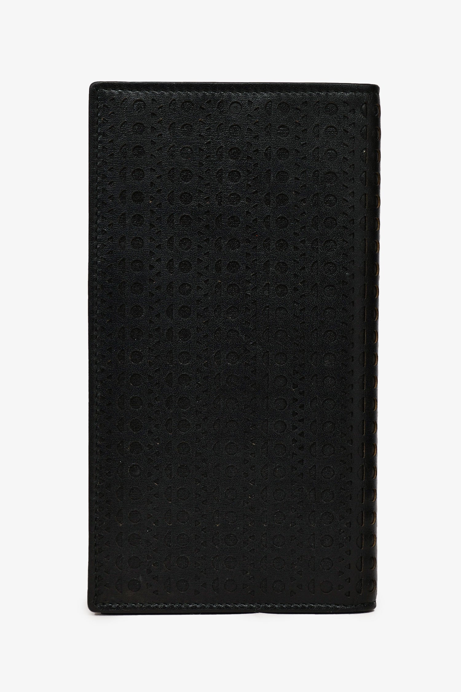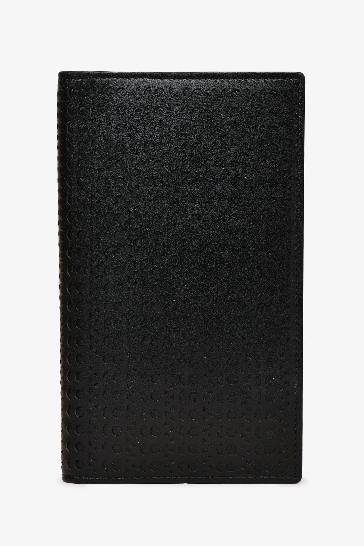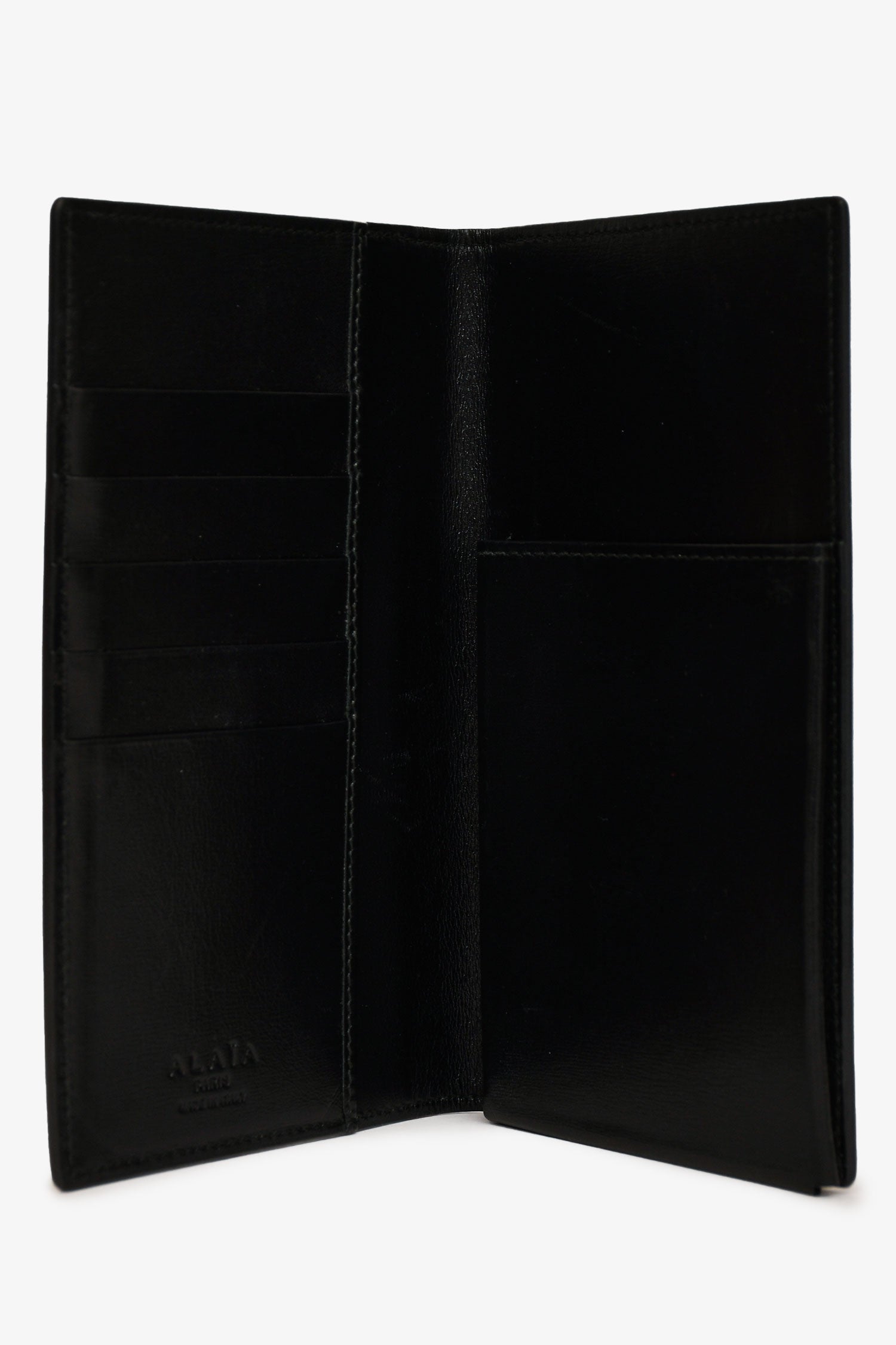 Refresh availabilityAlaia Black Perforated Leather Wallet. Smooth leather with laser-cut perforated design. Fold-open. Interior compartments with 5 card slots, one bill slot and slip pocket. Tonal stitching.