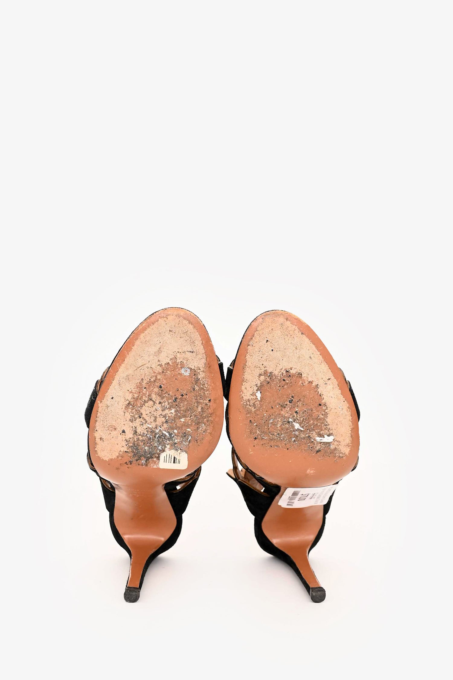 Refresh availabilityAlaia Black Suede Cage Heeled Sandals. Slip-on. Open toe. Adjustable buckle closure on both ankles. Tonal stitching.