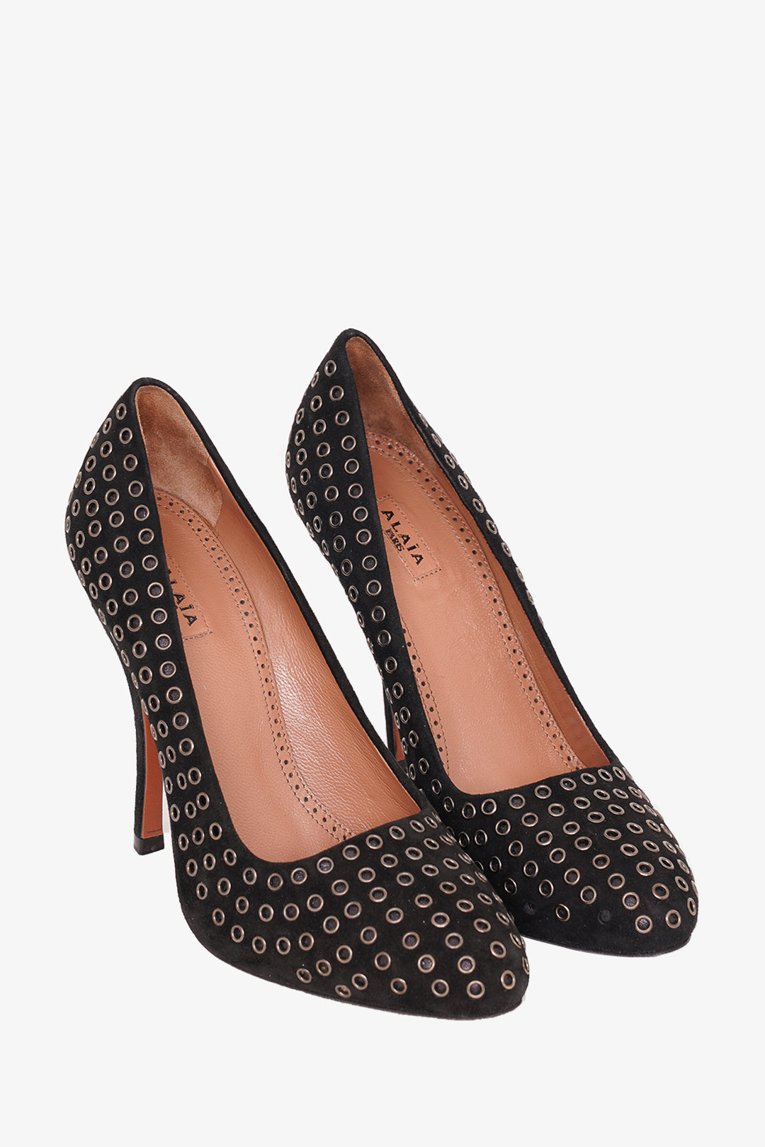 Refresh availabilityAlaïa Black Suede Eyelet Trim Pumps Heels. Round toe. Slip-on. Tonal stitching.