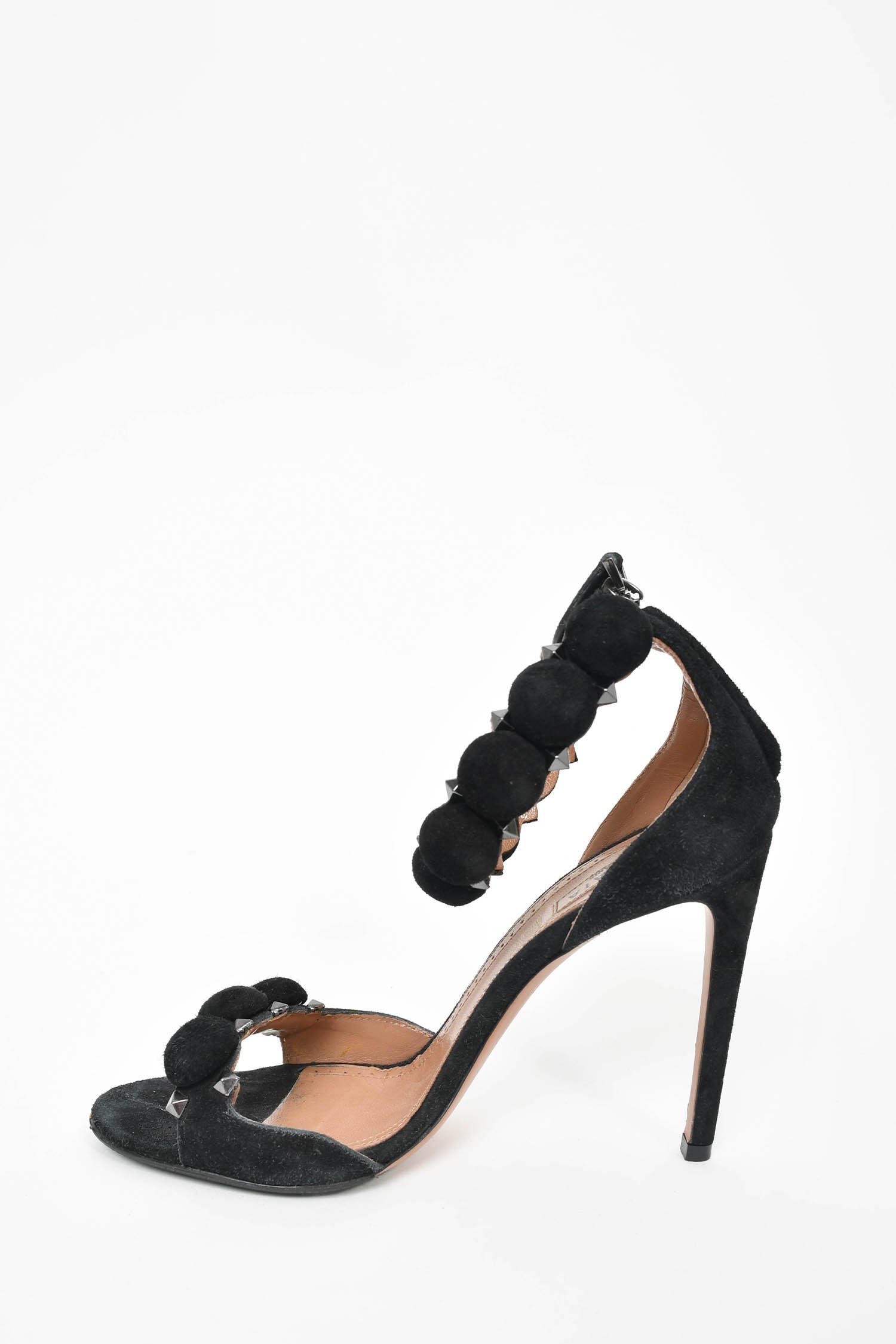 Refresh availabilityAlaia Black Suede Heeled Sandals With Grey Studs. Back zip closure. Skinny heel. Tonal stitching.