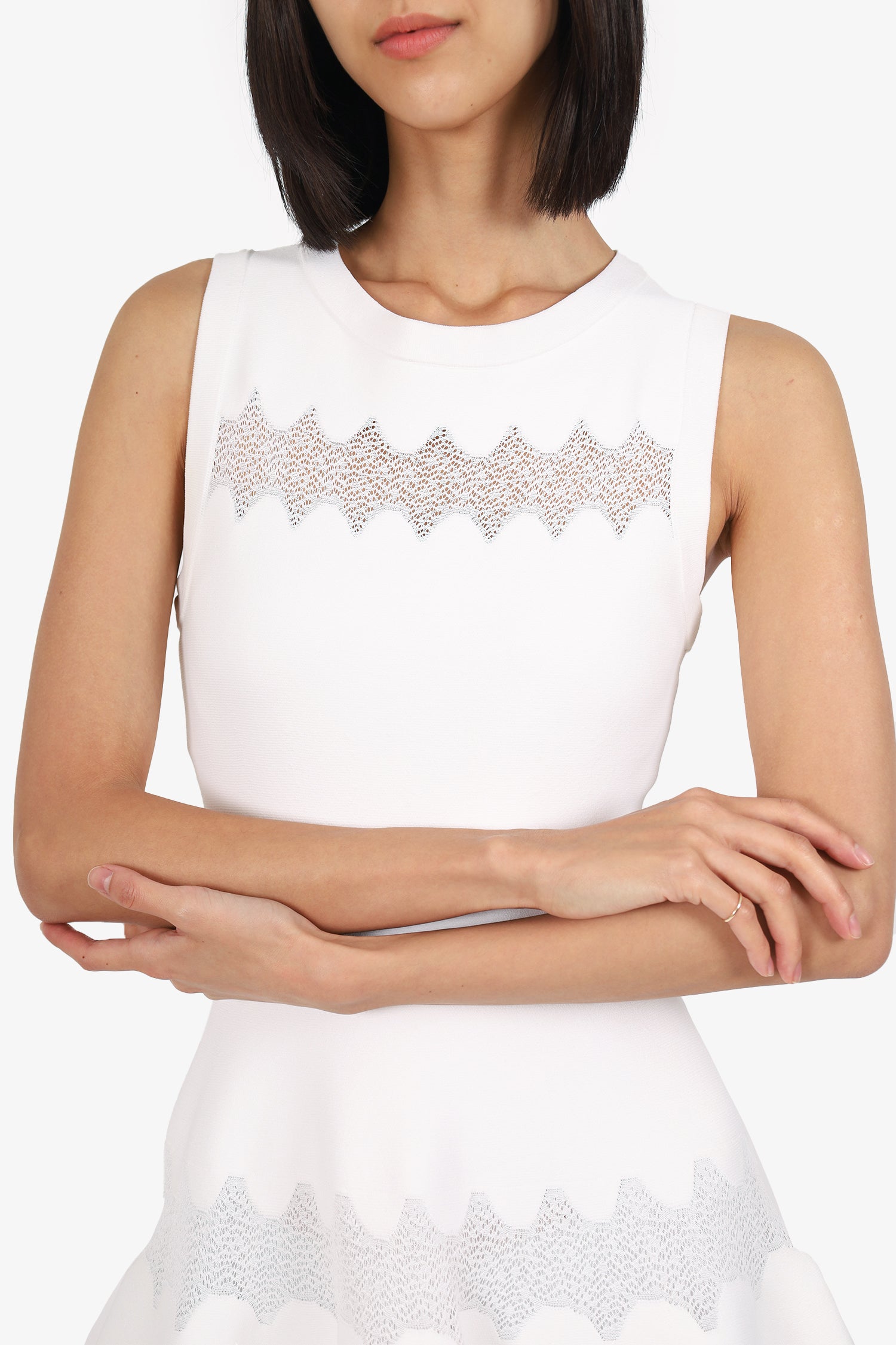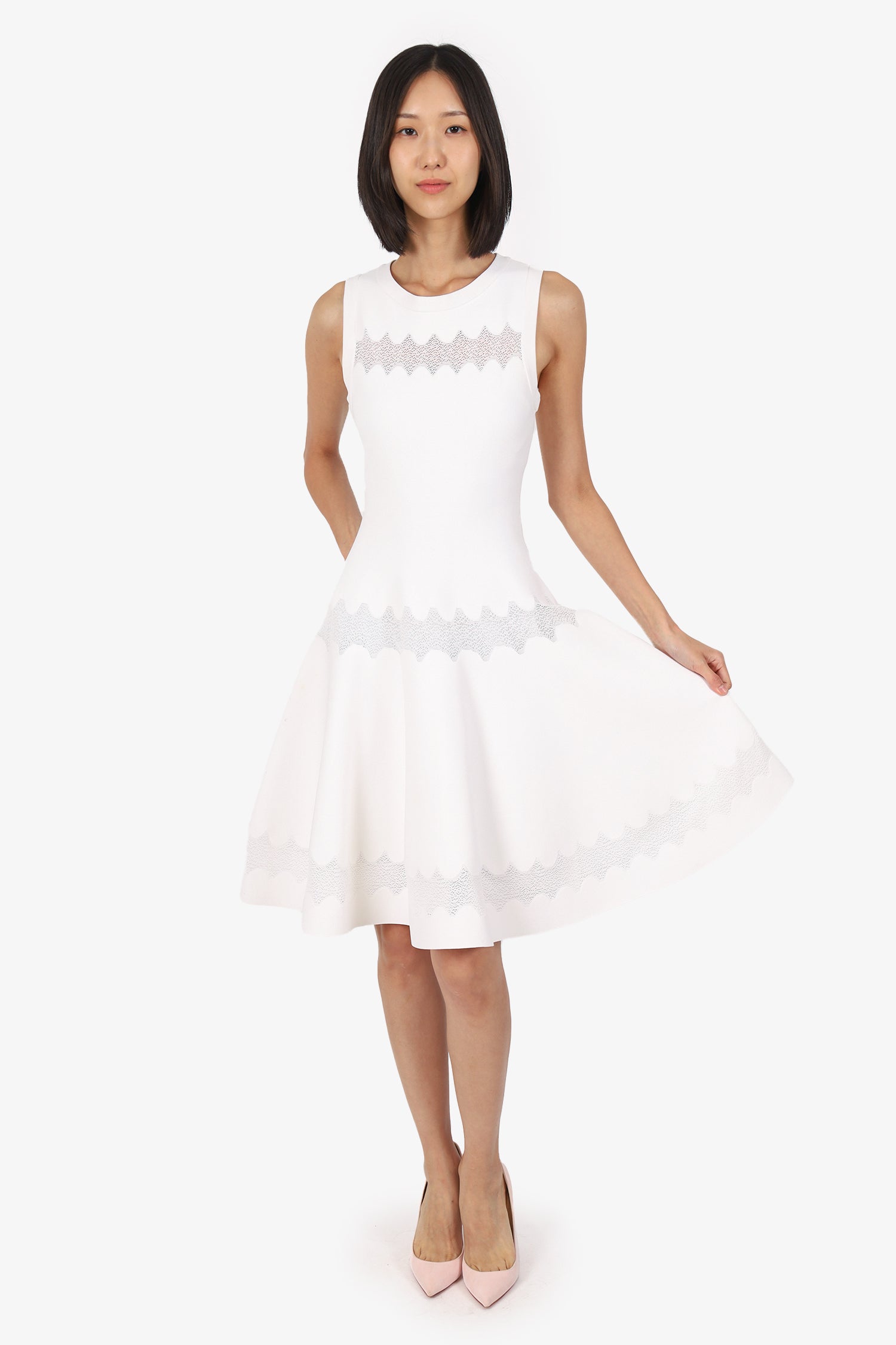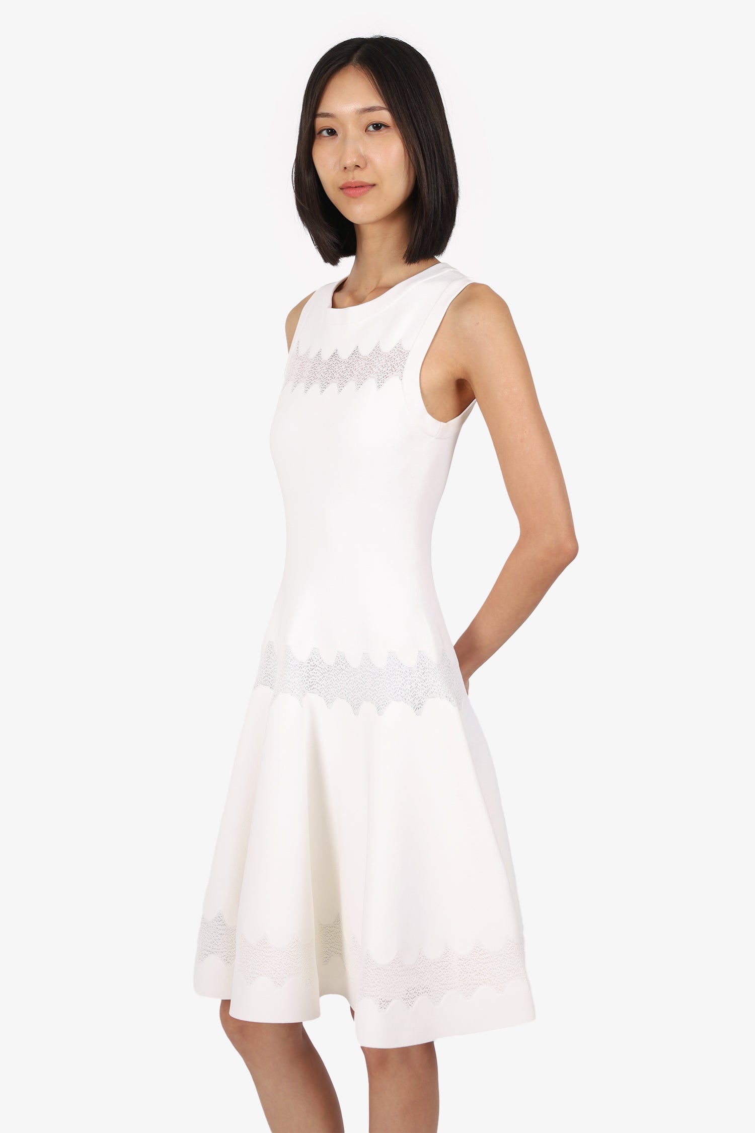 Refresh availabilityAlaia White Bodycon with Lace Detail Dress. Pull-on. Round-neckline. Rear zip closure. Lined interior. Tonal stitching.
