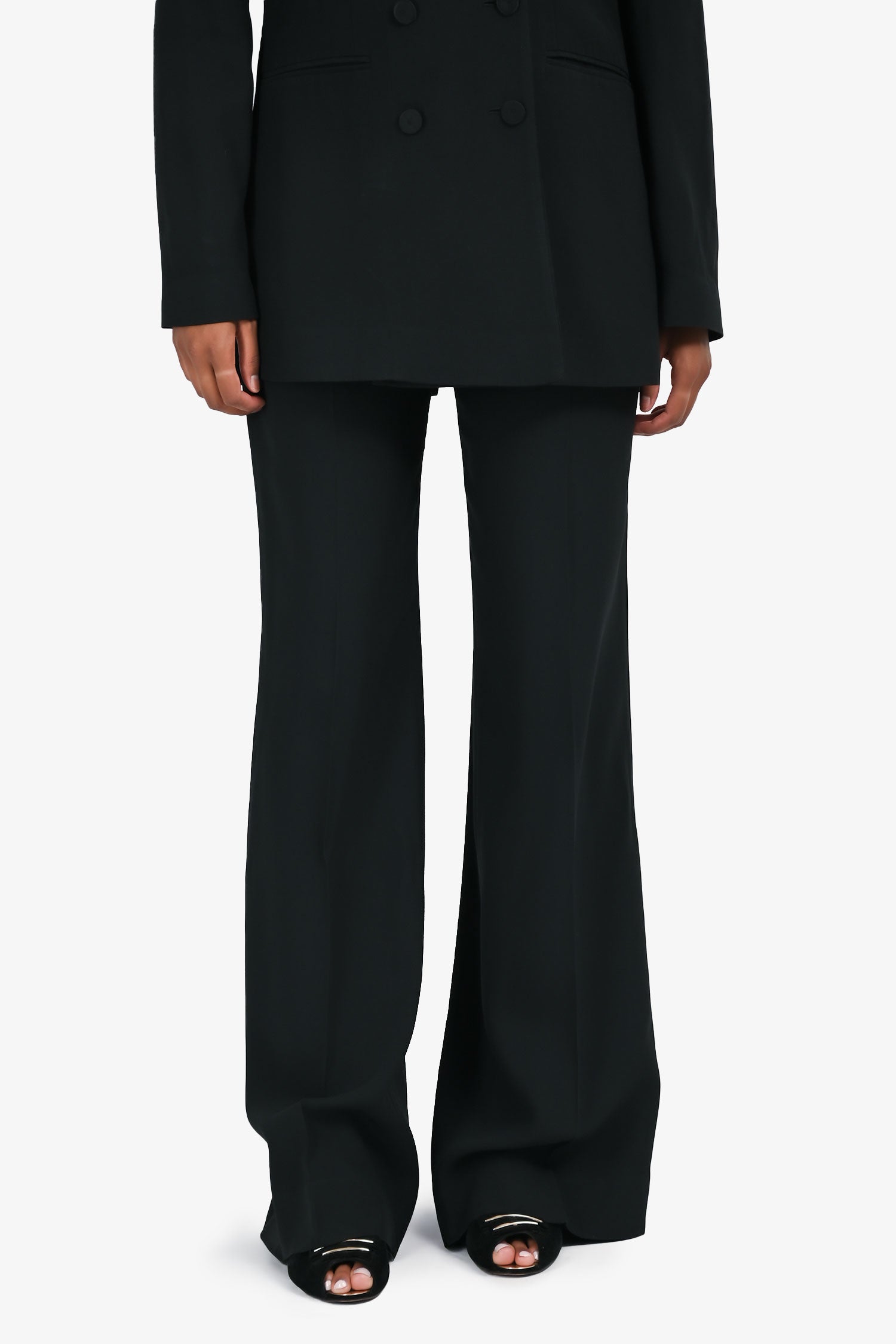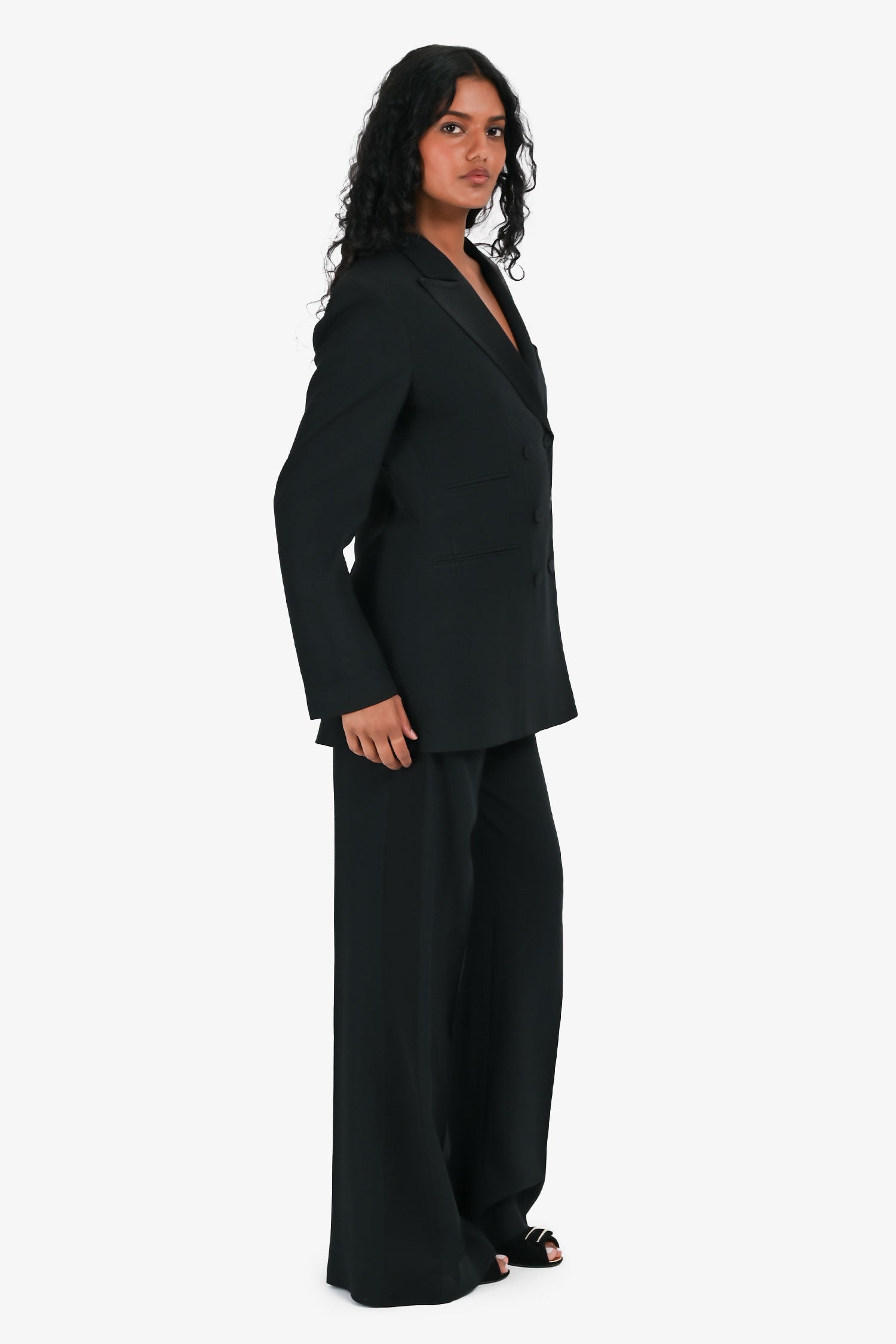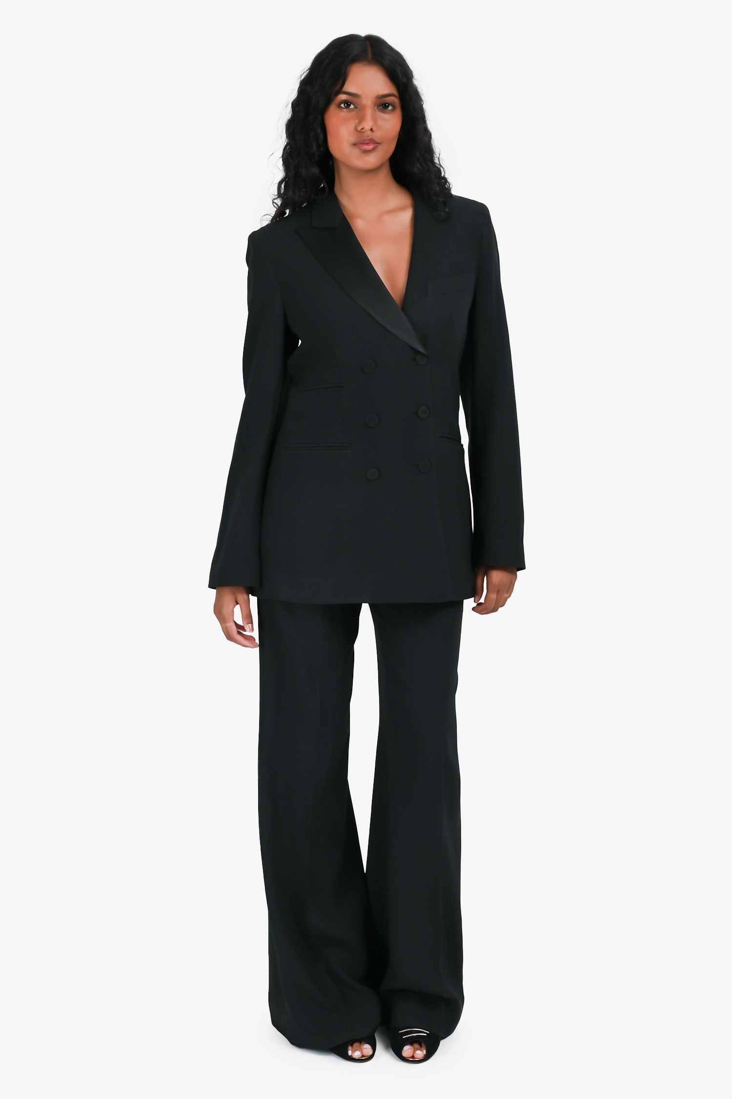 Refresh availabilityAlberta Ferretti Black Double Breasted Blazer + Trouser Set. Blazer features peak lapel collar, structured shoulders, long sleeves with buttoned cuffs, double-breasted front with tonal buttons, and slip pockets. Matching trousers feature a high-rise waist, zip fly with hook-and-bar closure, side pockets. Tonal stitching.