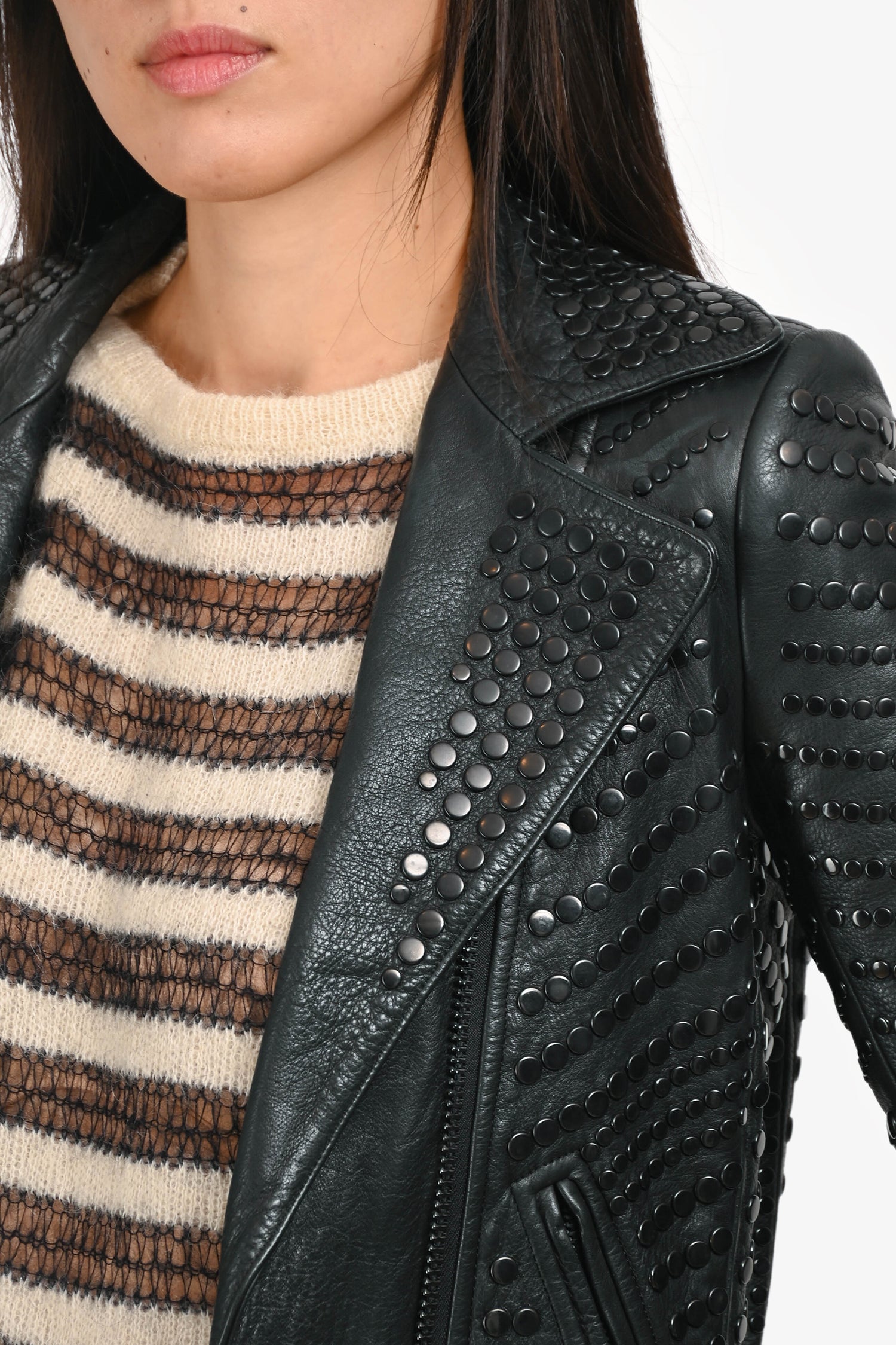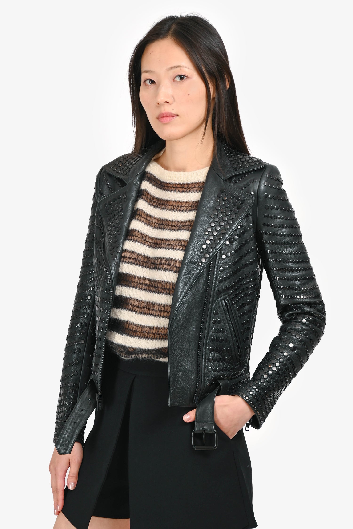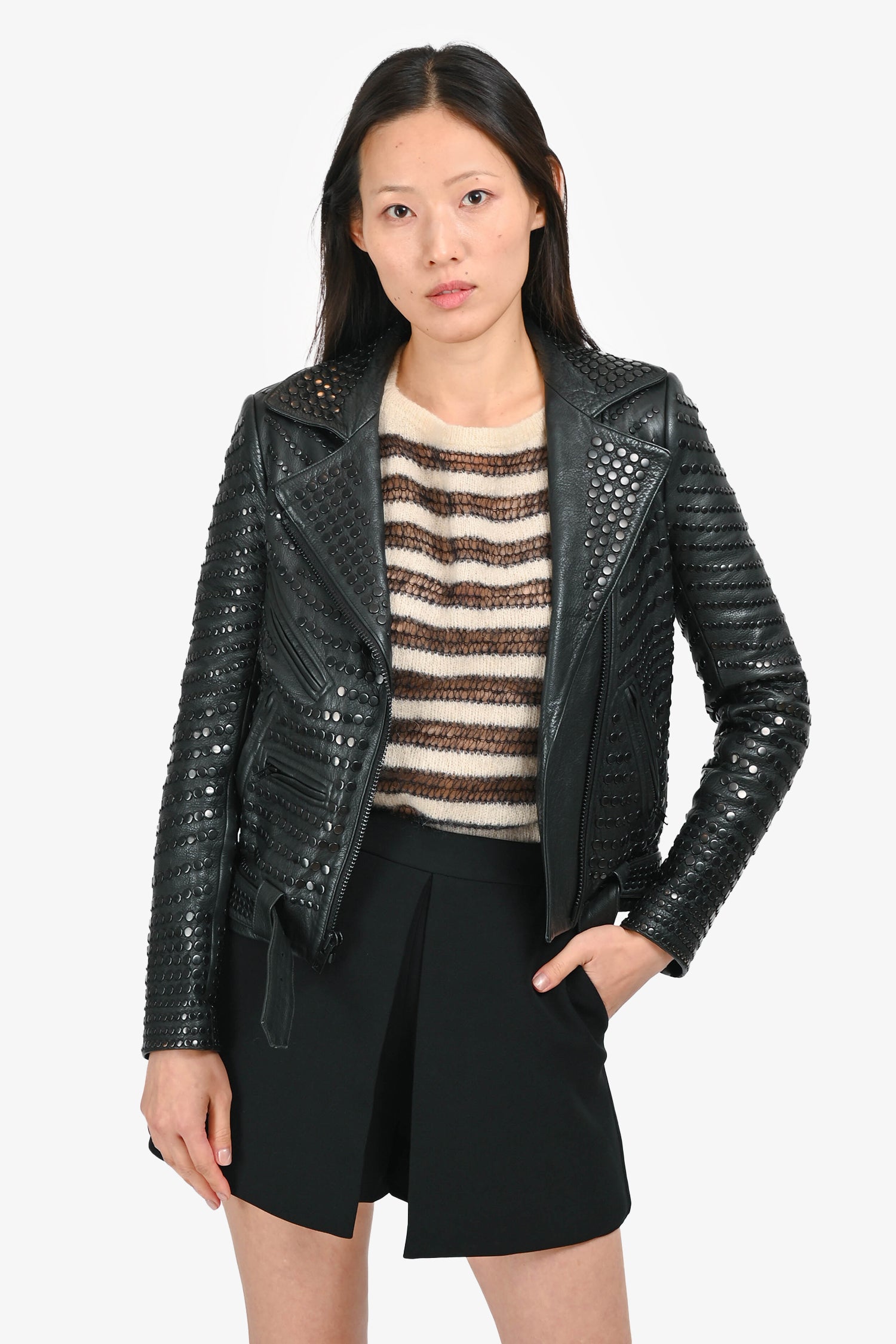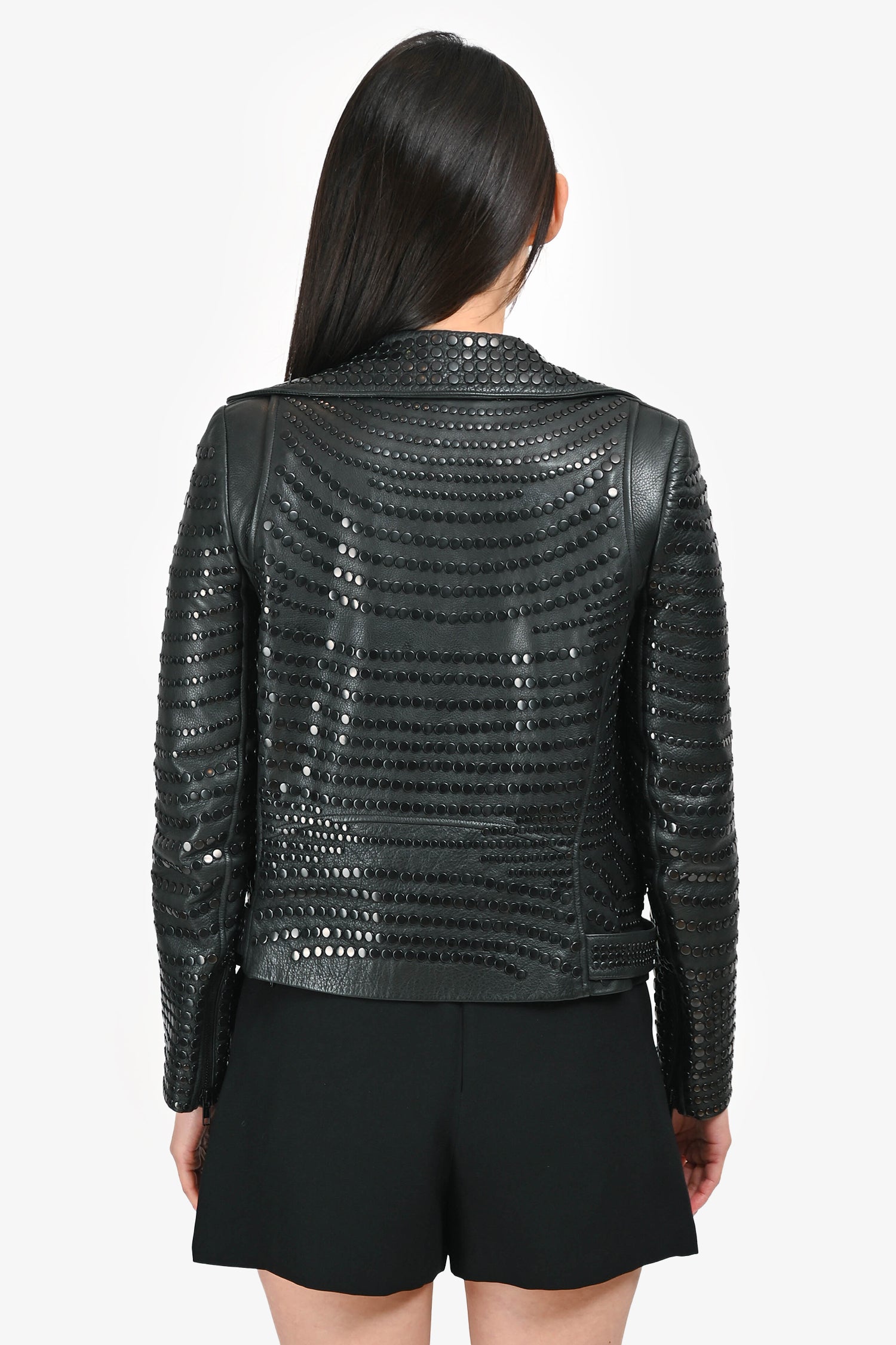 Refresh availabilityA.L.C. Black Calf Leather Moto Stud Jacket. Front zipper closure. 4 front pockets with zipper closures. Waistband belt detail. Zipper detailing on the cuffs. Lined interior. Left side seam zipper detail. Tonal stitching.