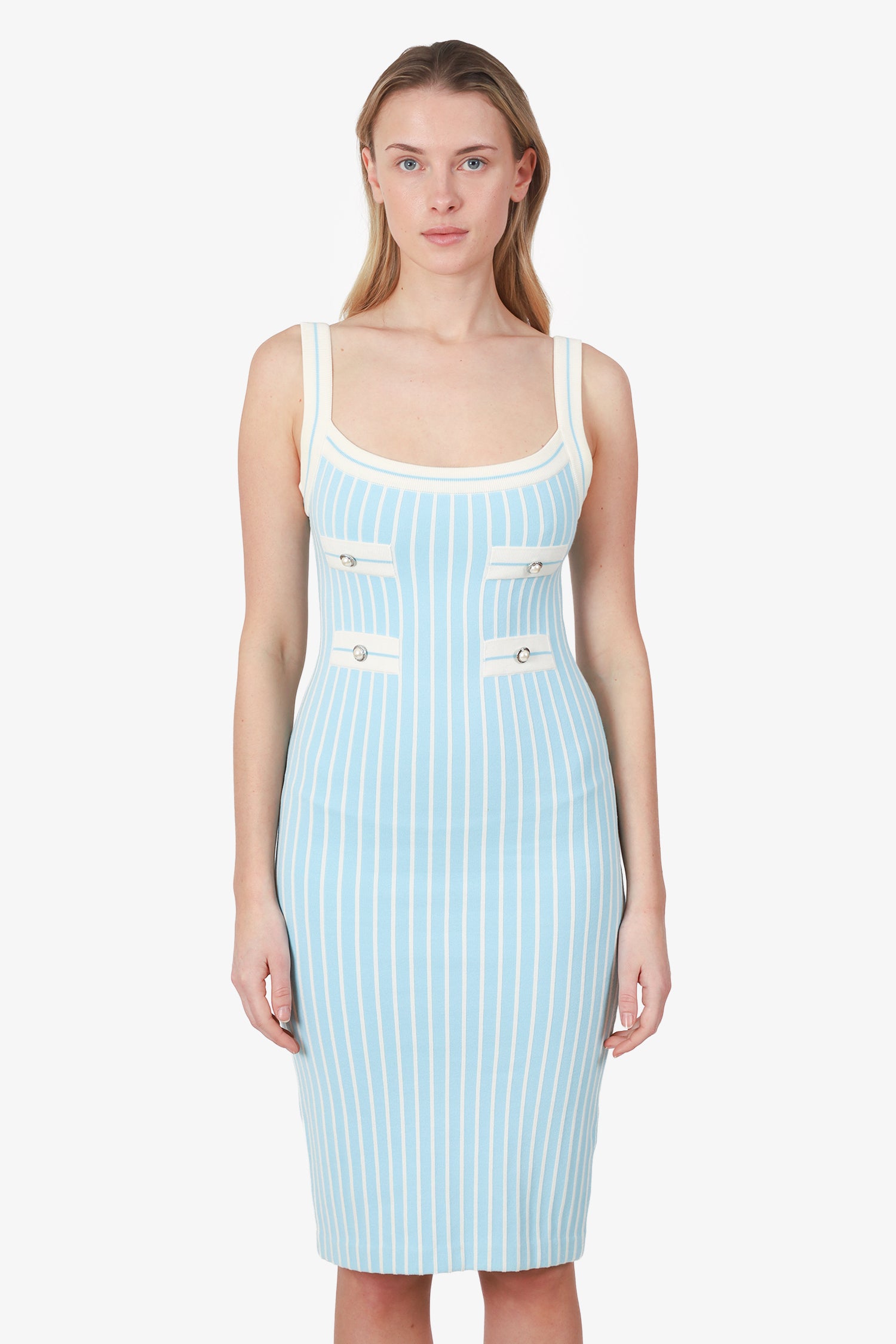 Refresh availabilityAlessandra Rich Blue/White Cotton Button Embellished Knitted Midi Dress. Round neckline. Silver-tone hardware. Tonal stitching.