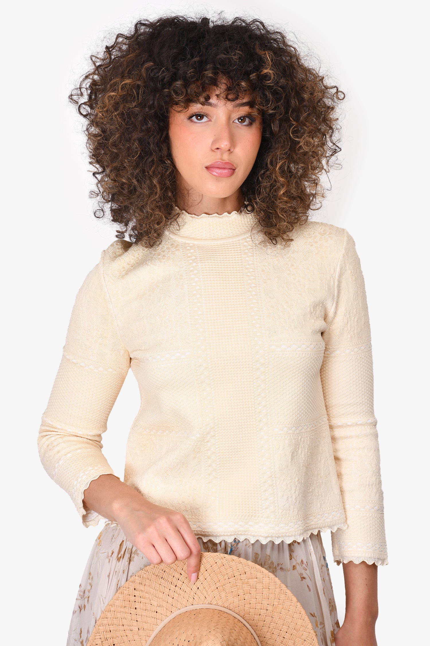 Refresh availabilityAlexander McQueen Beige Lace Embroidery Long-Sleeve Top. Rear button-up closure. Pull-over. High neckline. Ruffle hem. Tonal stitching.