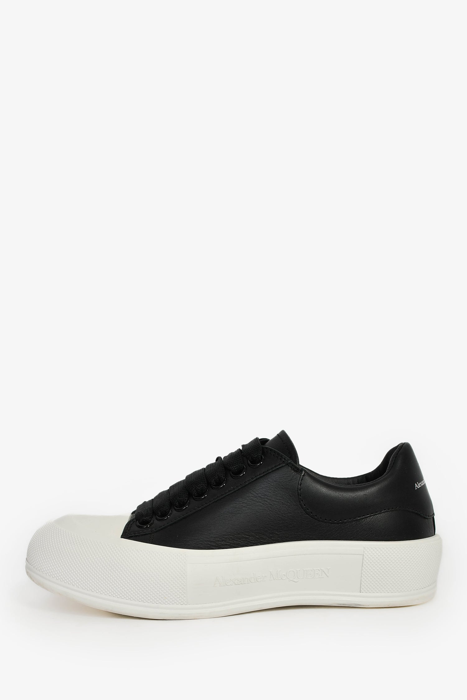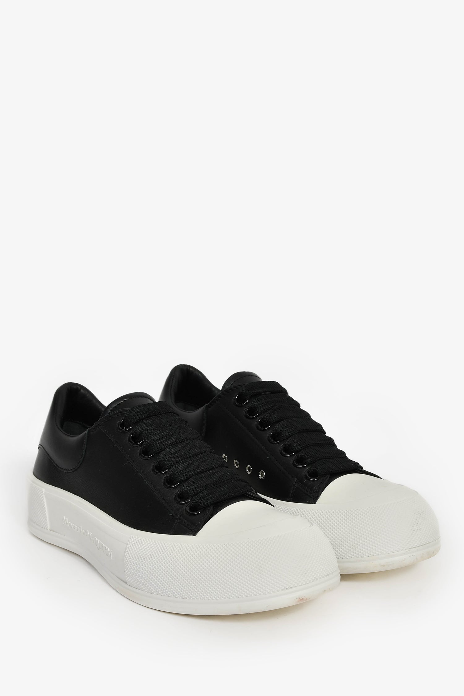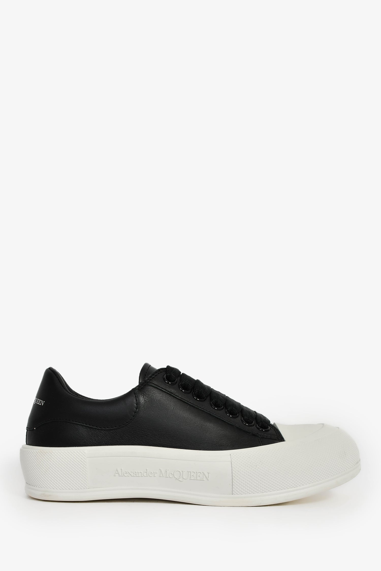 Refresh availabilityAlexander McQueen Black Leather Sneakers. Slip-on. Round toe. Lace-up closure. Leather-lined interior. Rubber soles. Tonal stitching.