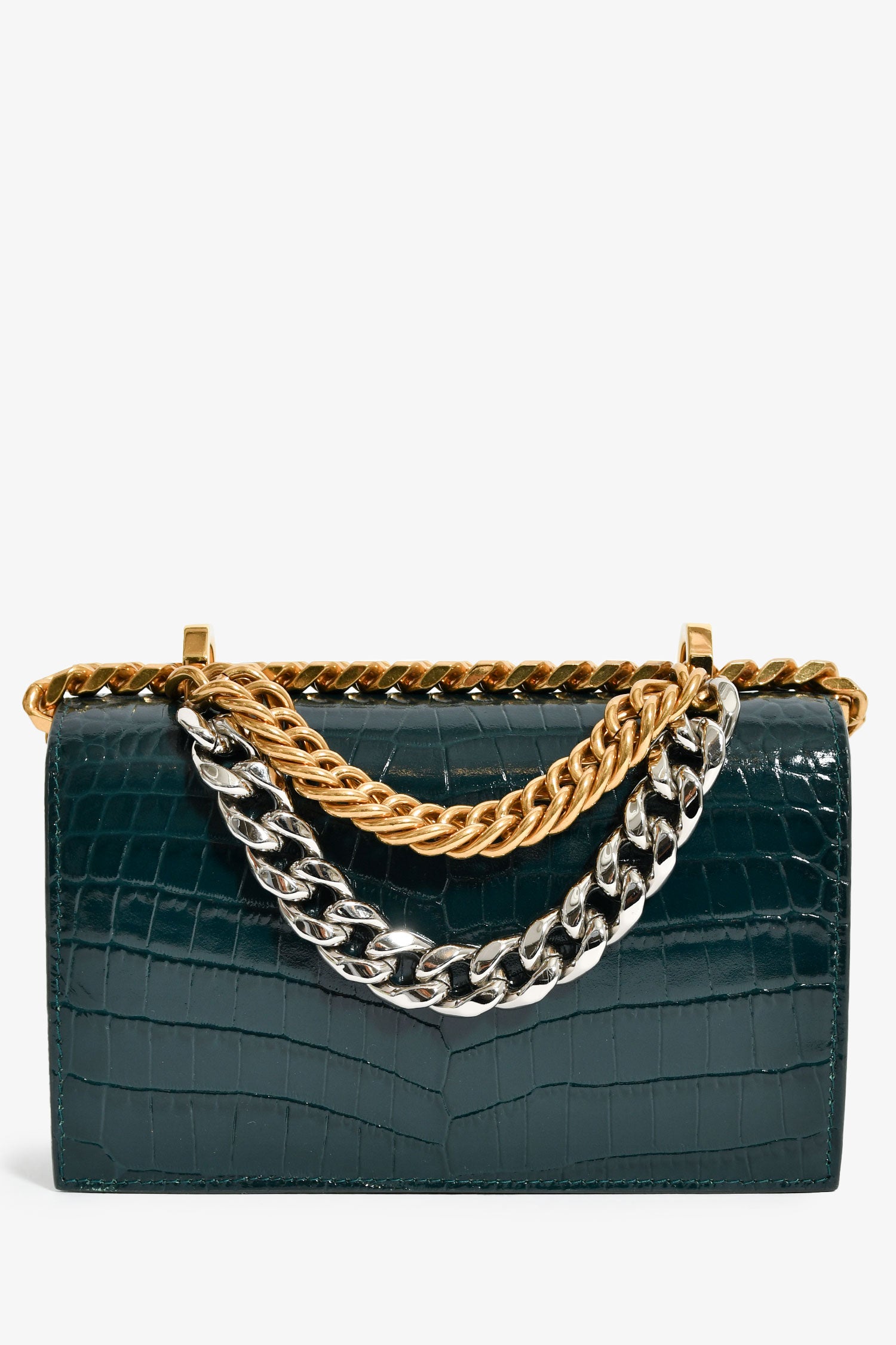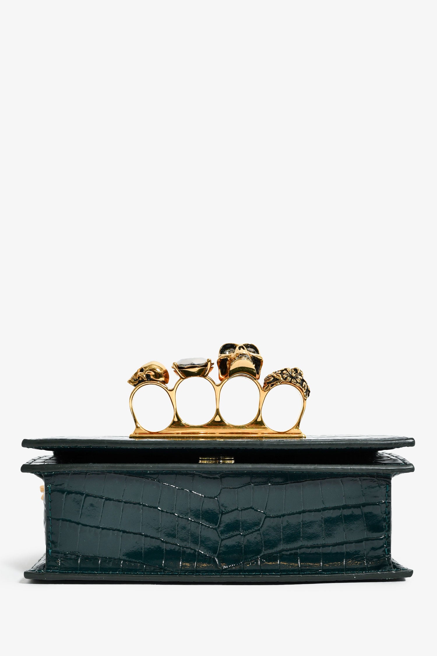 Refresh availabilityAlexander McQueen Green Croc Embossed Knuckle Shoulder Bag. Fold-over flap with a snap button closure. Front exterior 4 ring holder design. Chain-link shoulder strap and top handle. Lined interior with single card slot. Gold and silver-tone hardware. Tonal stitching.