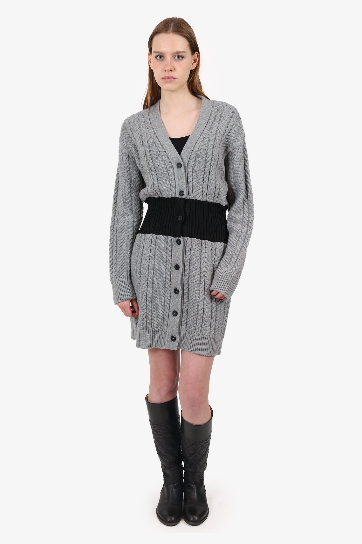 Refresh availabilityAlexander McQueen Grey/Black Wool/Cashmere Knit Cardigan Dress. Pull-on. V-neckline. Front button-up closure. Tonal stitching.