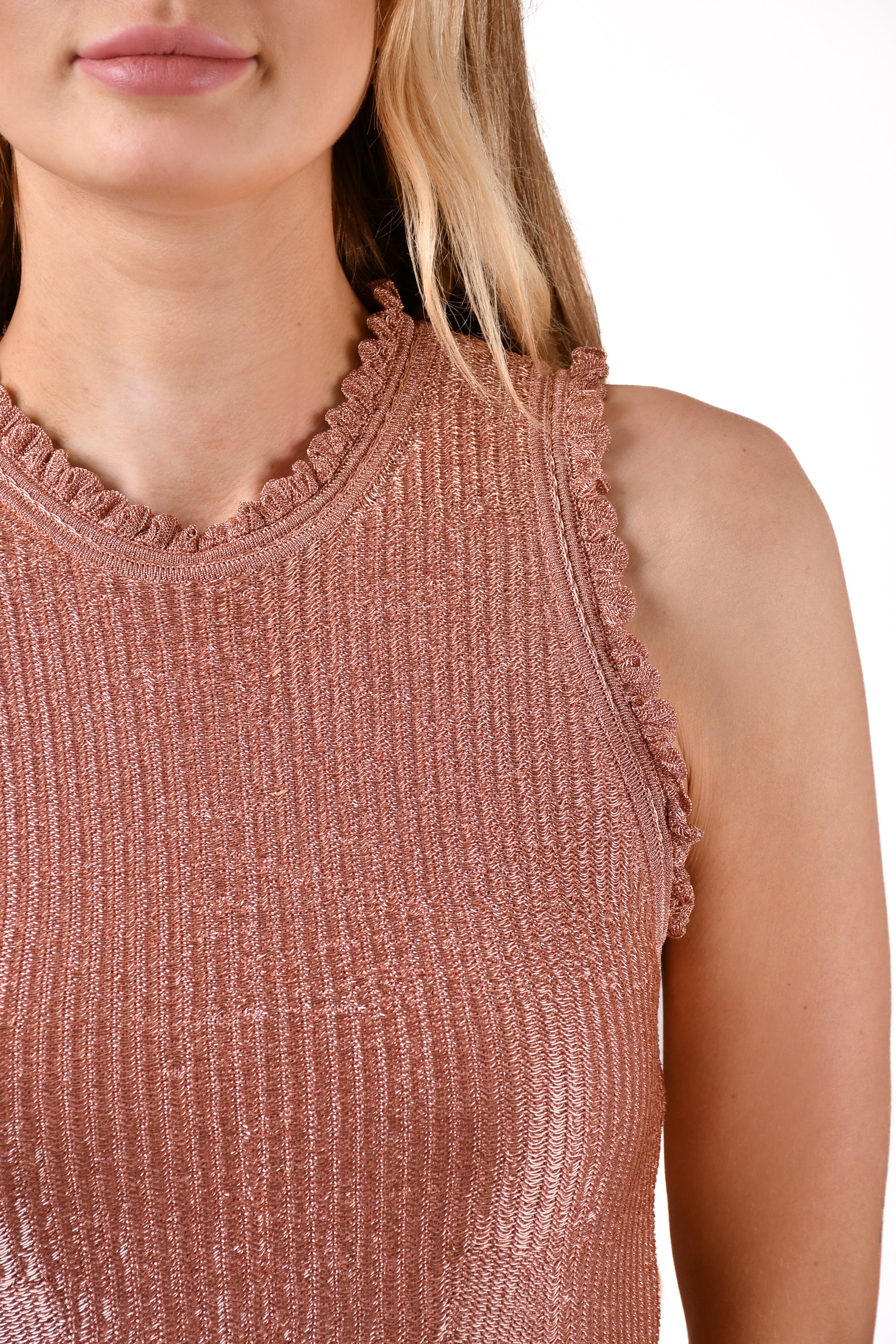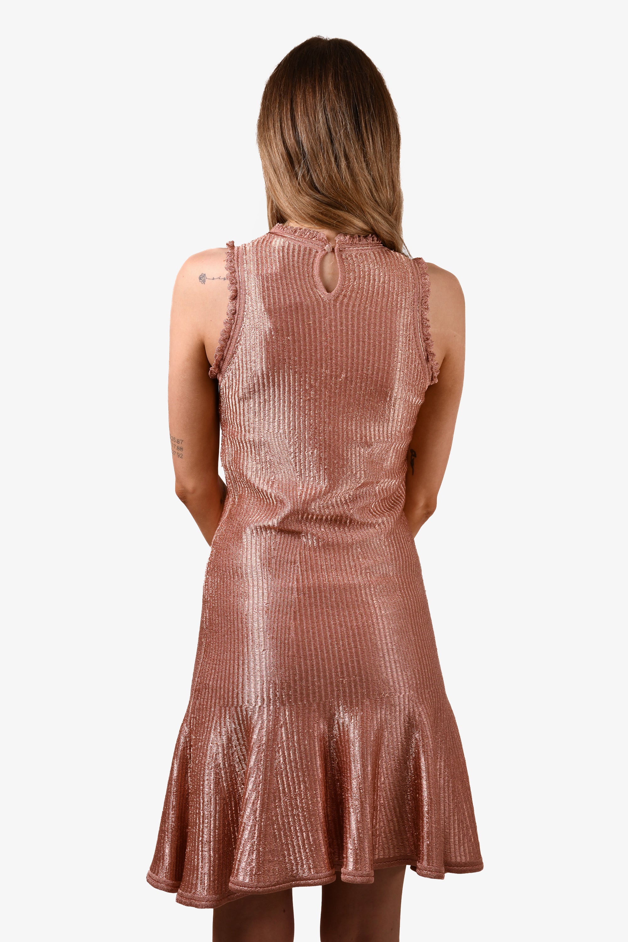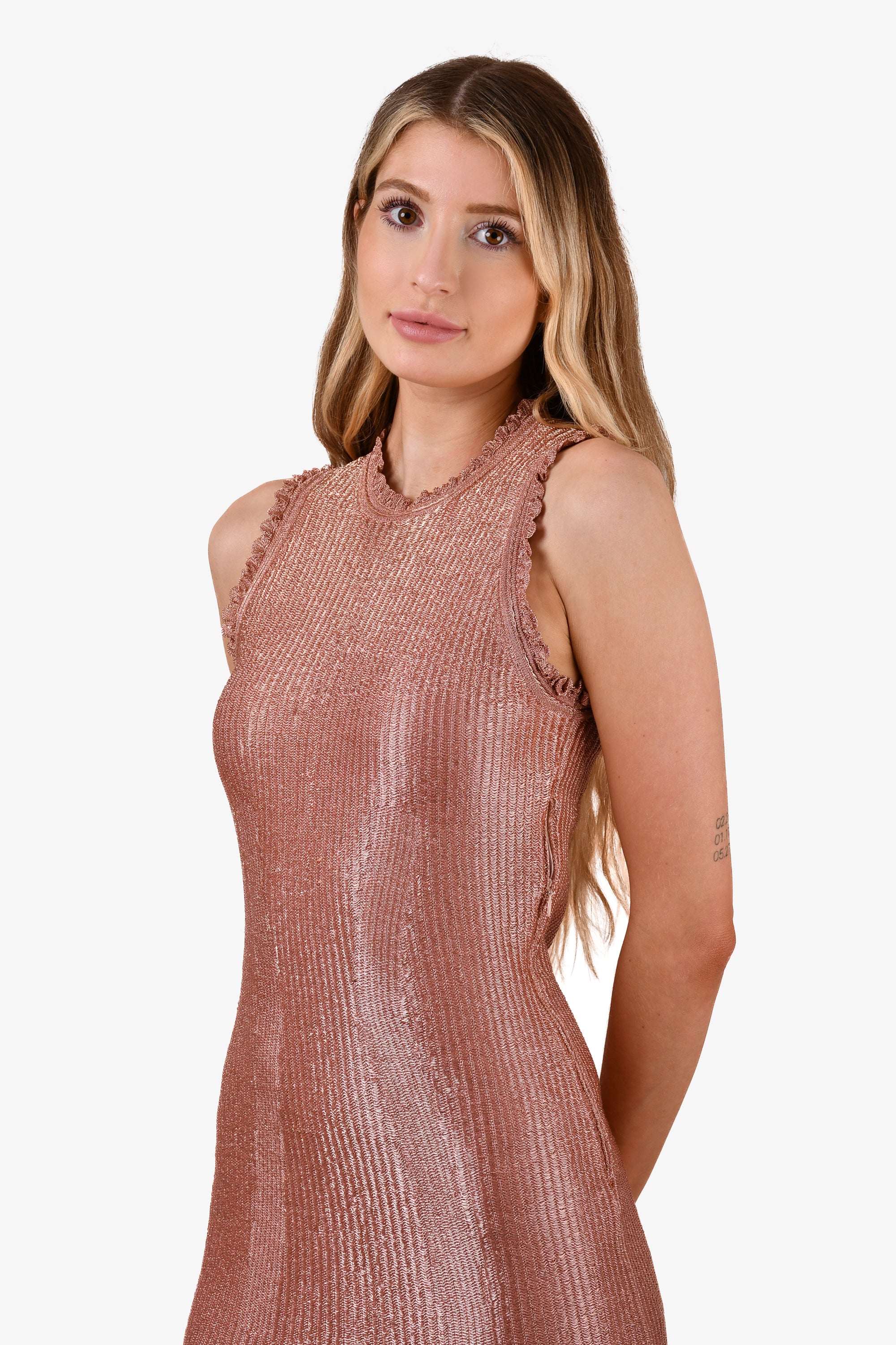 Alexander McQueen Pink Metallic Sleeveless Mini Dress. Pull on. Tonal stitching.