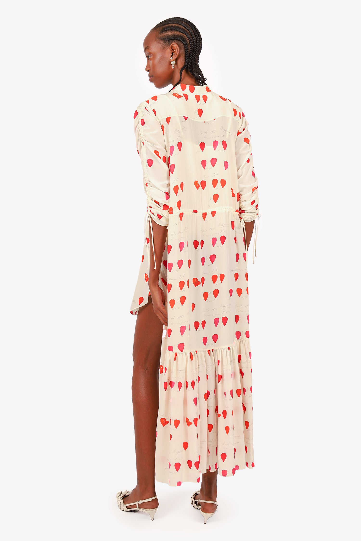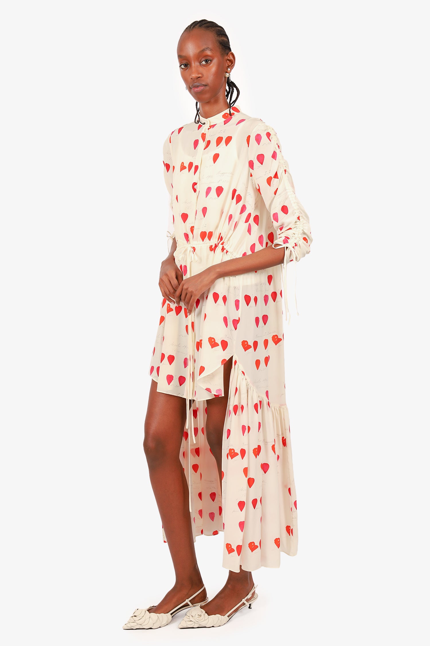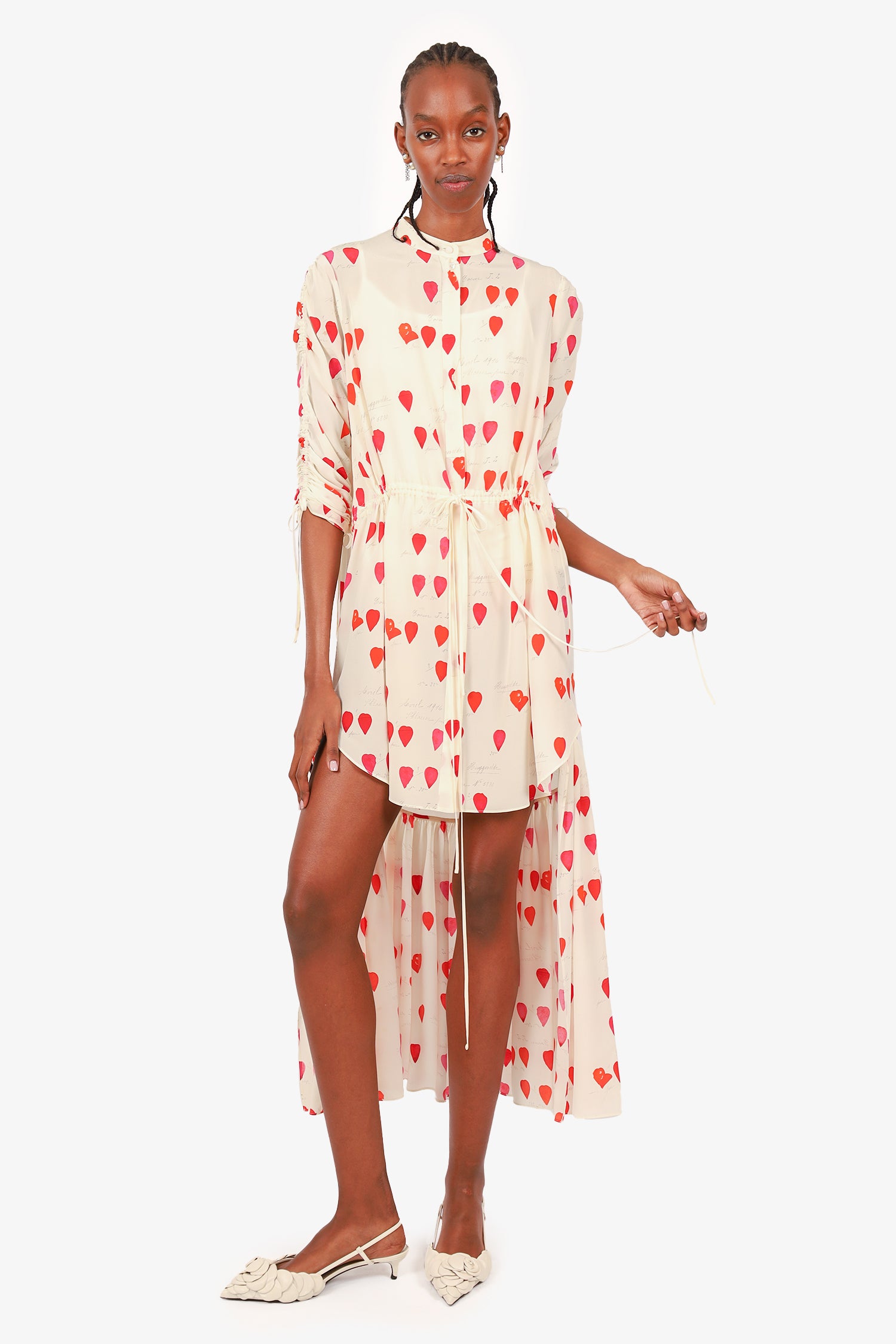 Refresh availabilityAlexander McQueen White/Red Heart Print Silk Dress. Front button closure. Lined. High-Low hem. Tie ruched sleeves. Waist belted. Tonal stitching.