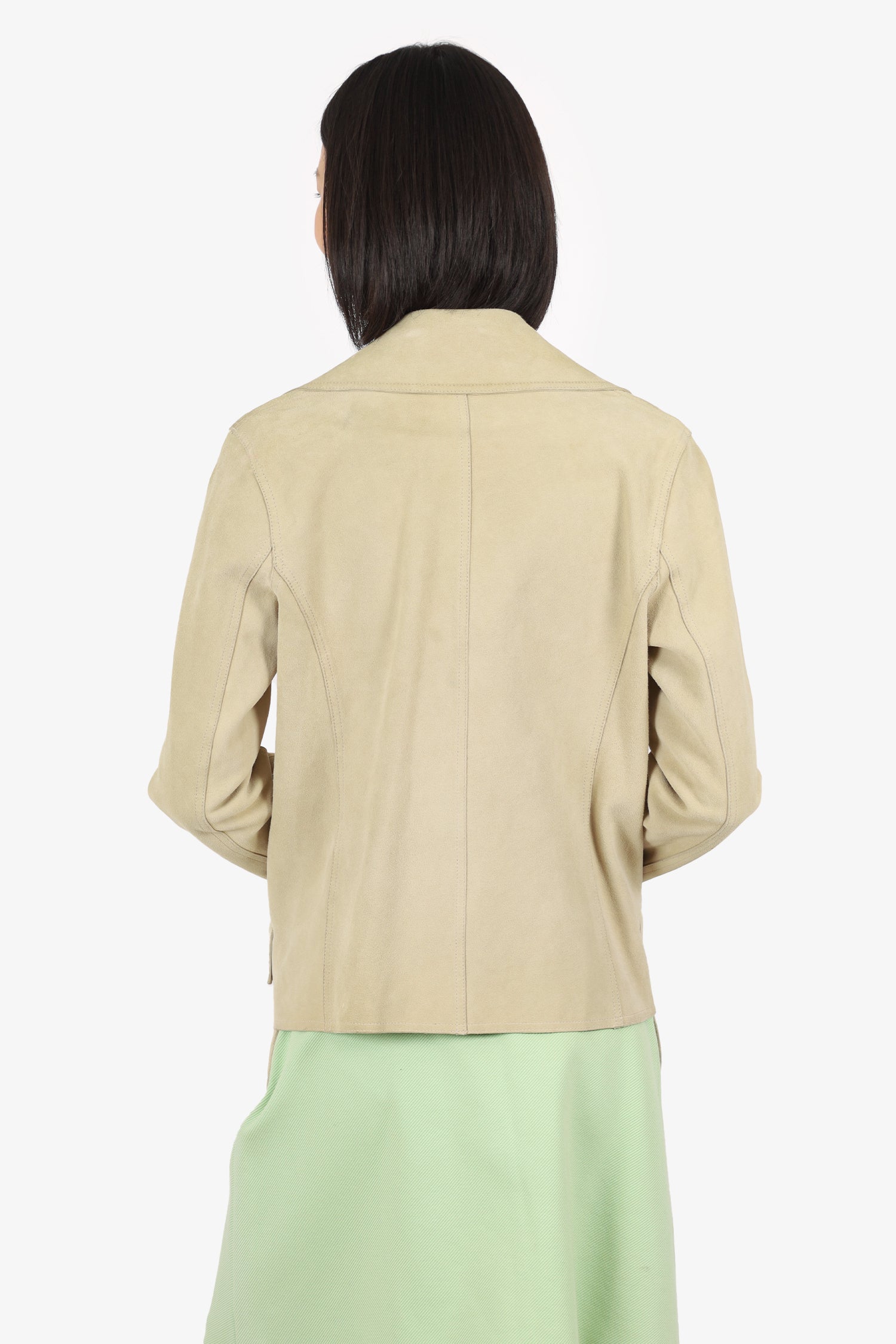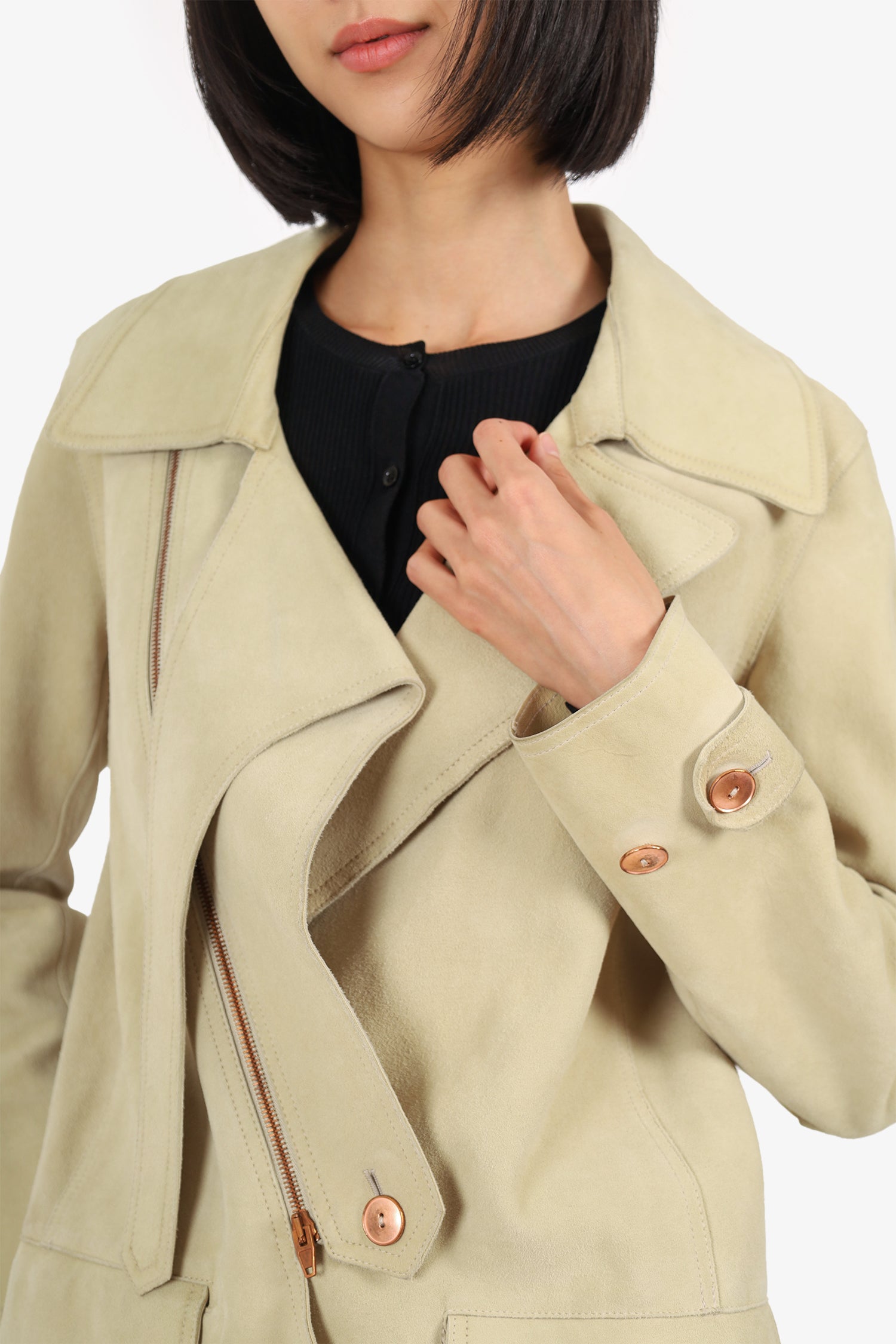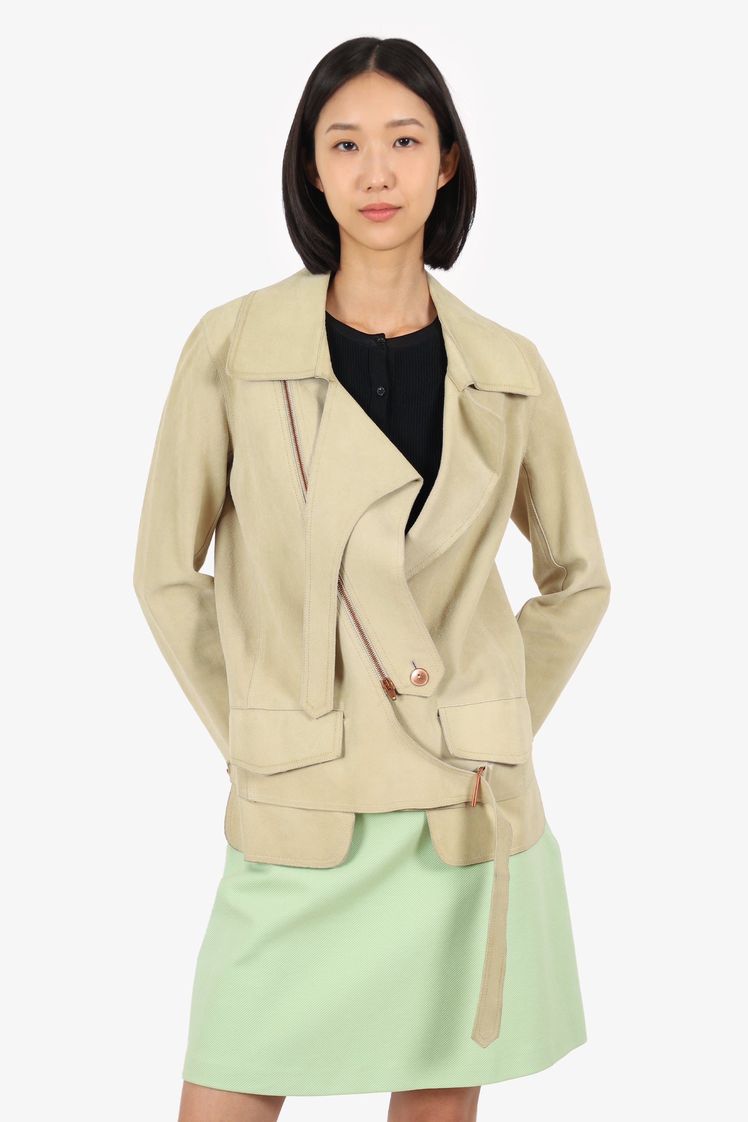 Refresh availabilityAlexander Wang Beige Suede Biker Jacket. Pull-on. Collared-neckline. Front zip and button-up closure. Sleeve cuffs with button-up closure. Buckle closure ar bottom hem. 2 front exterior flap pockets. Bronze-tone hardware. Tonal stitching.