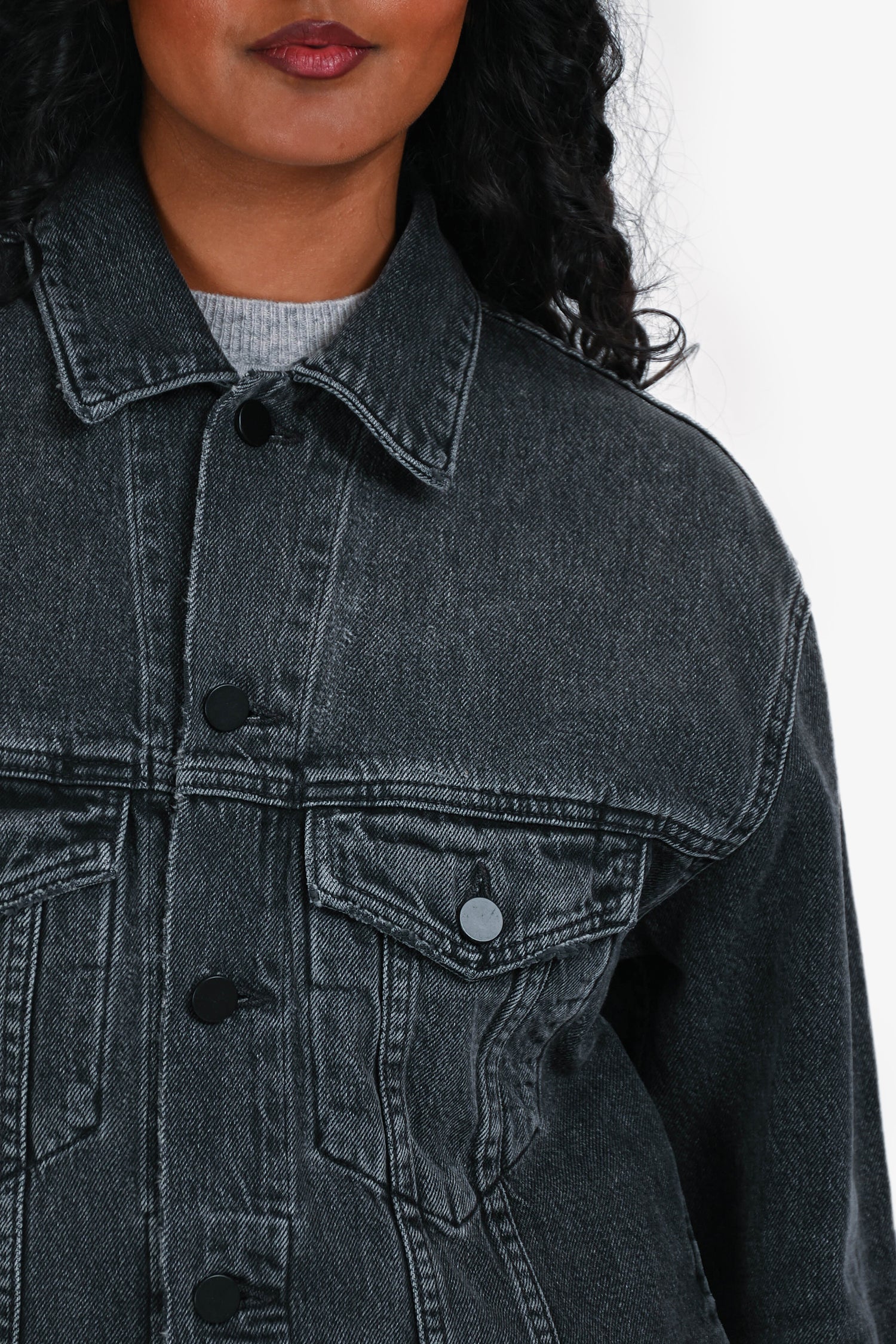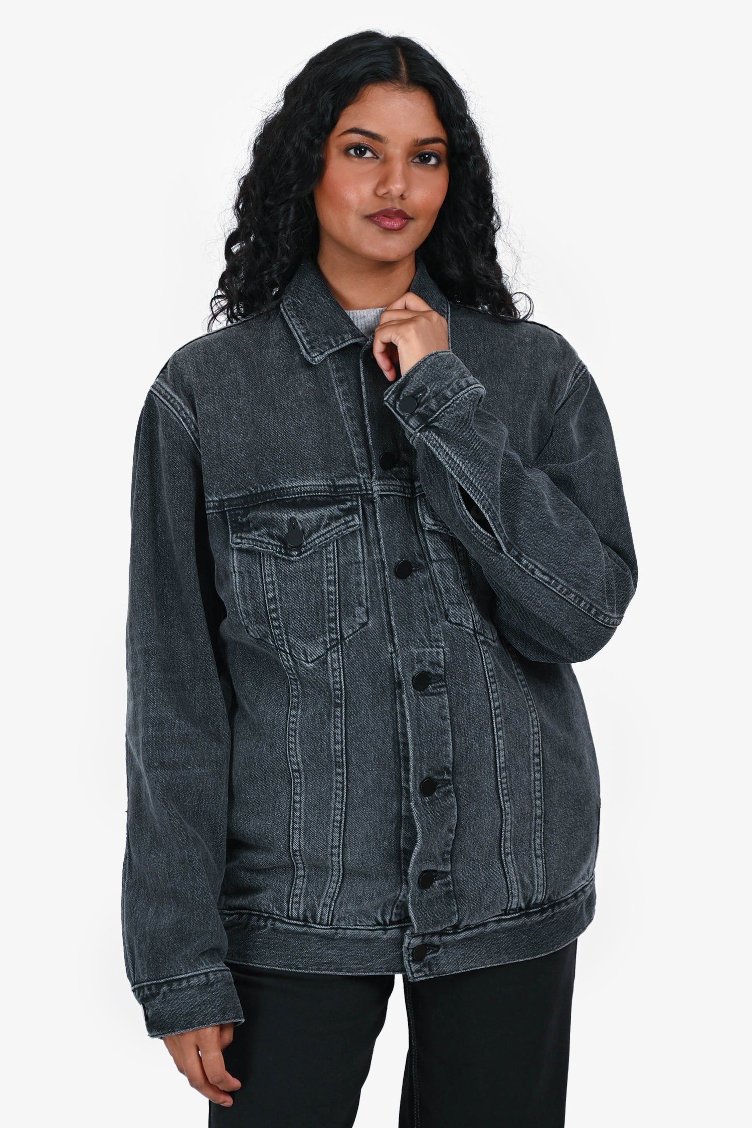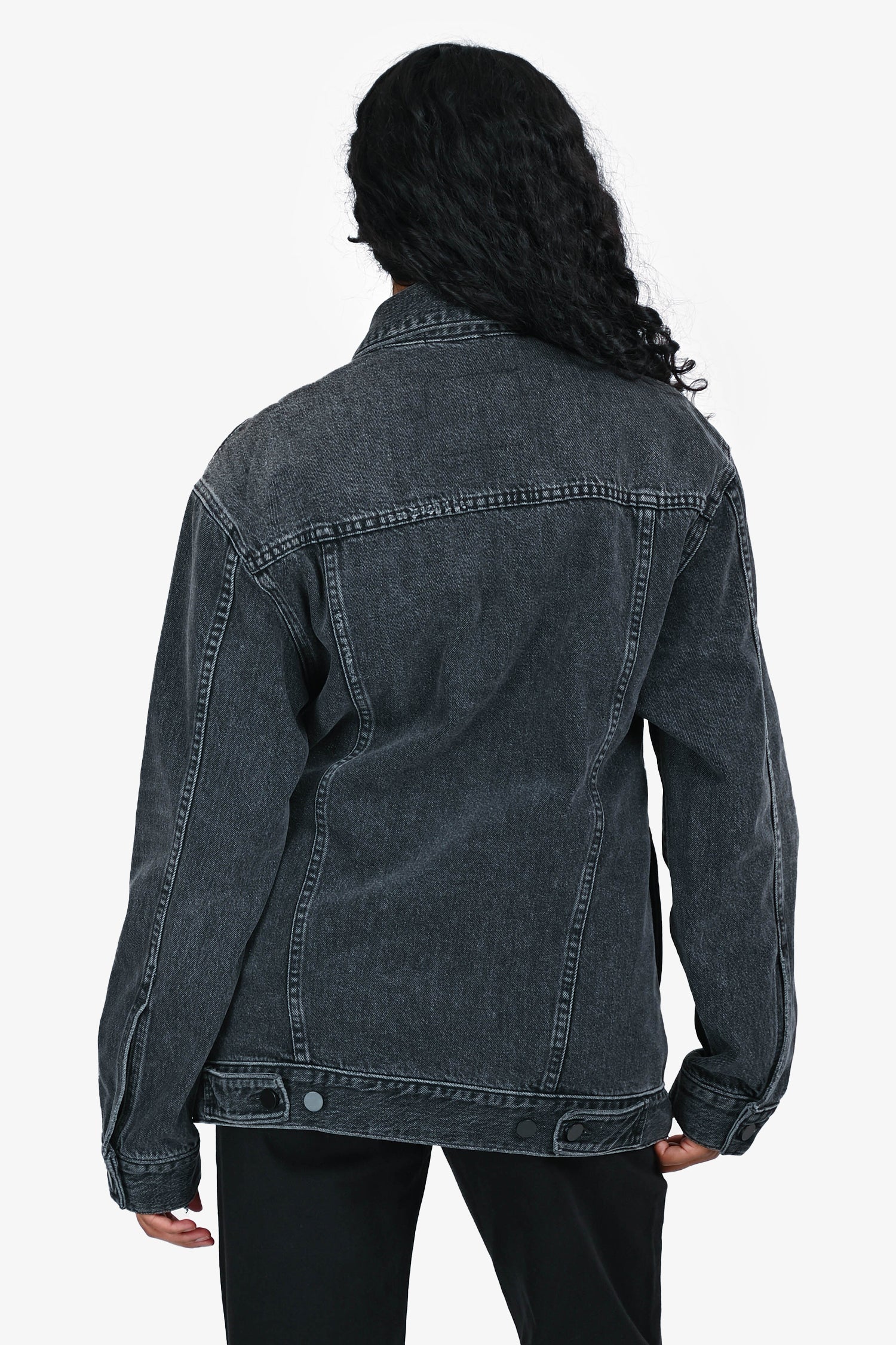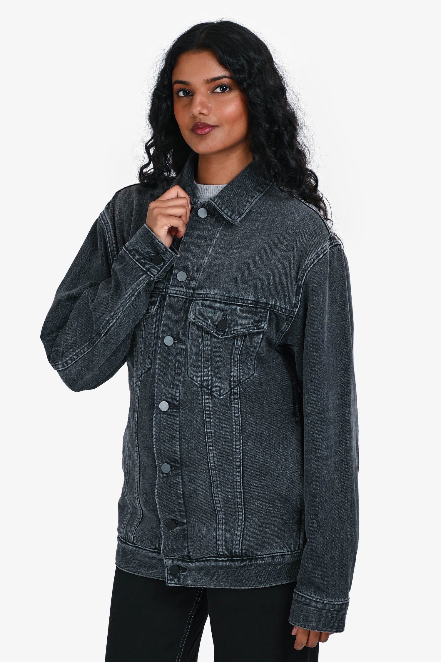 Refresh availabilityAlexander Wang Black Denim Button Up Jacket. Collared neckline. Front button closure. Two front patch pockets with button closure. Two interior slip pockets. Buttoned cuffs. Adjustable button detailing at the bottom hem. Black-tone hardware. Tonal stitching.