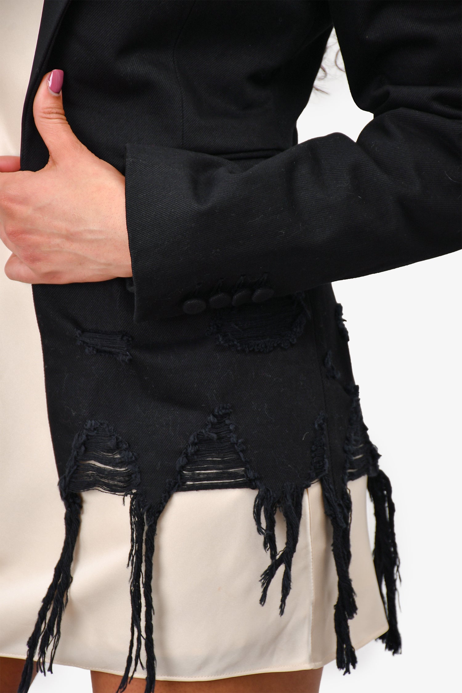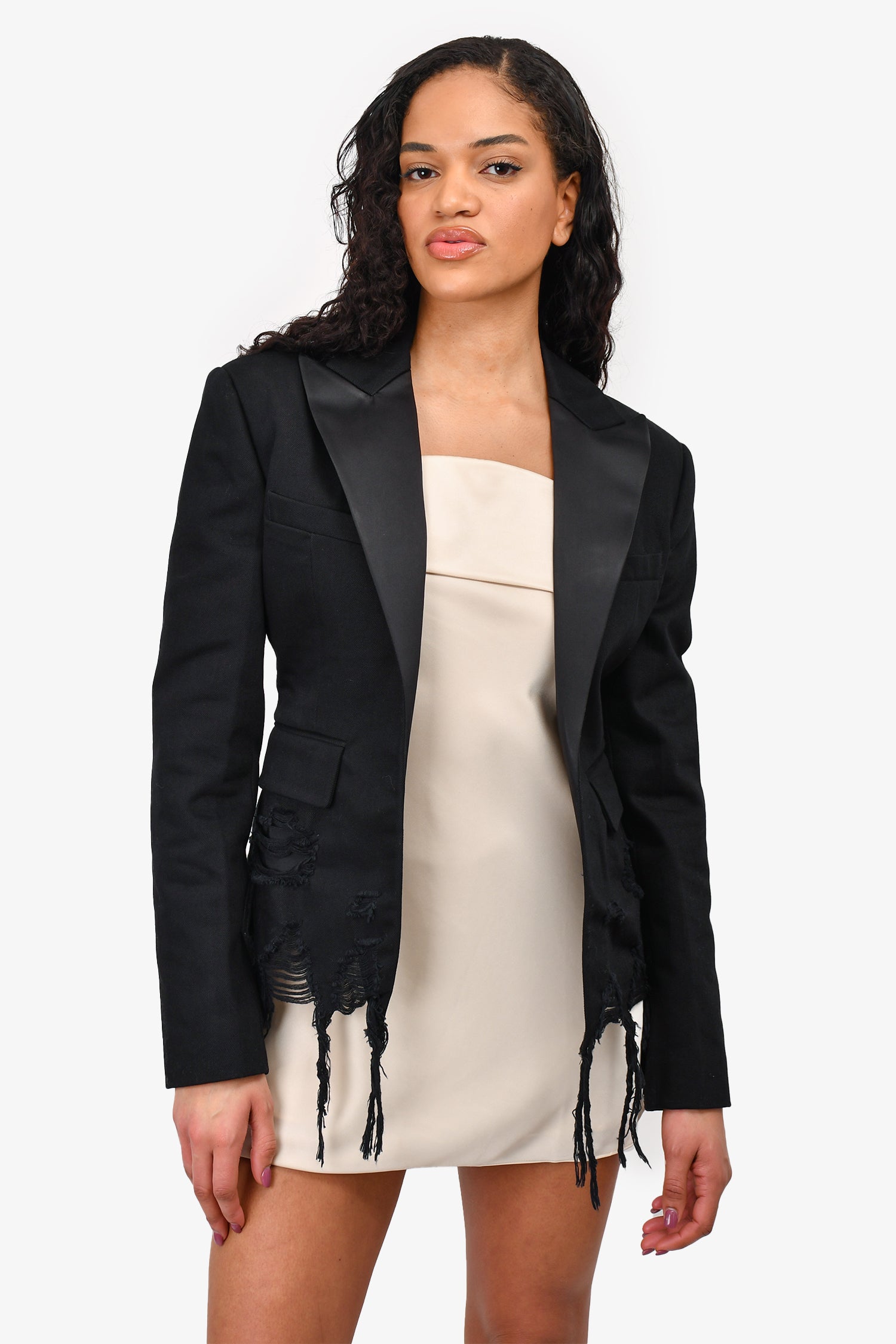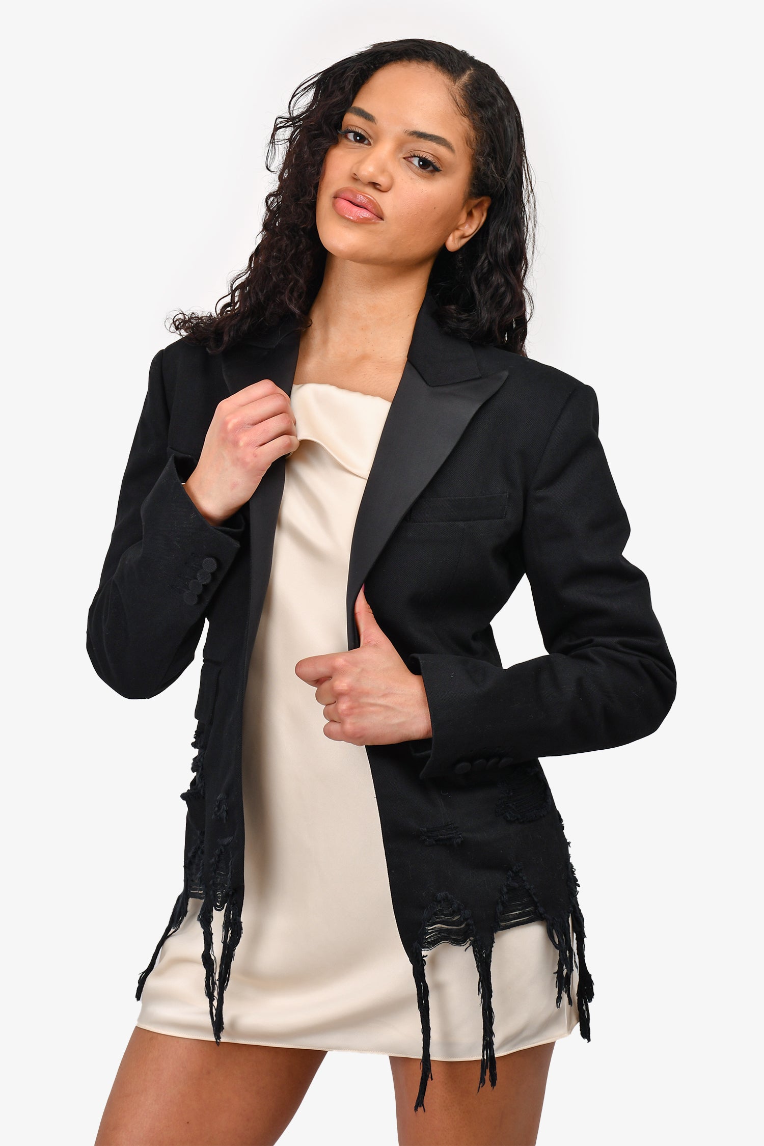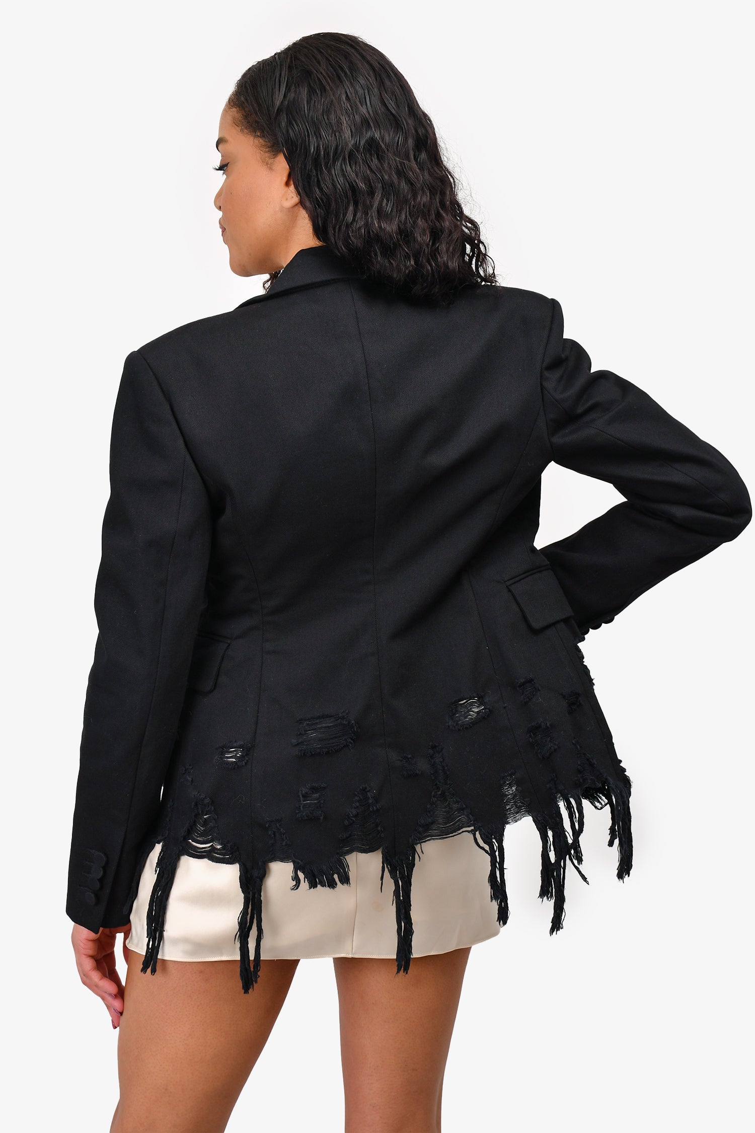 Refresh availabilityAlexander Wang Black Distressed Denim Blazer with Satin Lapel. Peak Satin Lapels. Distressed on the hem. Tonal stitching.