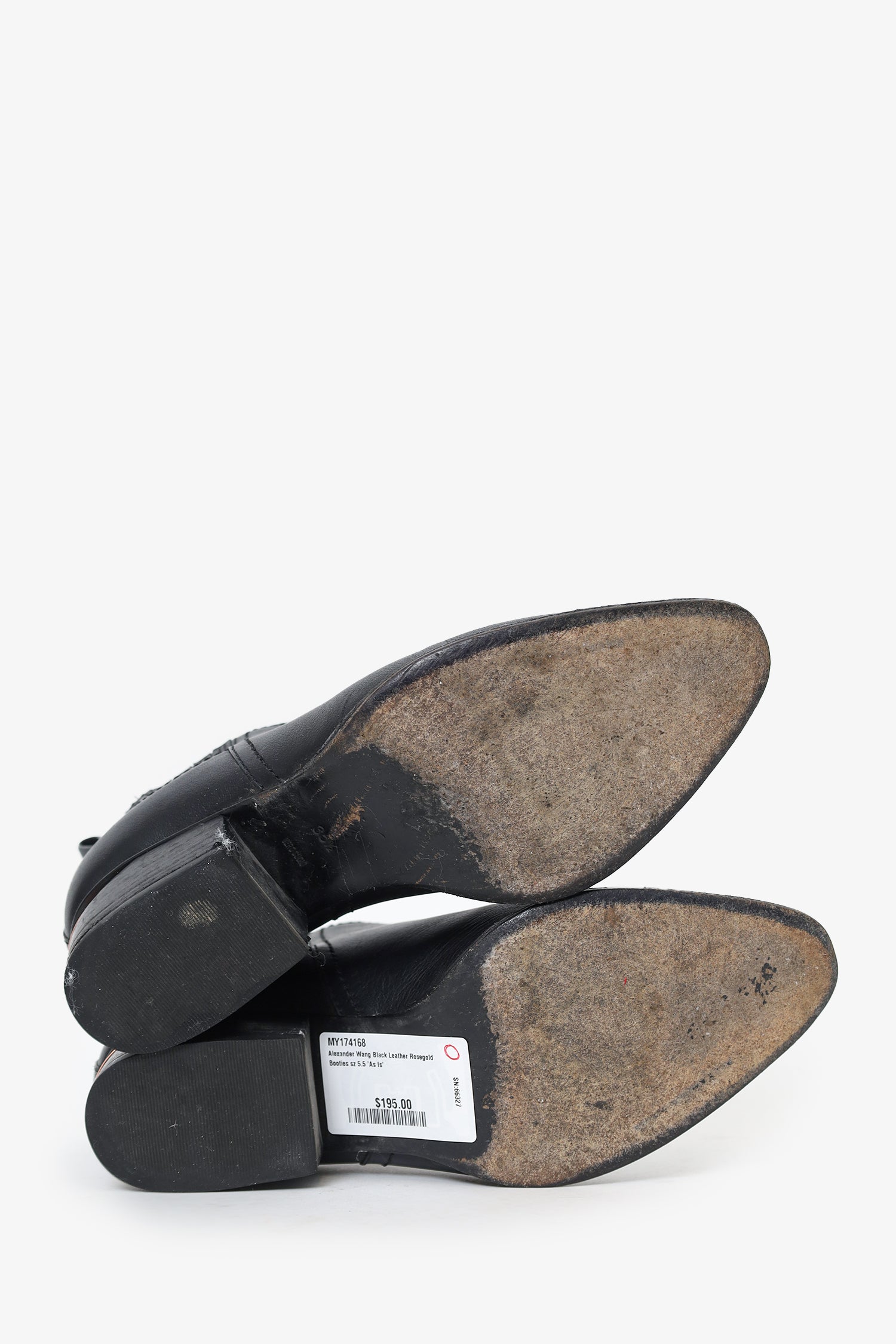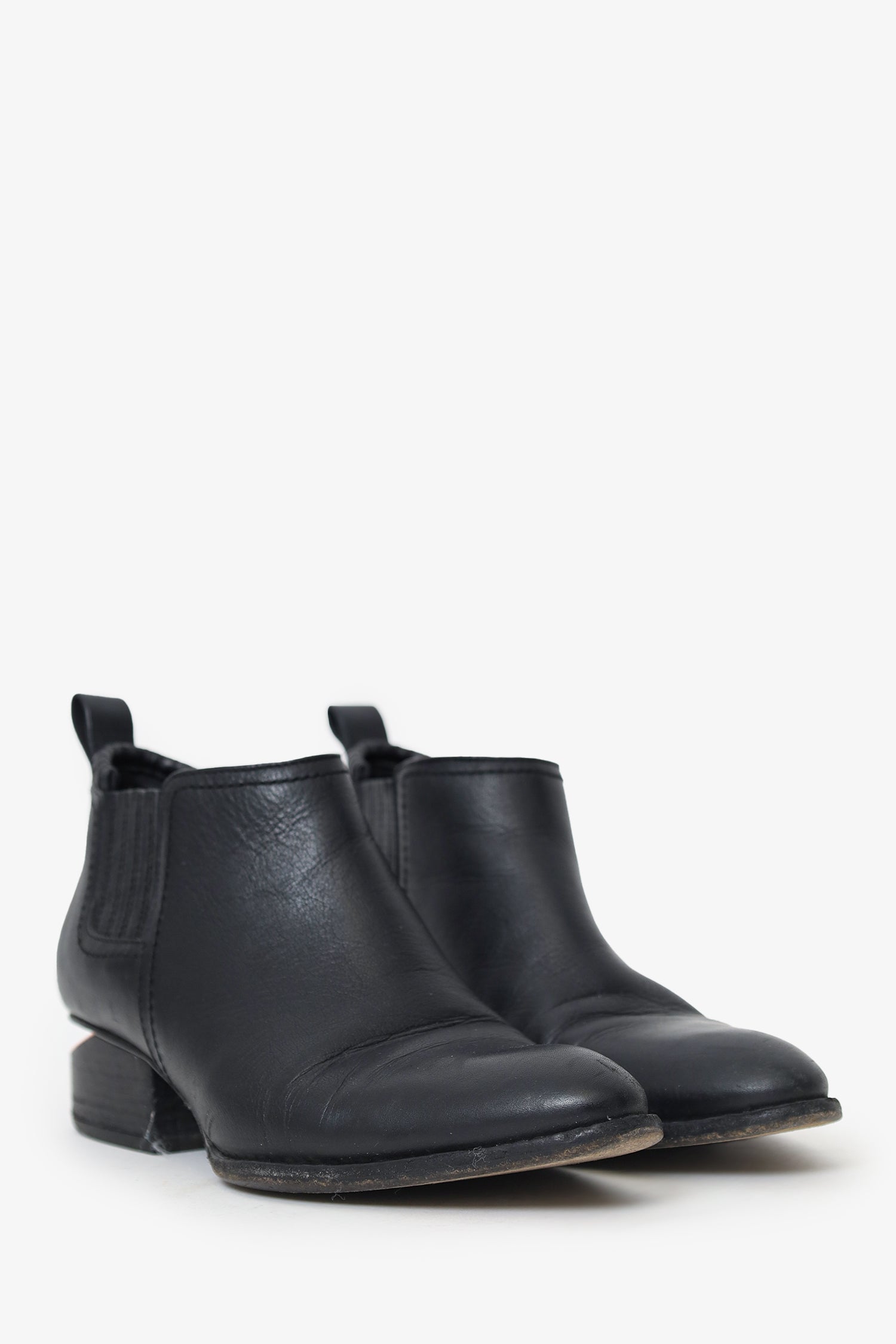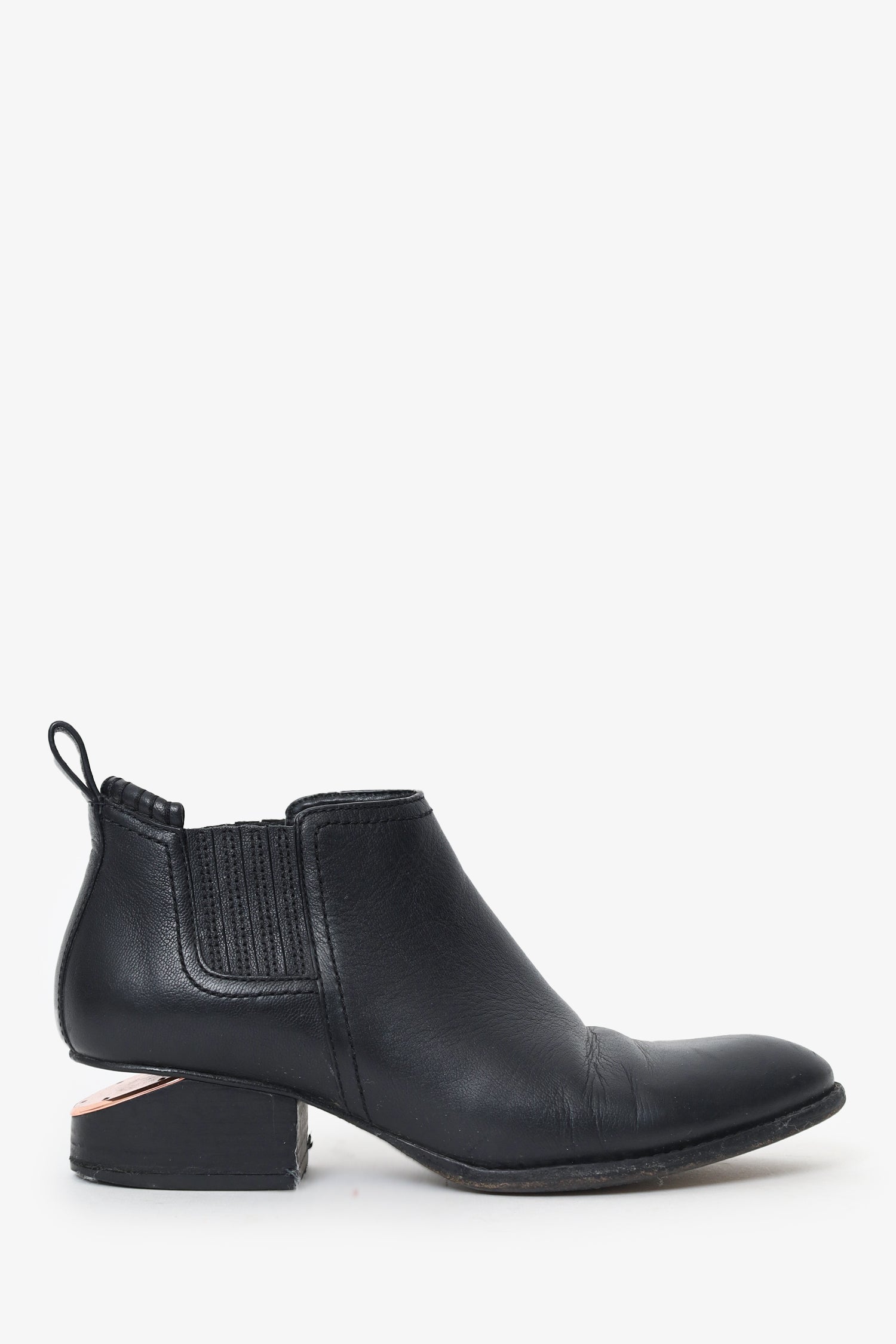 Refresh availabilityAlexander Wang Black Leather Rose Gold Booties. Pull-on. Pointed toe. Elasticized panels on sides. Rear pull-tabs. Metal embellishment on heel. Rose gold-tone hardware. Tonal stitching.