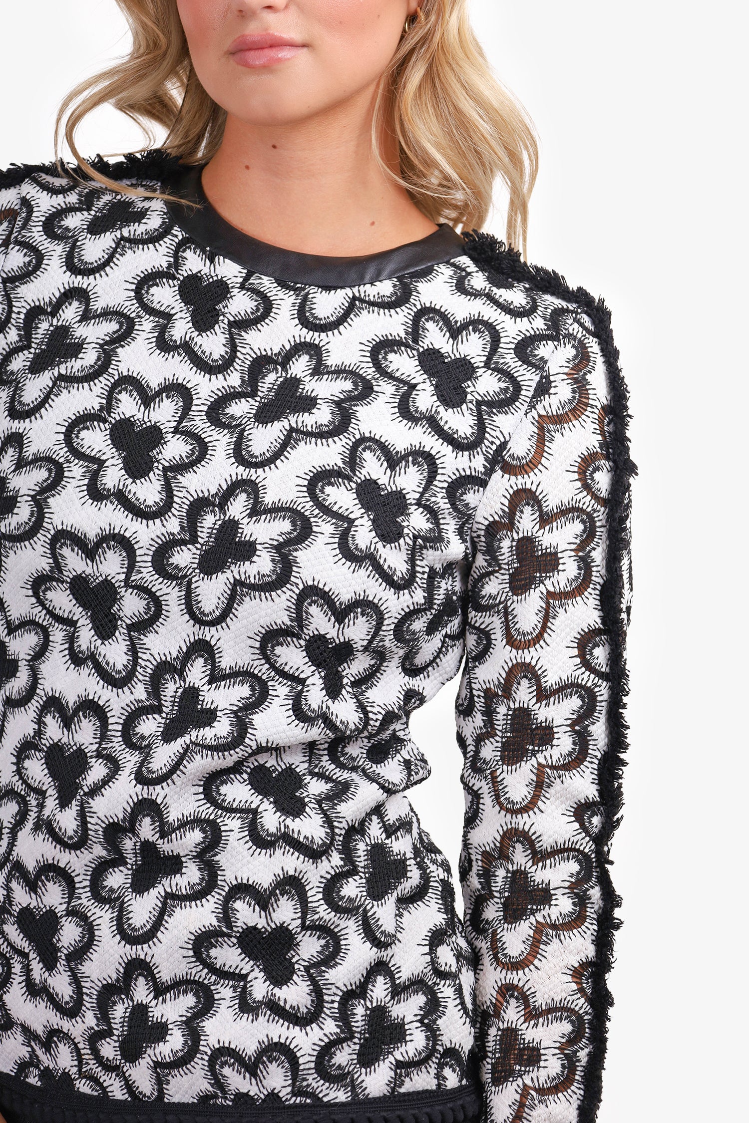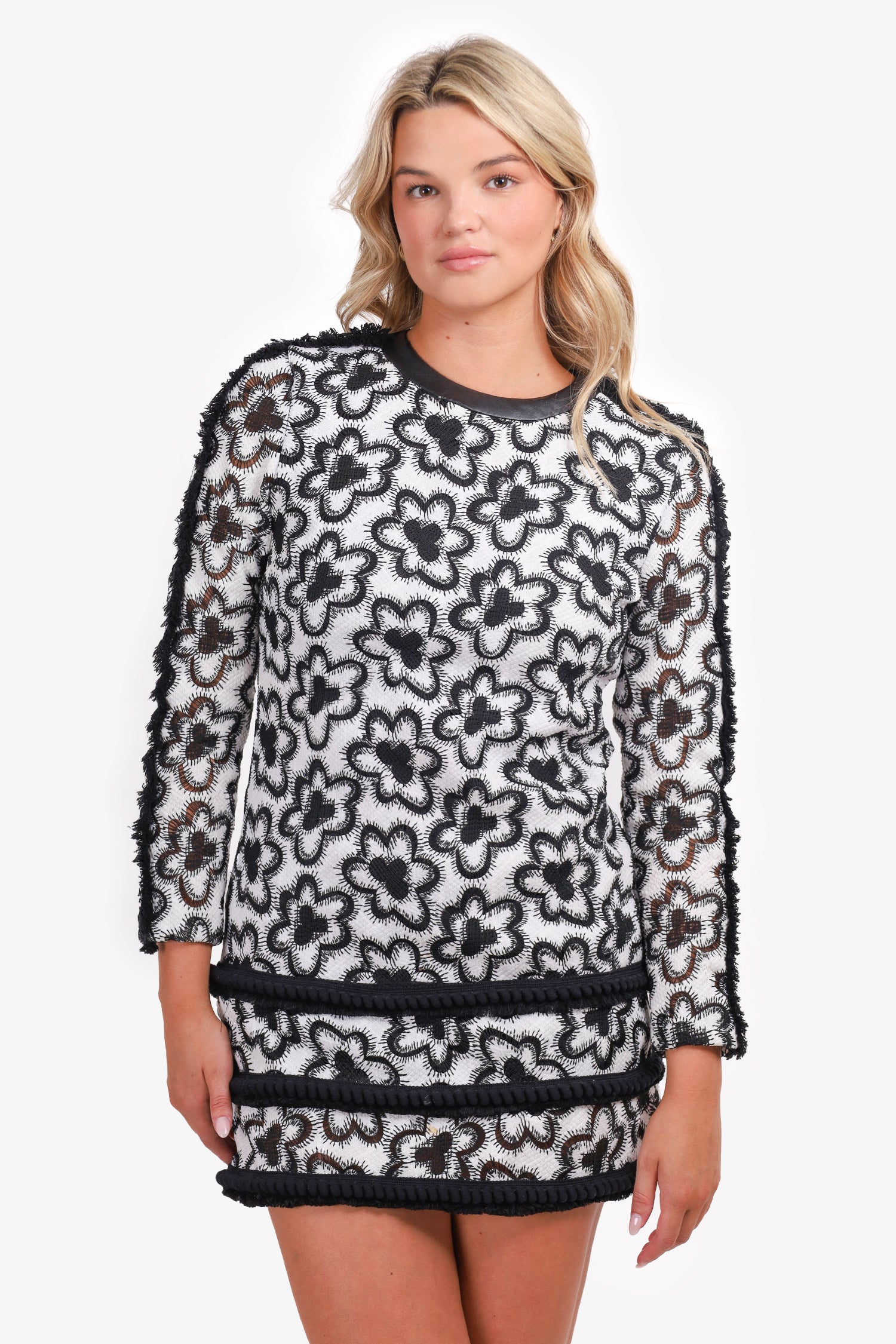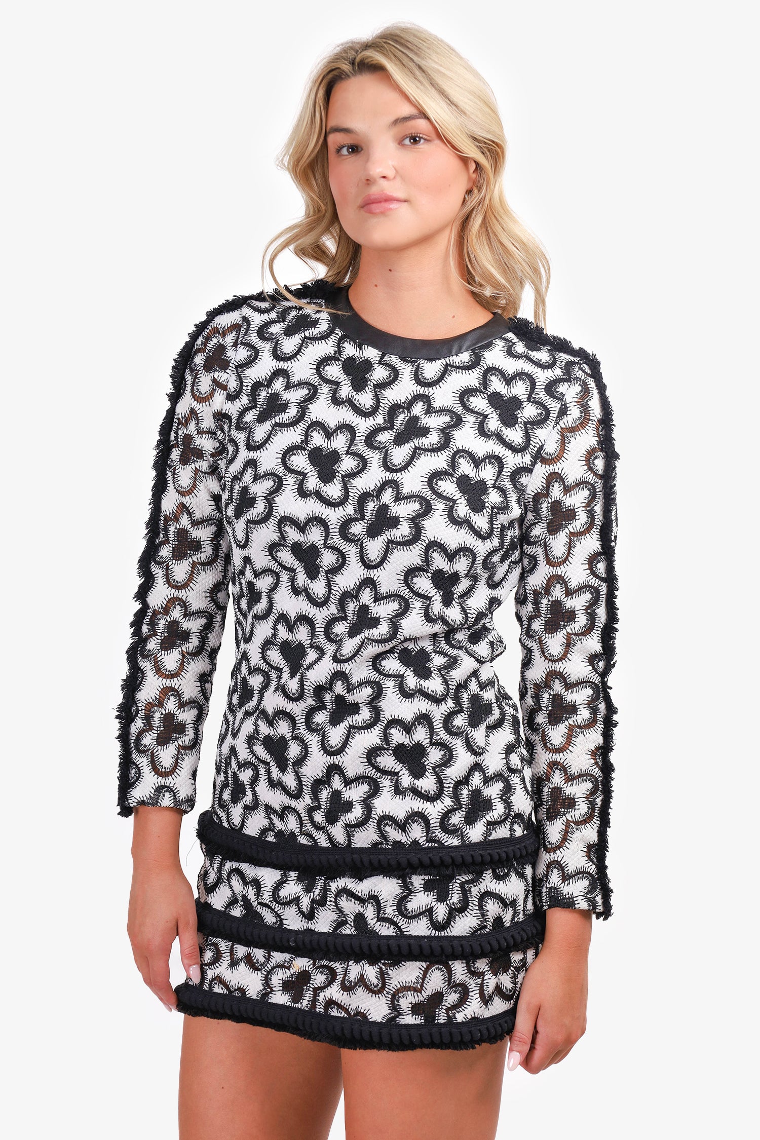 Refresh availabilityAlexis Black/White Edna Fringe Dress. Round neckline. Back zip closure. 3 tiered tassel fringe skirt. Fringe sleeve detail. Lined. Tonal stitching. Silver-tone hardware.