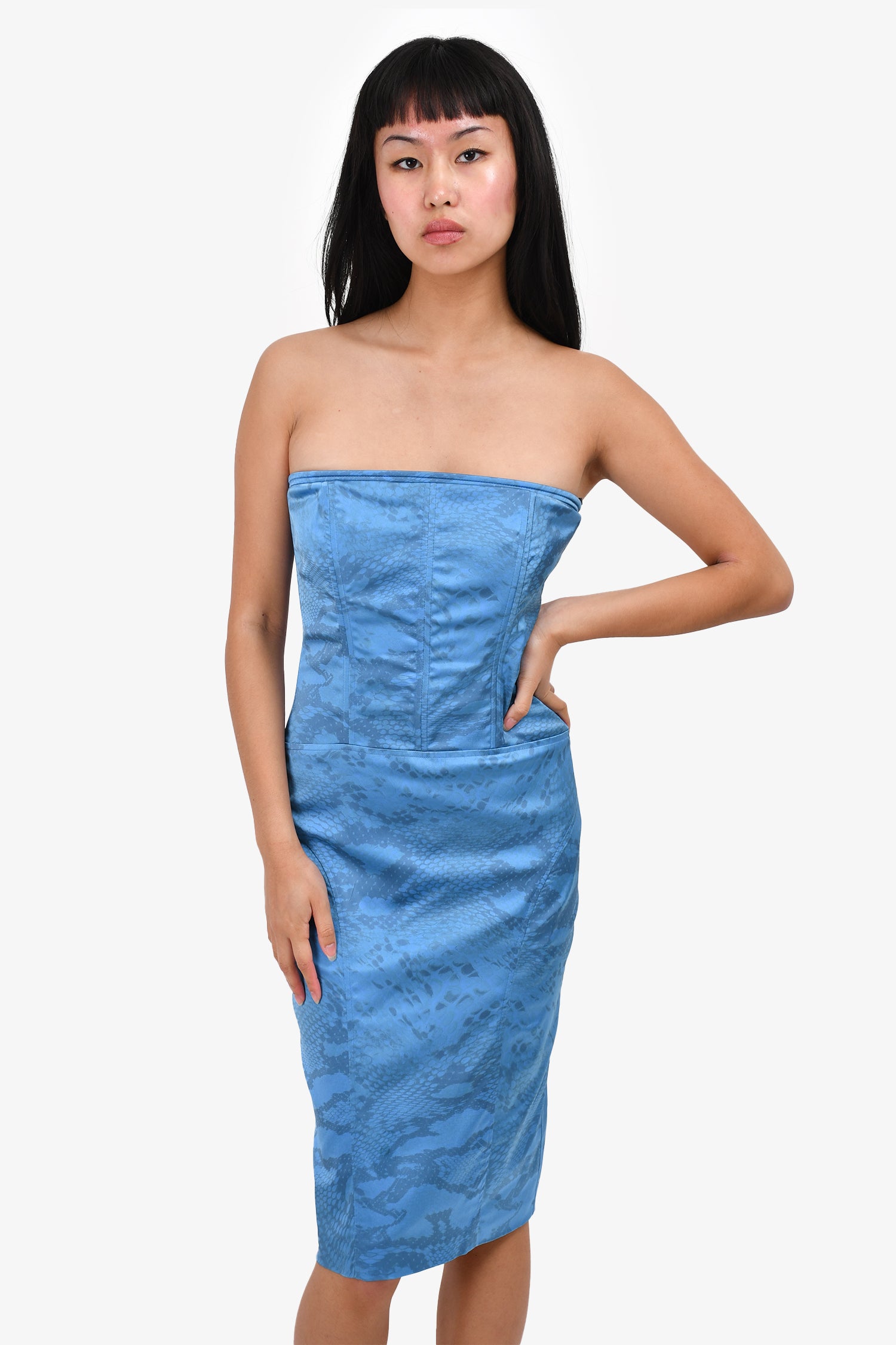 Refresh availabilityAlexis Blue Snake Printed Strapless Midi Dress. Interior bodice. Rear zip and hook closure. Lined. *Pinned on model