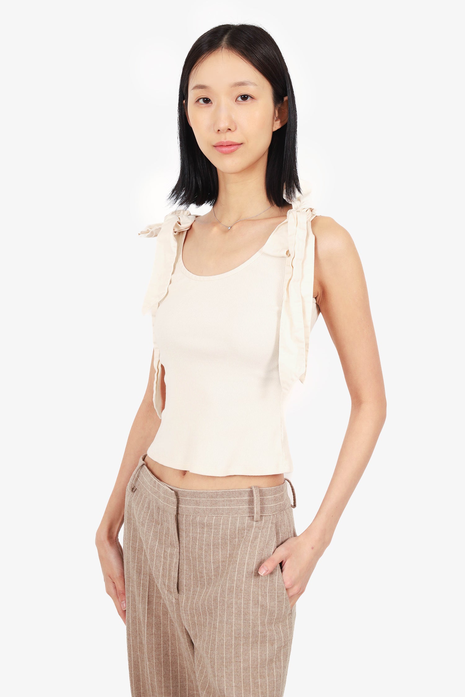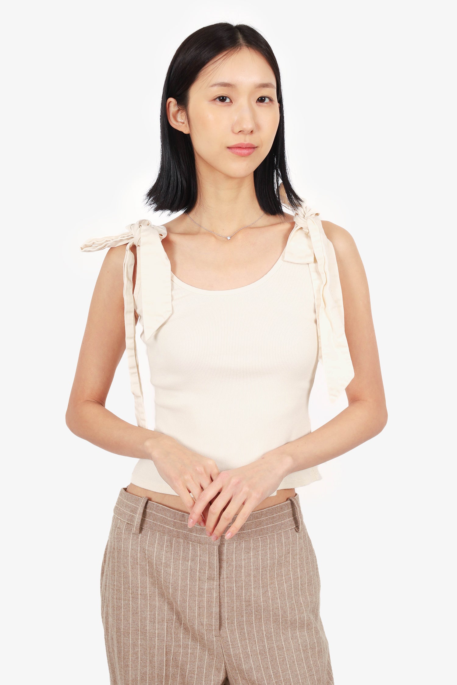Refresh availabilityAlexis Cream Bow Detail Tank Top. Pull-on. Round neckline. Self-tie bow details on both shoulder. Unlined. Tonal stitching.