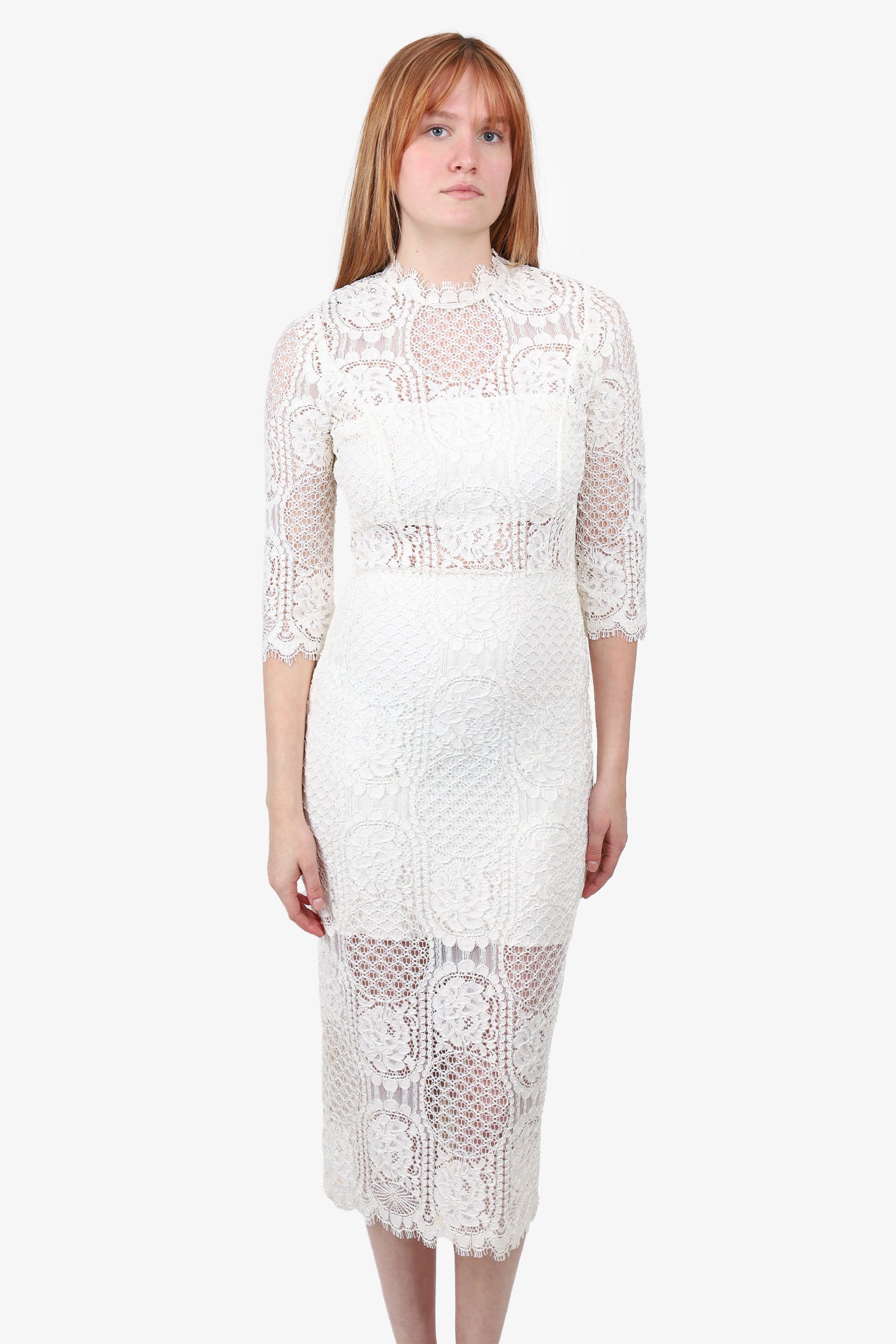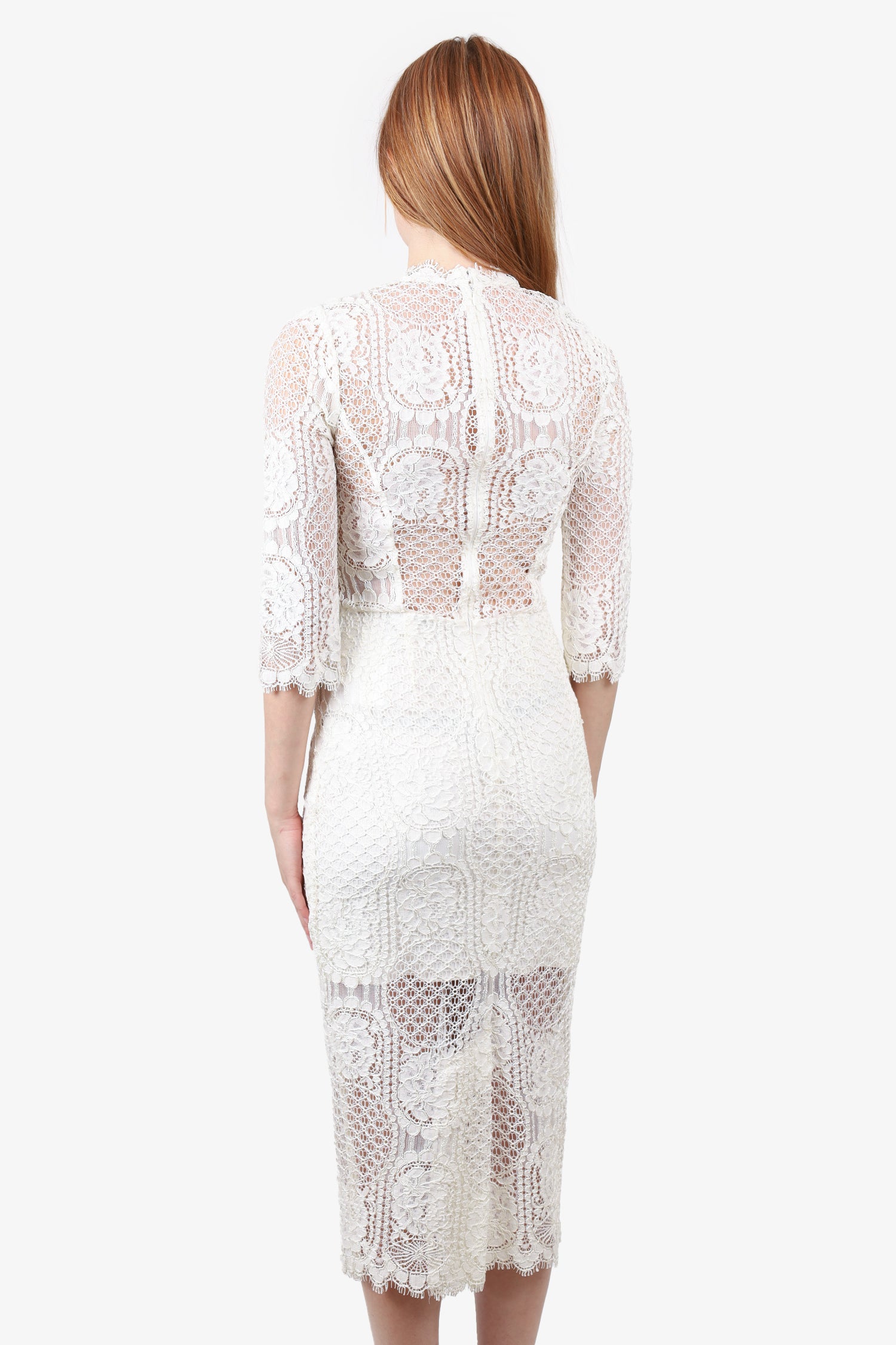 Refresh availabilityAlexis White Eyelet Lace Midi Dress with 3/4 Sleeves. Round neckline. Rear zip closure. Lined. Tonal stitching.