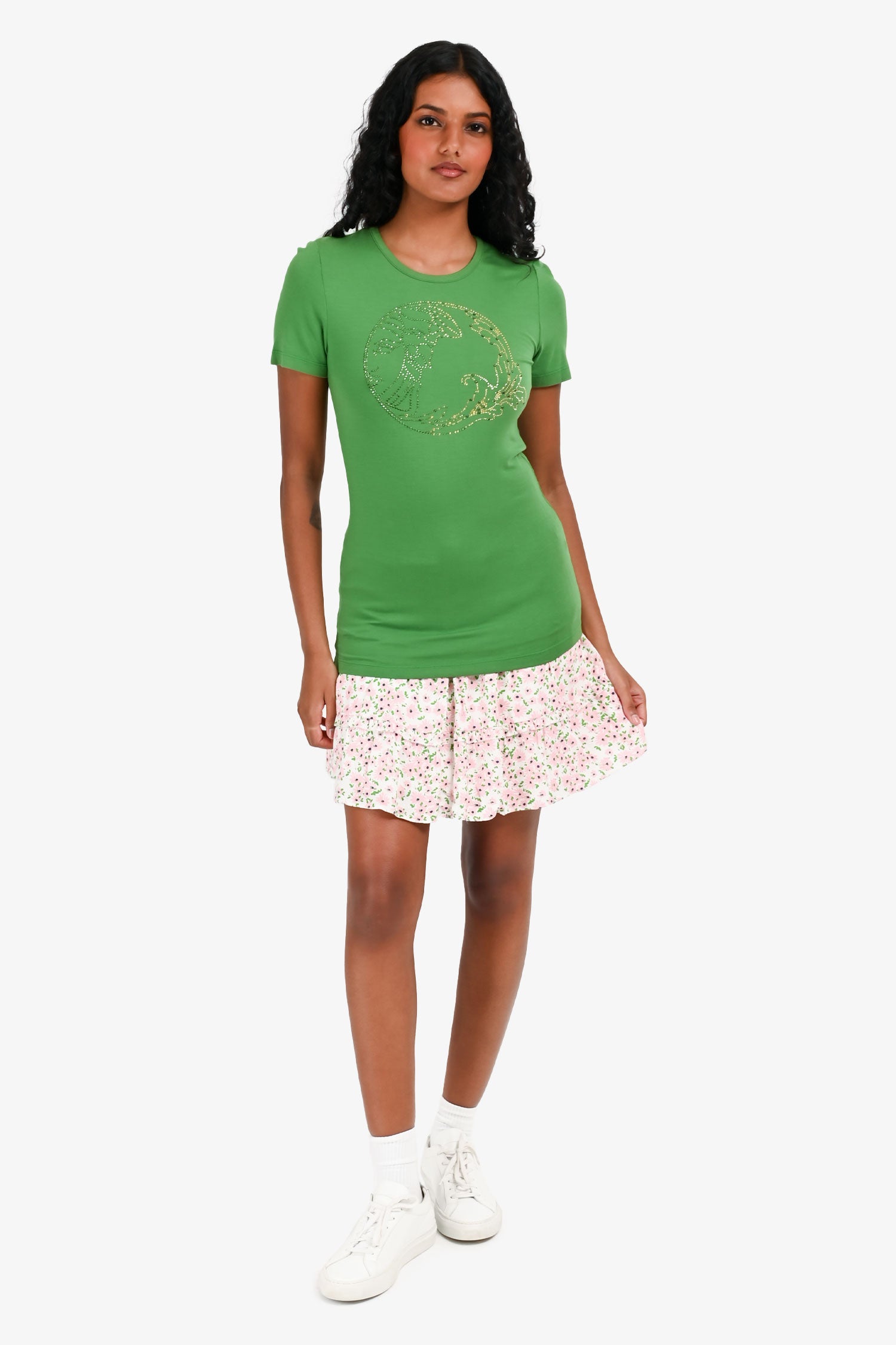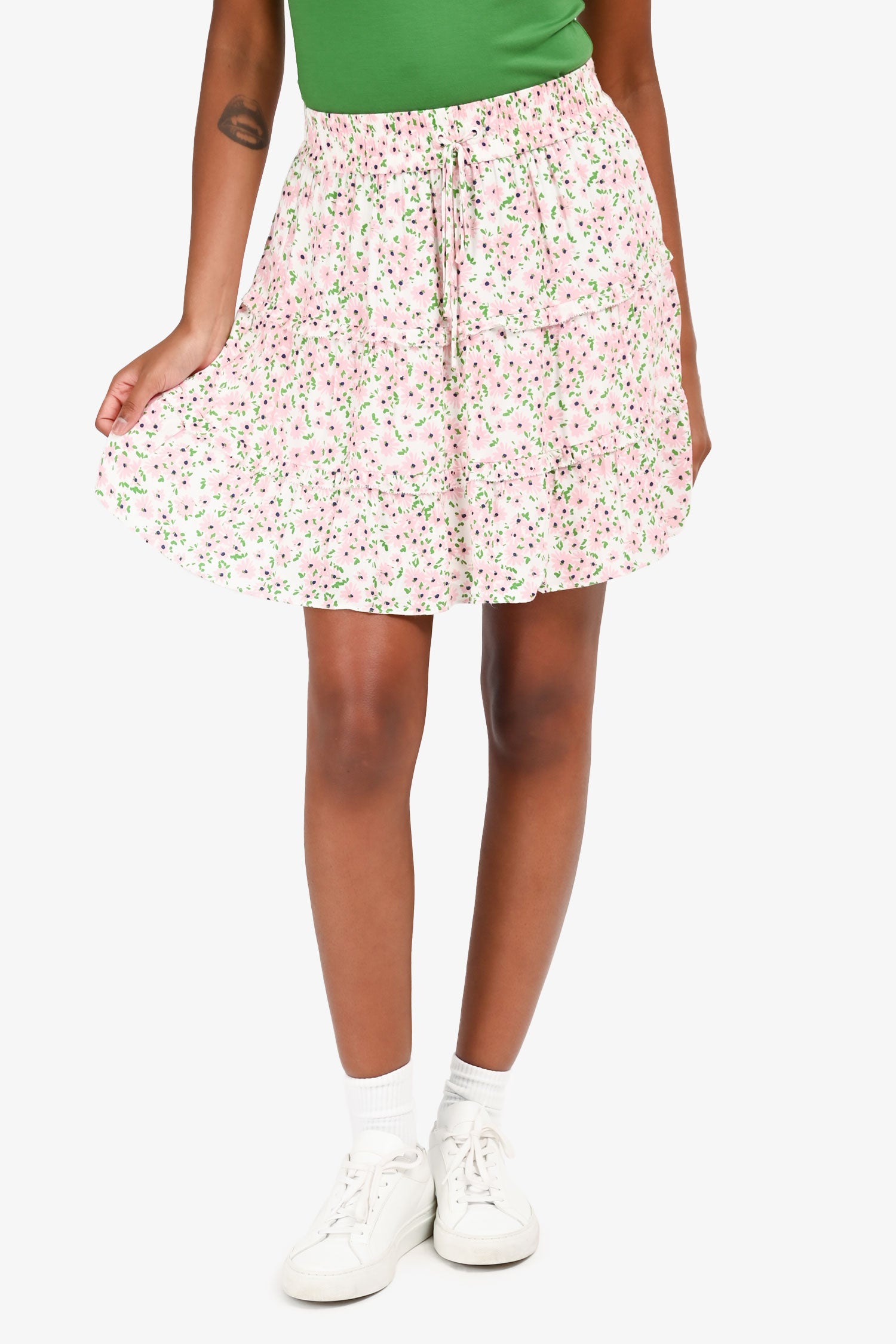 Refresh availabilityAlice + Olivia Pink/White Floral Print Tiered Mini Skirt. High-rise. Elastic waistband with front adjustable drawstring. Tiered ruffle design. Tonal stitching.
