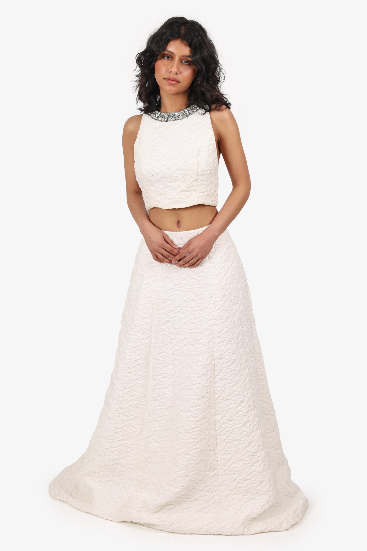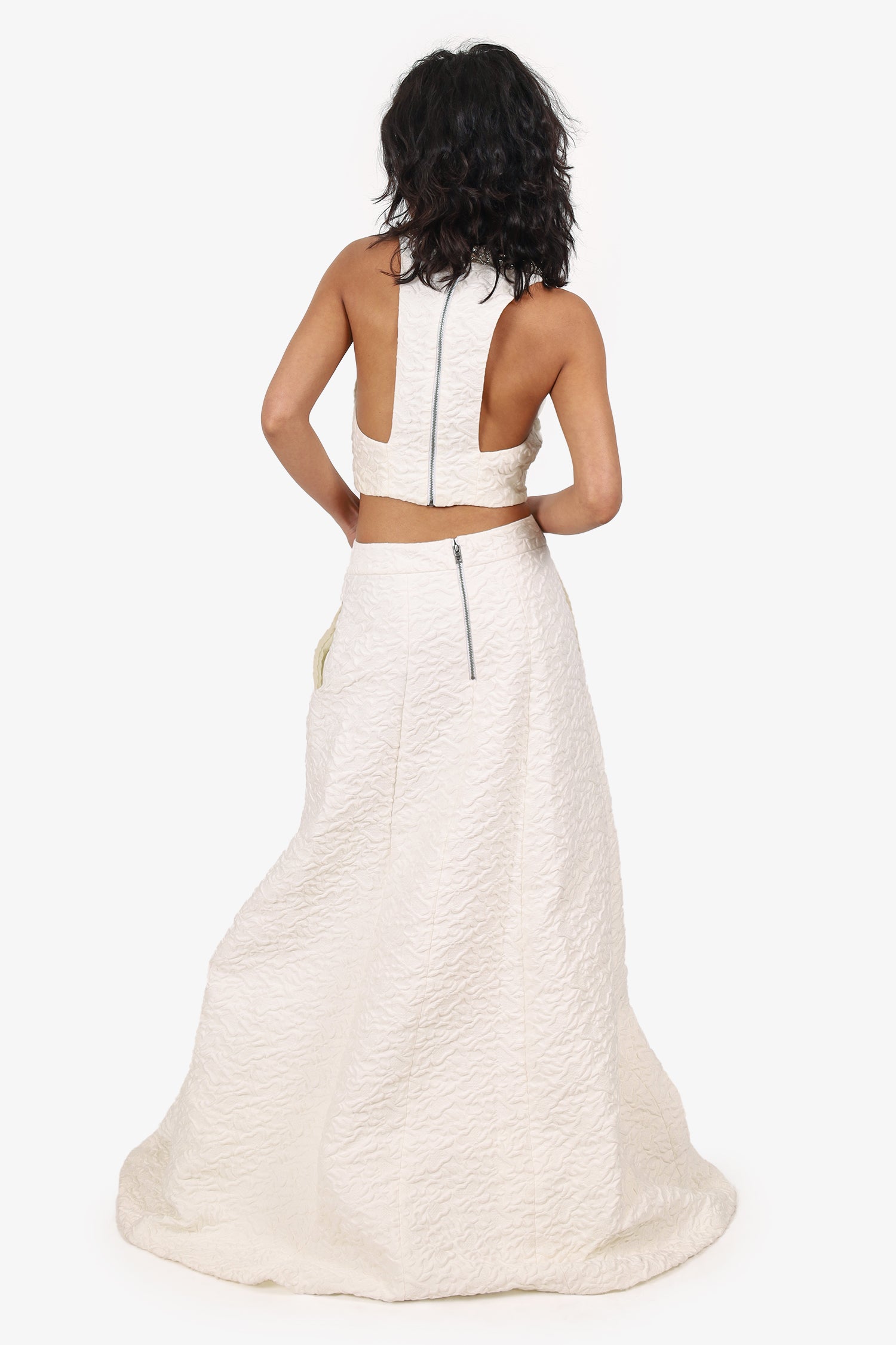 Refresh availabilityAlice + Olivia White Textured Maxi Skirt + Sleeveless Embellished Cropped Top. Top: Pull-on. Round neckline. Rear zip closure. Lined interior; Skirt: Slip-on. Rear zip and hook closure. Attached interior lining. Silver-tone hardware. Tonal stitching.