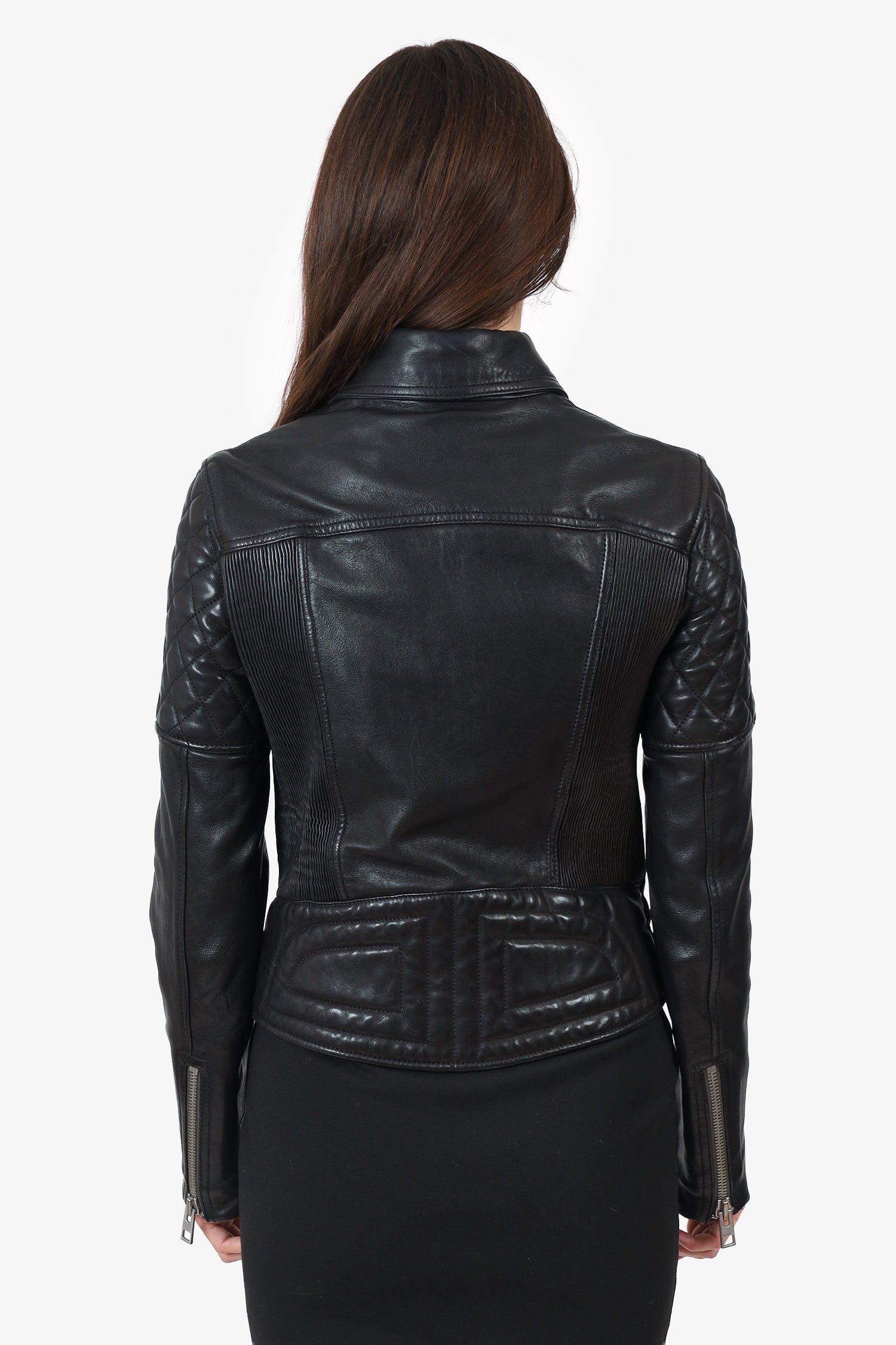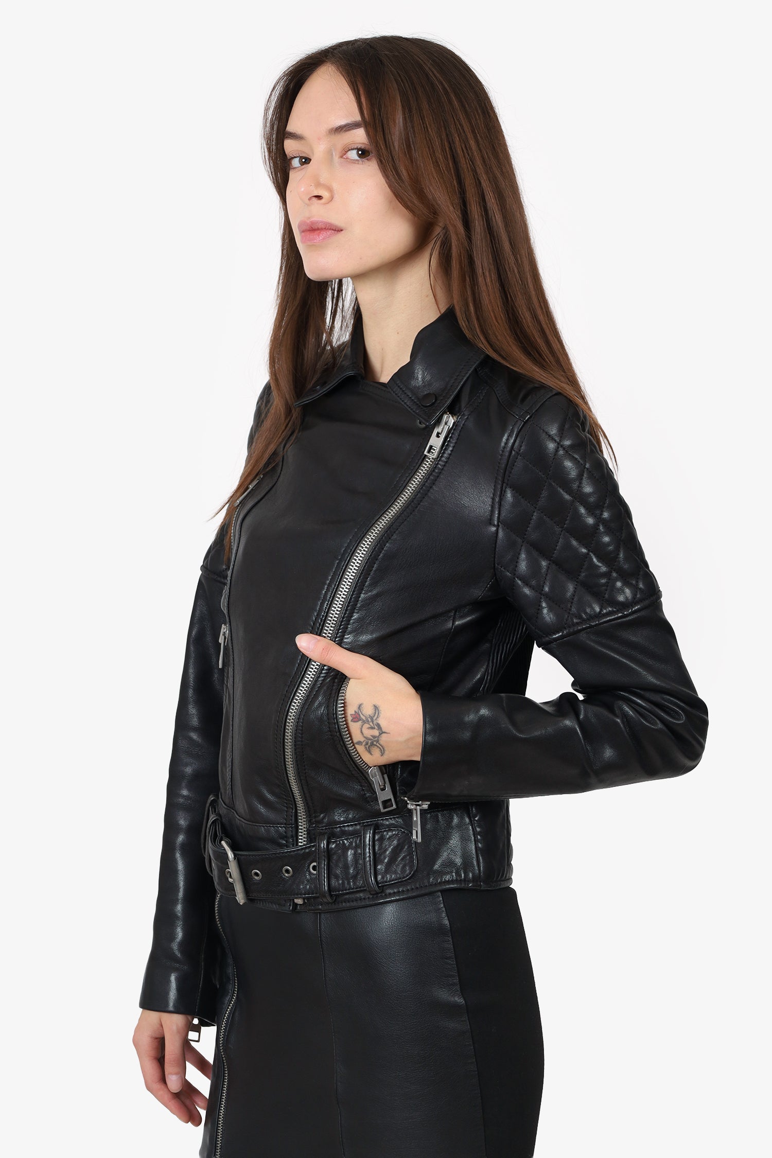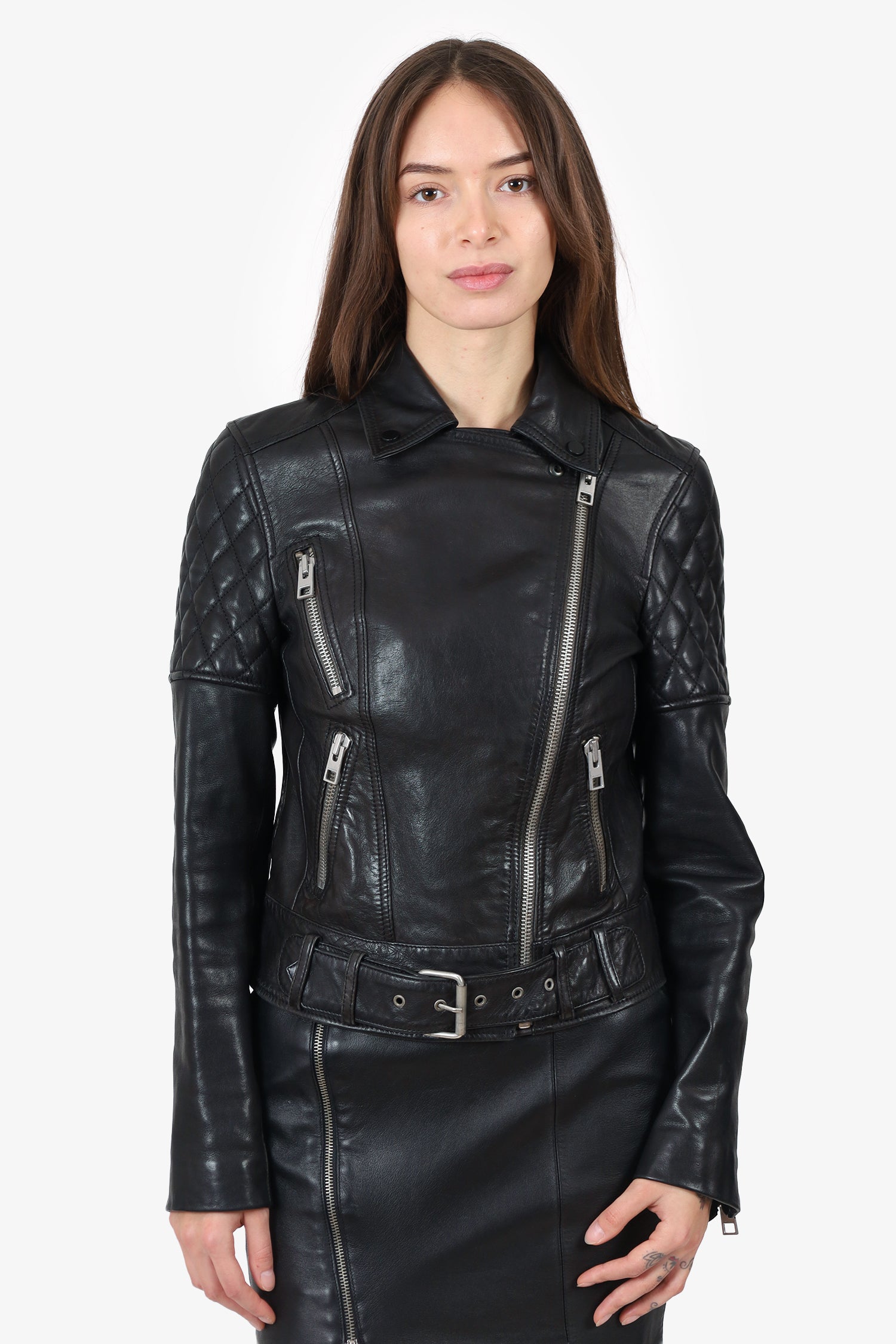 Refresh availabilityAll Saints Black Leather Quilted Biker Jacket. Pull-on. Collared neckline. Front zip-up closure. Adjustable belt to waistline with pull-through buckle closure. Sleeve cuffs with zip-up closure. 3 exterior zip-up pockets; 1 chest, and 2 side. Lined interior. Silver-tone hardware. Tonal stitching.