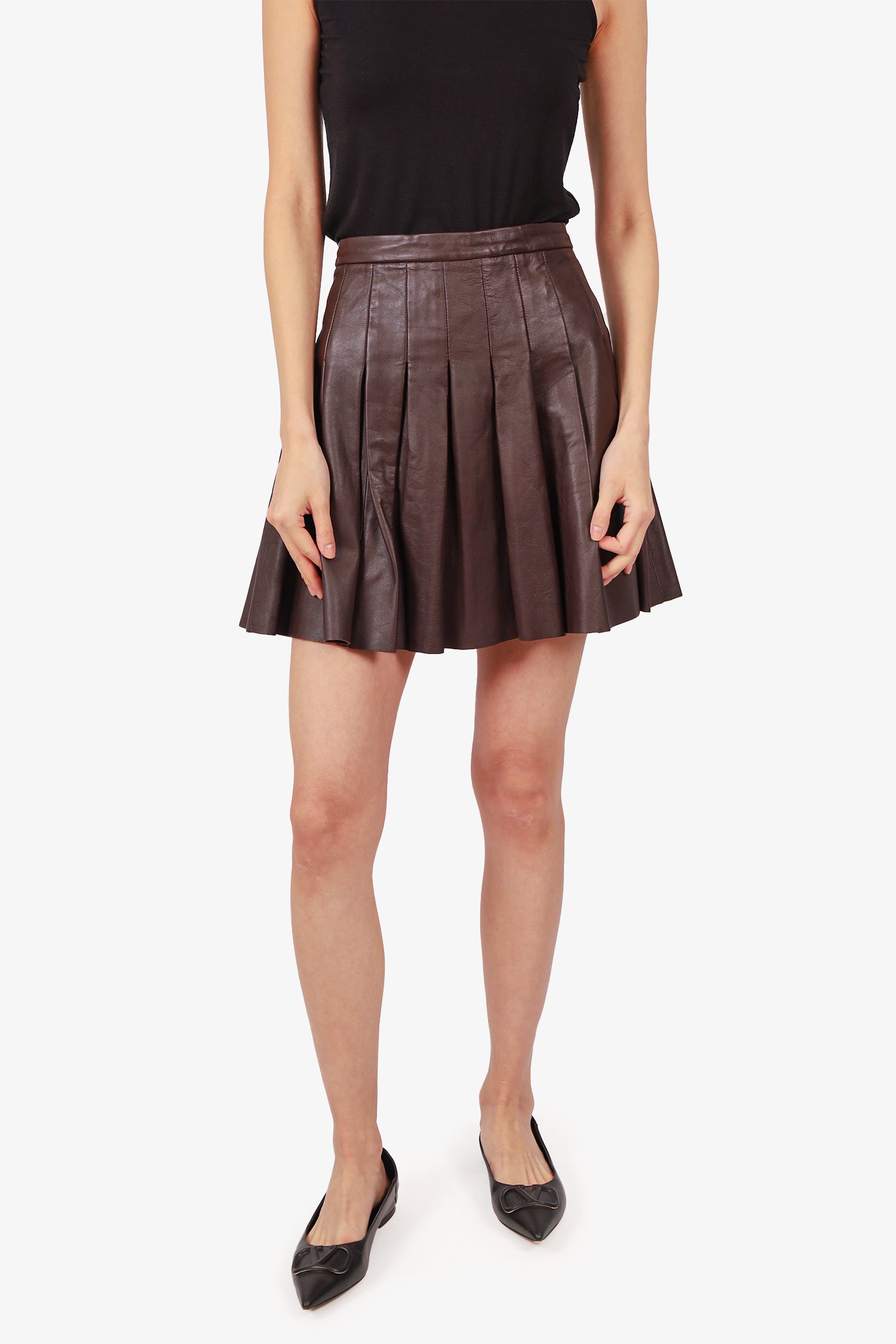 Refresh availabilityAllSaints Brown Leather Pleated Mini Skirt. Slip-on. Rear zip closure. Bottom raw hem. Lined interior. Silver-tone hardware. Tonal stitching.