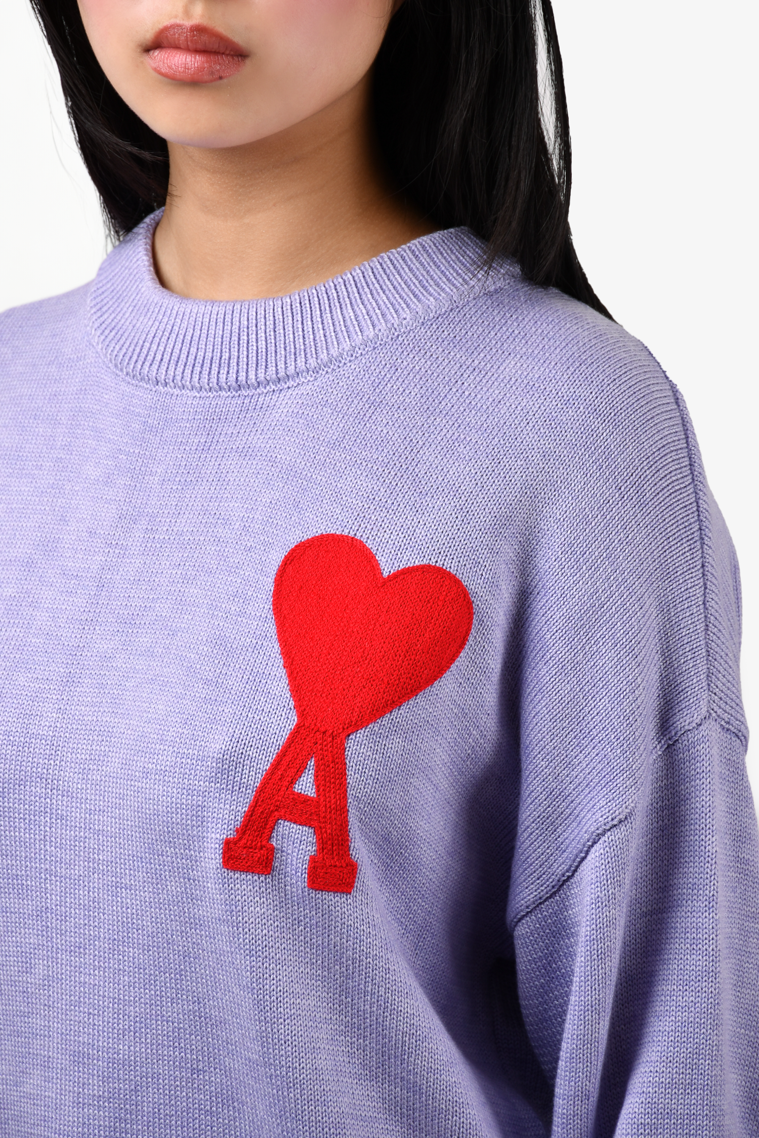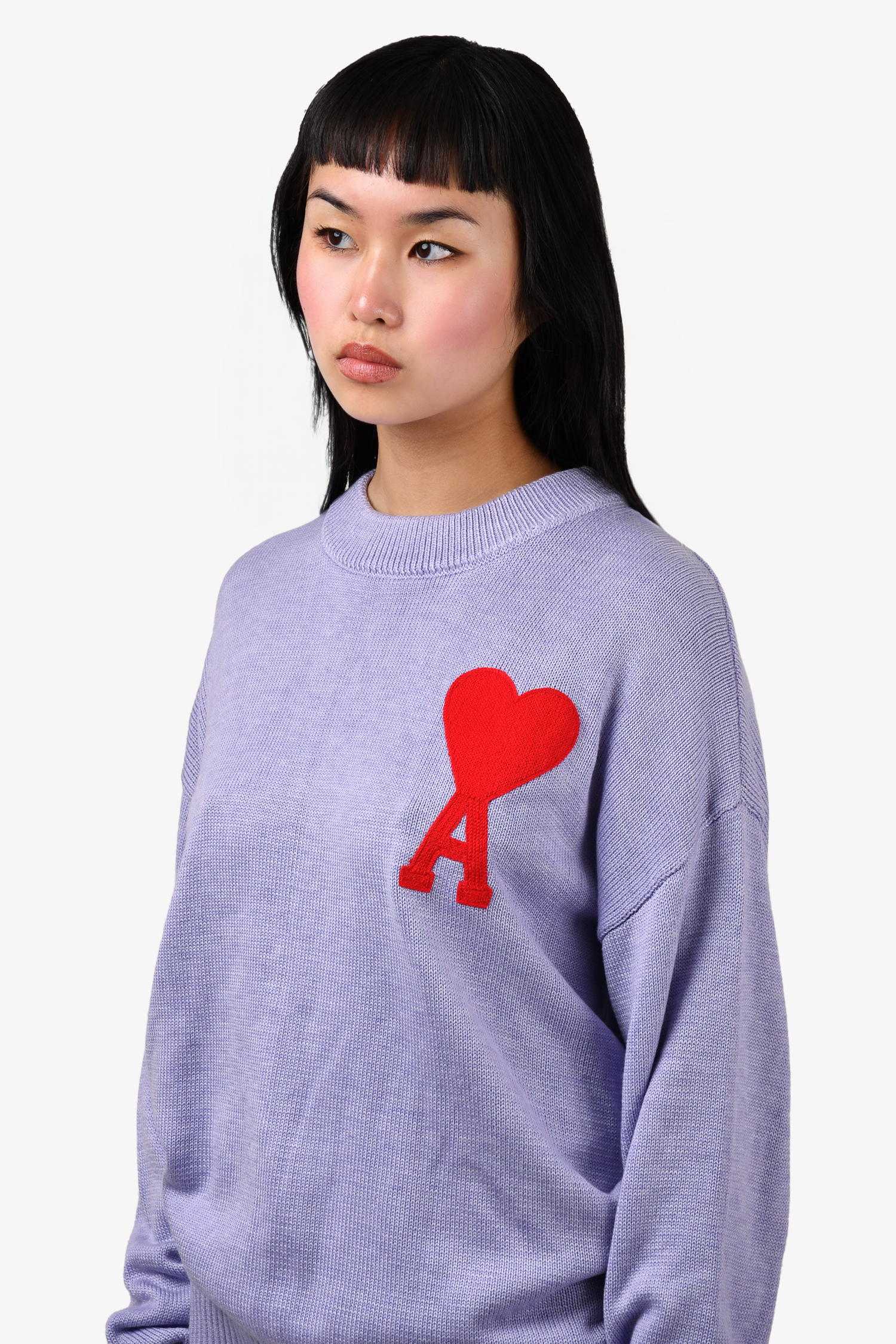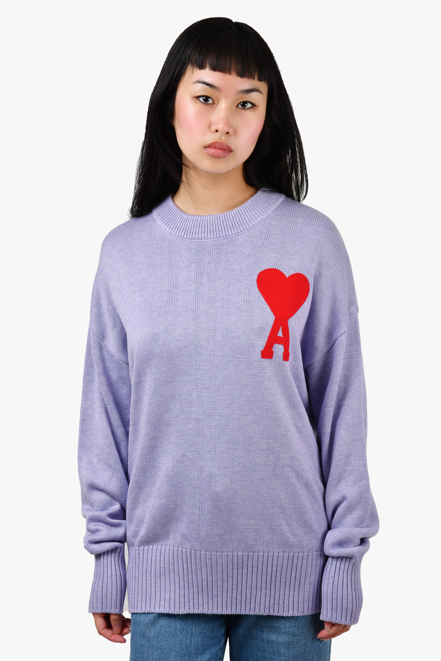 Refresh availabilityAmi Lilac/Red Wool Logo Sweater. Round neck. Pull-on. Ribbed neck, cuffs and hem. Tonal stitching.