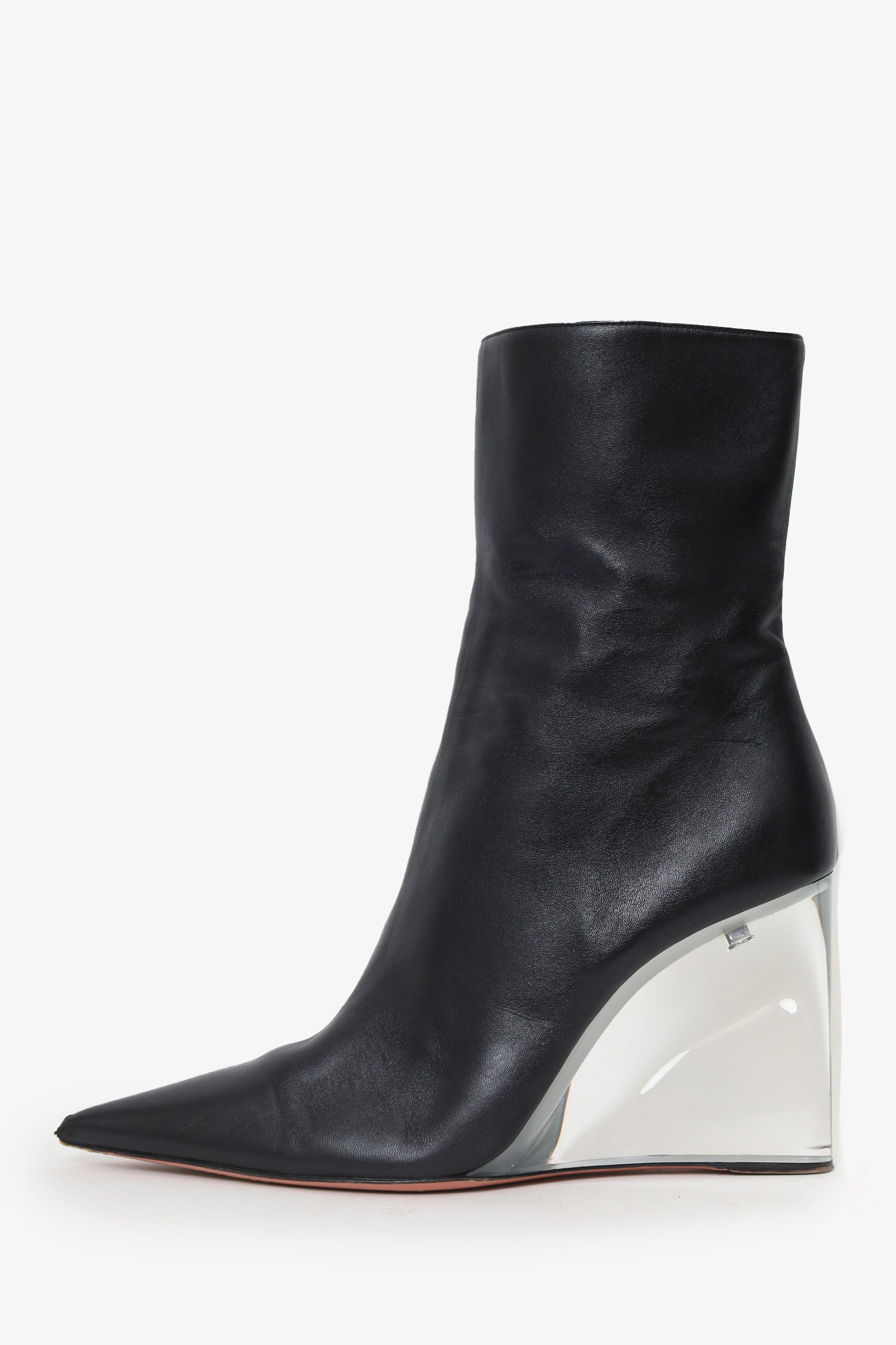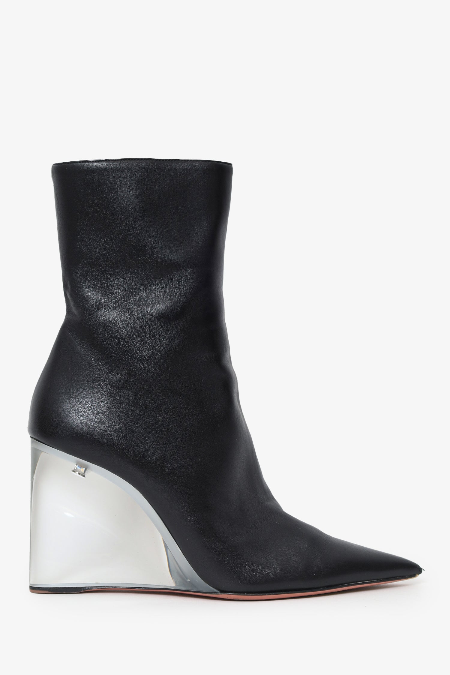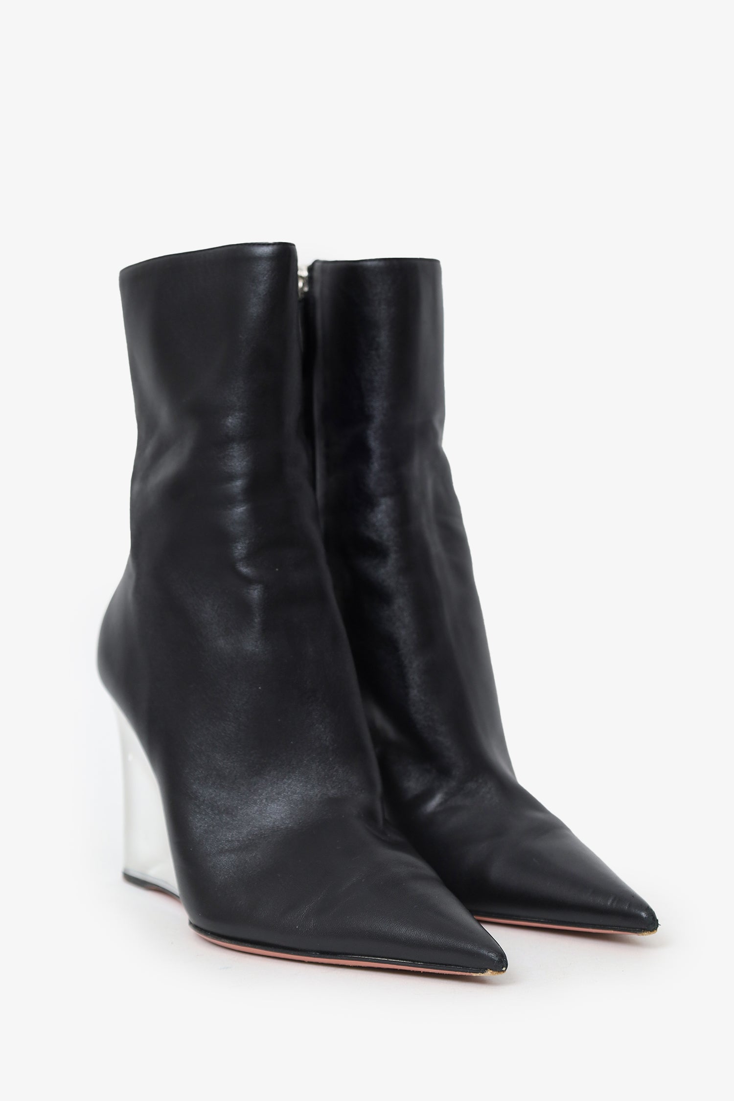 Refresh availabilityAmina Muaddi Black Leather Acrylic Wedge Pointed Boots. Pull-on. Pointed-toe. Side zip closure. Silver-tone hardware. Tonal stitching.